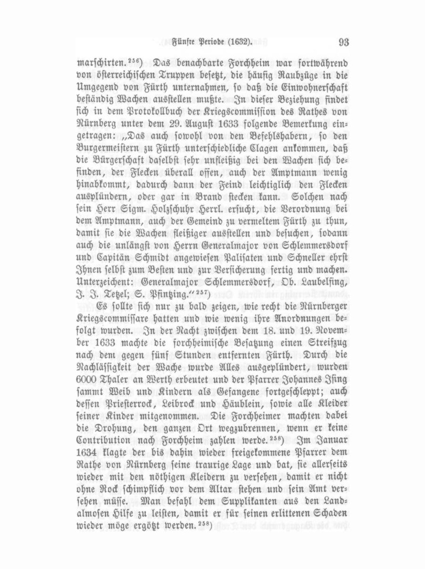 Weimar ernstlich daran, Forchheim zu nehmen und die dortige Besatzung wegen ihrer vielen Plünderungen und Raubausfällen zu züchtigen. Er schickte deshalb den General Kratz mit drei Regimentern an diesen Ort und folgte dann selbst nach. Die Gemeinde in Fürth bat um eine Salveguarde von 20 Pferden „damit sie ruhig in ihrem Orte wohnen und die von Gott bescheerten Feldfrüchte ruhig einernten könne." Graf Kratz schickte 30 Dragoner dahin zur Sicherung der Straßen. Man mußte ihnen alle zehn Tage 106 Gulden Löhnung und 88 Pfund Brod geben. 2") Unterdessen wurde die von den Schweden besetzte Stadt Regensburg von den belagernden österreichischen Truppen mehr und mehr bedrängt, weshalb Bernhard von Weimar den größten Theil seiner Armee gegen die Donau hin führen mußte. Die Belagerung von Forchheim wurde nun zwar vom General Kratz noch fortgesetzt, aber nur sehr mangelhaft, da der Rath von Nürnberg nicht im Stande war, das Belagerungscorps mit Proviant und Munition hinreichend zu unterhalten. Nach dem am 18. Juli erfolgten Falle von Regensburg kamen unter Füh rung des Generalmajors Lars Kagge die schwedischen Truppen, welche die Stadt vertheidigt und guten Akkord erlangt hatten, bei Nürnberg an und wurden am 22. Juli in und um Fürth einquartiert. General Kagge selbst blieb in Nürnberg, wo er in