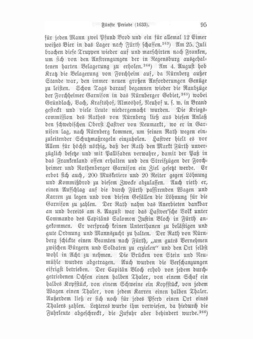 für jeden Mann zwei Pfund Brod und ein für allemal 12 Eimer weißes Bier in das Lager nach Fürth schaffen?") Am 25. Juli brachen diese Truppen wieder auf und marschirten nach Franken, um sich von den Anstrengungen der in Regensburg ausgehal tenen harten Belagerung zu erholen?") Am 4. August hob Kratz die Belagerung von Forchheim auf, da Nürnberg außer Stande war, den immer neuen großen Anforderungen Genüge zu leisten. Schon Tags darauf begannen wieder die Raubzüge der Forchheimer Garnison in das Nürnberger Gebiet?") wobei Gründlach, Vach, Kraftshof, Almoshof, Neuhof u. s. w. in Brand gesteckt und viele Leute niedergemacht wurden. Die Kriegs commission des Rathes von Nürnberg ließ aus diesen Anlaß den schwedischen Oberst Hastver von Neumarkt, wo er in Gar nison lag, nach Nürnberg kommen, um seinen Rath wegen ein zuleitender Schutzmaßregeln einzuholen. Hastver hielt es vor Allem für höchst nöthig, daß der Rath den Markt Fürth unver züglich besetze und mit Pallisaden verwahre, damit der Paß in das Frankenland offen erhalten und den Streifzügen der Forch heimer und Rothenberger Garnison ein Ziel gesetzt werde. Er erbot sich auch, 200 Musketiere und 20 Reiter gegen Löhnung und Kommißbrod zu diesem Zwecke abzulassen. Auch rieth er, einen Aufschlag auf die durch Fürth passirenden Wagen und Karren zu legen und von diesen Gefällen die Löhnung für die Garnison zu zahlen. Der Rath nahm das Anerbieten dankbar au und bereits am 8. August war das Hastver'sche Volk unter Commando des Capitäns Salomon Justin Bloch in Fürth an gekommen. Er versprach keinen Unterthanen zu belästigen und gute Ordnung und Mannszucht zu halten. Der Rath von Nürn berg schickte einen Beamten nach Fürth, „um gutes Vernehmen zwischen Bürgern und Soldaten zu erzielen" und den Ort selbst wohl in Acht zu nehmen. Die Brücken von Stein und Neu mühle wurden abgetragen. Auch wurden die Verschanzungen eifrigst betrieben. Der Capitän Bloch erhob von jedem durch getriebenen Ochsen einen halben Thaler, von einem Schaf ein halbes Kopfstück, von einem Schweine ein Kopfstück, von jedem Wagen einen Thaler, von jedem Karren einen halben Thaler. Außerdem ließ er sich noch für jedes Pferd einen Ort eines Thalers zahlen. Letzteres wurde ihm verwiesen, da hiedurch die Fuhrleute abgeschreckt, die Zufuhr aber behindert wurde?")
