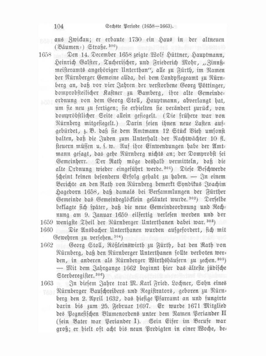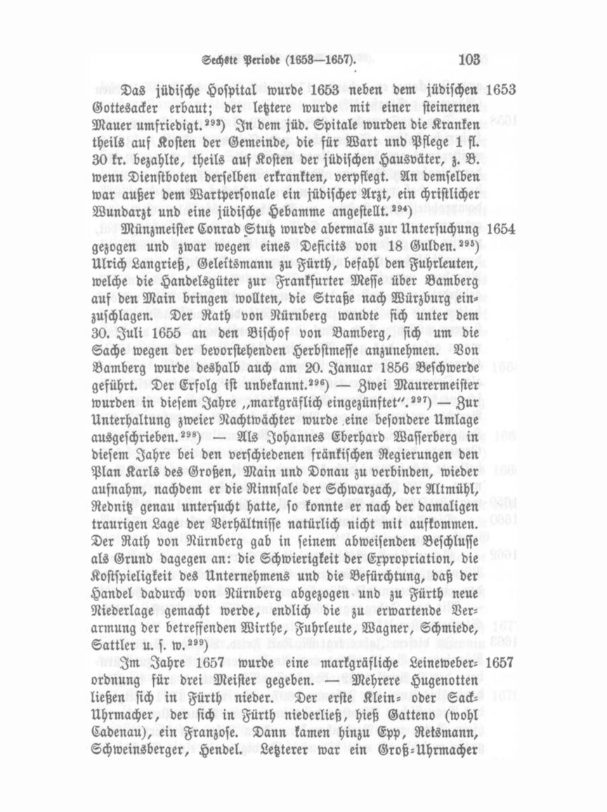 30 kr. bezahlte, theils auf Kosten der jüdischen Hausväter, z. B. wenn Dienstboten derselben erkrankten, verpflegt. An demselben war außer dem Wartpersonale ein jüdischer Arzt, ein christlicher Wundarzt und eine jüdische Hebamme angestellt."«) Münzmeister Conrad Stutz wurde abermals zur Untersuchung 1654 gezogen und zwar wegen eines Deficits von 18 Gulden."°) Ulrich Langrieß, Geleitsmann zu Fürth, befahl den Fuhrleuten, welche die Handelsgüter zur Frankfurter Messe über Bamberg auf den Main bringen wollten, die Straße nach Würzburg ein zuschlagen. Der Rath von Nürnberg wandte sich unter dem 30. Juli 1655 an den Bischof von Bamberg, sich um die Sache wegen der bevorstehenden Herbstmesse anzunehmen. Von Bamberg wurde deshalb auch am 20. Januar 1856 Beschwerde geführt. Der Erfolg ist unbekannt."«) — Zwei Maurermeister wurden in diesem Jahre „markgräflich eingezünftet"."') — Zur Unterhaltung zweier Nachtwächter wurde eine besondere Umlage ausgeschrieben."«) — Als Johannes Eberhard Wasserberg in diesem Jahre bei den verschiedenen fränkischen Regierungen den Plan Karls des Großen, Main und Donau zu verbinden, wieder aufnahm, nachdem er die Rinnsale der Schwarzach, der Altmühl, Rednitz genau untersucht hatte, so konnte er nach der damaligen traurigen Lage der Verhältnisse natürlich nicht mit aufkommen. Der Rath von Nürnberg gab in seinem abweisenden Beschlusse als Grund dagegen an: die Schwierigkeit der Expropriation, die Kostspieligkeit des Unternehmens und die Befürchtung, daß der Handel dadurch von Nürnberg abgezogen und zu Fürth neue Niederlage gemacht werde, endlich die zu erwartende Ver armung der betreffenden Wirthe, Fuhrleute, Wagner, Schmiede, Sattler u. s. w."') Im Jahre 1657 wurde eine markgräfliche Leineweber- 1657 ordnung für drei Meister gegeben. — Mehrere Hugenotten ließen sich in Fürth nieder. Der erste Klein- oder SackUhrmacher, der sich in Fürth niederließ, hieß Gatteno (wohl Cadenau), ein Franzose. Dann kamen hinzu Epp, Retsmann, Schweinsberger, Hendel. Letzterer war ein Groß-Uhrmacher