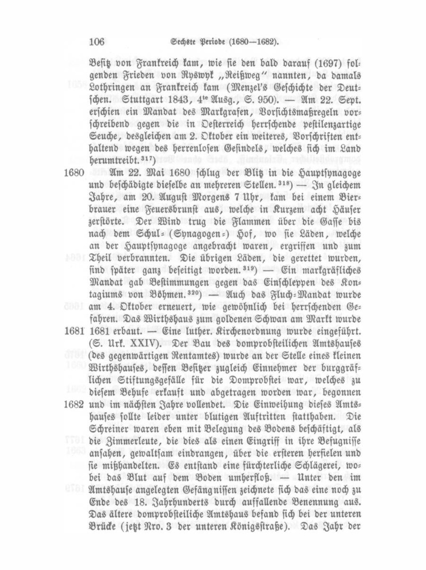 Franz Conrad von Stadion. 3") Unter den Neustädter Amtleuten kommt vor Karl Franz 1677 Freiherr von Pückler, aus Schlesien gebürtig, der die Baronin von Kresser, Besitzerin des Farrnbacher Schlosses, heirathete und nach Fürth zog, später Minister in Bayreuth wurde.'") Der Rath von 'Nürnberg ordnete für den 23. August 1679 1679 'le veurn und Gottesdienst als Dankfest für den wieder her gestellten Frieden (von Nymwegen) an?") „Nimmweg" nannten es damals die Leute, weil bei diesem Frieden Straßburg in den