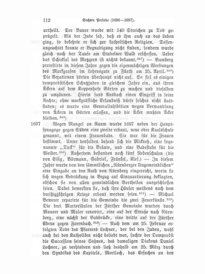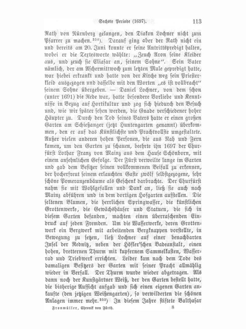 Rath von Nürnberg gelangen, den Diakon Lochner nicht zum Pfarrer zu machen.'"). Darauf ging aber der Rath nicht ein und bereits am 20. Juni konnte er seine Antrittspredigt halten, wobei er die Textesworte wählte: „Zeuch Aron seine Kleider aus, und zeuch sie Eliasar an, seinem Sohne". Sein Vater nämlich, der am Aschermittwoch zum letzten Male gepredigt hatte, war hiebei erkrankt nnd hatte von der Kirche weg sein Priesterkleid ausgezogen und dasselbe mit den Worten „es ist vollbracht" seinem Sohne übergeben. — Daniel Lochner, von dem schon (unter 1691) die Rede war, hatte besondere Vorliebe und Kennt nisse in Bezug auf Hortikultur und zog sich hiedurch den Besuch nnd, wie wir später sehen werden, die Gnade verschiedener hoher Häupter zu. Durch den Tod seines Vaters hatte er einen großen Garten am Schießanger (jetzt Huntengarten genannt) überkom men, den er auf das Künstlichste und Prachtvollste umgestaltete. Außer vielen anderen hohen Personen, die aus Nah und Fern kamen, um den Garten zu schauen, beehrte ihn 1697 der Chur fürst Lothar Franz von Mainz aus dem Hause Schönborn, mit einem ansehnlichen Gefolge. Der Fürst verweilte lange im Garten und gab dem Besitzer seinen vollkommenen Beifall zu erkennen, der hocherfreut seinem erlauchten Gaste zwölf selbstgezogene, sehr schöne Pomeranzenbäume als Geschenk darbrachte. Der Churfürst nahm sie mit Wohlgefallen und Dank an, ließ sie auch nach Mainz abführen nnd in dem dortigen Hofgarten aufstellen. Die seltenen Blumen, die herrlichen Springwasser, die künstlichen Grottenwerke, die Gewächshäuser und Statuen, die sich in diesem Garten befanden, machten einen überraschenden Ein druck auf jeden Fremden. Um die Wasserwerke, deren Grotten werk ein Bergwerk mit arbeitenden Bergknappen vorstellte, in Bewegung zu setzen, ließ Lochner auf einer benachbarten Insel der Rednitz, neben der Höfler'schen Badeanstalt, einen hohen, bretternen Thurm mit kupfernem Sammelkasten, Wasser rad nnd Triebwerk errichten. Leider kam nach dem Tode des damaligen Besitzers der Garten mit seiner Pracht allmählig wieder in Verfall. Der Thurm wurde wieder abgetragen. Als dann noch der Kunstgärtner Weiß, der den Garten bestellt hatte, die bisherige Aufsicht aufgab und sich einen eigenen Garten an kaufte (den jetzigen Weißengarten), so verwilderten die schönen Anlagen immer mehr.'") In diesem Jahre stiftete Balthasar Fronmüller, Chronik von Fürth.