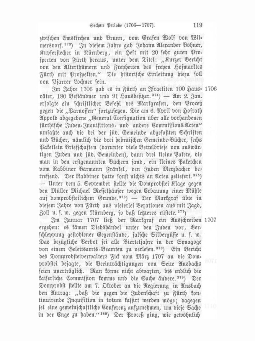 Elkana Fränkel, der als Fürther Parnoß einen Gehalt von 200 Gulden bezogen hatte, wurde 1708 Oberparnoß in Ansbach und immer einflußreicher bei dem Markgrafen?") Im Oktober dieses Jahres starb der Rabbiner zu Fürth, Samuel Bärmann, Sohn des Seckel Fränkel, Vetter, aber Gegner des Elkana Fränkel.'") — Um diese Zeit lebte ein vr. weck. Johann Samuel Schoder dahier.'") — Nachdem schon lange Zeit im Ansbacher Fürstenthume laute Klagen über den Wucher der