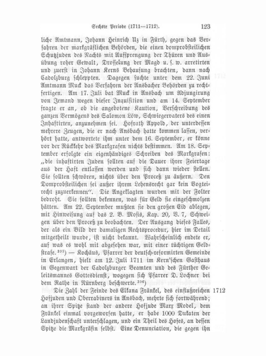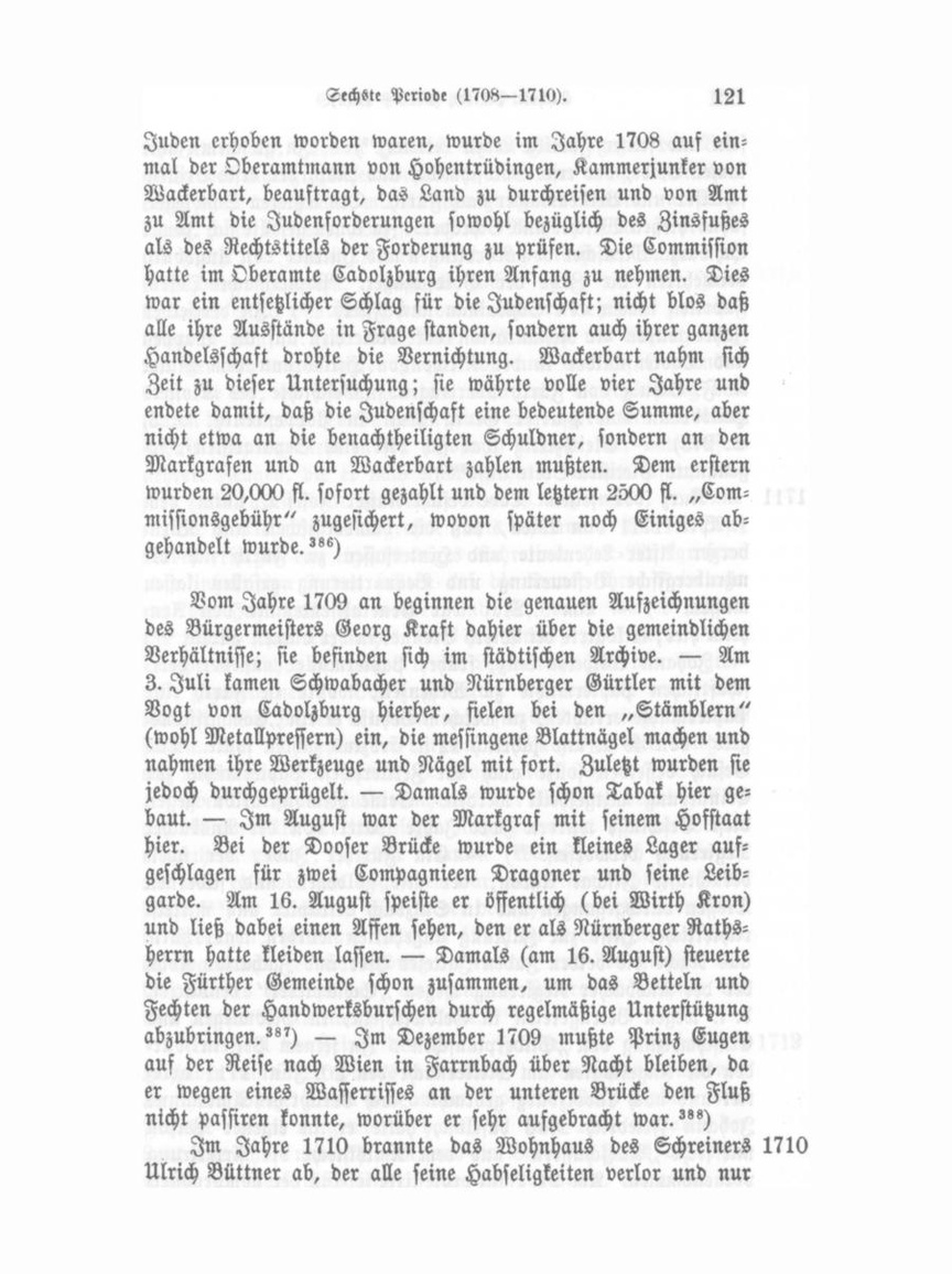 sein und seiner Familie Leben rettete?") — In gleichem Jahre kamen Velde, der erste Goldschmidt, und May, der erste Brillen schleifer und Brillenmacher nach Fürth. Des letzteren Schwieger söhne hießen Weiche! und Schröder. Zu ihnen gesellte sich Jonas Schwarz. Meuschel von Nördlingen und Hüttner von Augsburg vermehrten die Zahl der Goldschläger. Papiermachee-DosenFabriken kamen von Schweinau nach Fürth.In demselben Jahre wurde die Restauration der Malereien auf die Wappen und Todtenschilder in der Kirche von Heilsbronn dem Maler K. F. Schulz von Fürth übertragen. (Geschichte des Klosters Heilsbronn von Pfarrer Georg Muck in Poppenreuth, B. 3, S. 273). — Gleichzeitig that sich hier eine Separatisten-, so genannte Pietisten-Secte auf.'") 1711 Kurz vor seinem Tode befahl Kaiser Josef I. unter dem 1. April 1711 von Wien, daß die bambergischen und Nürn berger After-Lehenleute und Hintersassen zu Fürth sich die nürnbergische Besteuerung und Bequartierung gefallen lasten müssen."?) — Am 9. Mai war Generallieutenant von Arn heim hier; er logirte bei Wirth Brenner in der blauen Glocke. "°) — Johann Wilhelm Lenz, früher Papiermüller auf der herr schaftlichen Papiermühle zu Weyenzell, wollte in Fürth eine Papiermühle errichten, zu welchem Behufe er ein „Commissions geld" von 40 fl. und jährlich 12 fl. Erbzins zahlen sollte. Das Gesuch desselben sollte auch der Zettlerschen Papiermühle zur Erinnerung mitgetheilt werden. Seine Remonstration gegen diese Beschlüsse wurden zwei Jahre später von der Ansbacher Regierung verworfen.'") — Ein Fürther Jude, der übel berüchtigte Jischai Aaron, der mit goldenen und silbernen Tressen durchgegangen und in Sulzbach attrapirt und mittelst richterlicher Hilfe zur Zahlung angehalten worden war, hatte aus Rache die beiden Juden Jaiteles Beer und Zacharias Kohn bei der Ansbacher Regierung wegen „Schneplerei" denuncirt, d. i. wegen Betrügereien in Geldwechseln, in Geldwiegen und Einschmelzung von „Silberplanschen". In seinem Beisein wur den die Angeklagten um Mitternacht den 20. Juni 1711 arretirt und nach Cadolzburg gebracht. Nach Bericht des Amtmanns Johann Friedrich Muck daselbst, hatte er in eigener Person mit sechs „Ausschüssern" und dem Amtsknecht die Arretirung vorgenommen. Am 21. Juni protestirte sodann der domprobstei-
