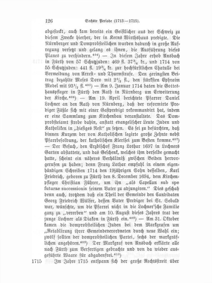 — In diesem Jahre begann die Erbauung der sogenannten alt-neuen (jetzt Bäumen-) früher auch Karolinen-Straße genannt."-) Im Jahre 1716 sind zwischen 350—400 steuerbare jüdische 1716 Familienväter aufgeführt. Aus diesem Verzeichniß ist ersichtlich, daß aus allen Gegenden Deutschlands Juden nach Fürth ge zogen waren, so aus Frankfurt, Mainz, Hamburg, Wien, Prag und Naumburg."-) — Der Markgraf hielt sich 1717 mehrfach in Fürth auf; er wohnte damals im Kern'schen Gasthaus. Am 15. März besuchte er den Pfarrer Lochner in seinem Garten, wo er dessen Pomeranzenhaus und Winterung besah.-") Das für Ansbach sehr ungünstige Urtheil des Reichshof- 1717 rathes kam im Jahre 1717 zur Ausführung, und zwar unter dem Namen Executions-Receß. Die bevollmächtigten kaiserlichen Hofräthe, sowie die bevollmächtigten Bamberger und Ansbacher Deputirten unterzeichneten zu Fürth am 29. Oktober dieses Aktenstück. Die Aufsicht über den richtigen Vollzug wurde dem Churfürsten von Bayern und dem Herzog von Sachsen-Gotha übertragen. Der Domprobst erhielt die Vogteirechte, das Recht Handwerke aufzurichten und ihnen Satzungen zu ertheilen, den Kirchweihschutz, die Abstrafung der Frevelfälle, den Brückenzoll, Befreiung der domprobsteilichen Schutzjuden vom Leibzoll, Zoll freiheit für die in Fürth verfertigten Fabrikate, das Vogteirecht über die auf den ehemaligen Kampfgerichtsplätzen erbauten Häuser u. s. w. Brandenburg soll dagegen Zoll und Geleits zoll erhalten, sowie die Vogteirechte in den Ansbacher Lehens häusern und Grundstücken innerhalb „den Eiteren