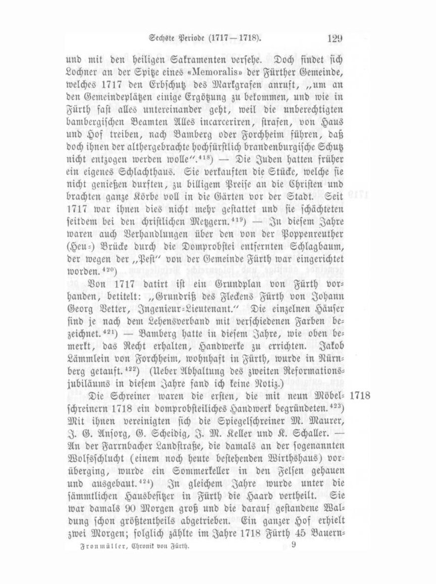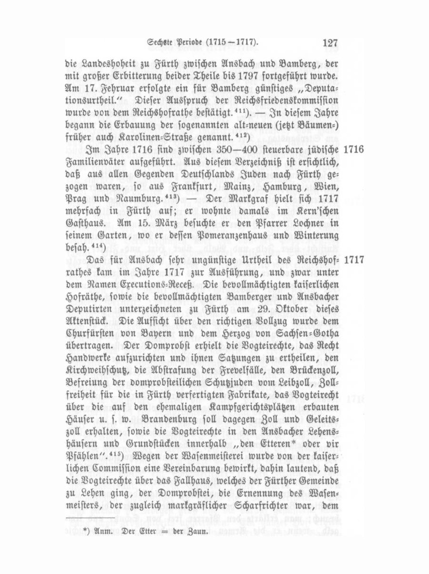 Markgrafen zustehen soll?") Den ansbachischen Schutzverwandten wurde das Gemeinderecht zugestanden und die Zahl der Bürger meister wurde um vier vermehrt, worunter zwei ansbachische. Von den acht Bürgermeistern traten jährlich vier ab und wurden durch vier neue ersetzt. Die Wahl geschah gewöhnlich im domprobsteilichen Amtshaus. Die Gemeinde versammelte sich daselbst am Stephanstag. Der abgehende Bürgermeister übergab seine Rechnung einige Tage vorher dem Amtmann der Domprobstei zur Revision, jedoch ohne Belege. Sie wurde in der Gemeinde versammlung vorgelesen und sodann zur Wahl geschritten. Die Gerichtsschöppen schlugen nrit Zuziehung der Bürgermeister Can didaten vor, die Gemeinde aber wühlte. Jeder der Bürger meister erhielt eine bestimmte Verrichtung. Der älteste der domprobsteilichen Bürgermeister führte gewöhnlich mit einem „Beisitz-Bürgermeister" die Kasse. Das Pfandamt hatte die Aufsicht über Feld und Wald, über Hirt und Flurer; das Botenamt war in Kriegszeiten thätig, das Wachtamt besorgte die Visitation der Wache, die aus einem Wachtschreiber, acht Stillwächtern und zwei Nachtwächtern bestand; das Bauamt beaufsichtigte Brücken und Stege, Pflaster, Wasserschäden; es hatte ein Budget von 6 — 800 fl.; das Spitalamt hatte das Armenhaus zu besorgen, das zugleich höchst nothdürftige Ver sorgung für einige Kranke bot. Bei wichtigen Angelegenheiten wurden die sechs Gerichtsschöppen und die 16 Vorsteher, welche seit 1700 eingeführt waren, beigezogen. Eine solche Versamm lung wurde Vorstehers-Gemein genannt. Die Angelegenheiten wurden sodann der ganzen Gemeinde vorgelegt, wobei der Gemeindeschreiber das Protokoll führte. Vorher wurde mit dem Konsulenten zu Rathe gegangen. Solche Versammlungen wnrden in dem Hause des Rechnungsbürgermeisters, der 50 fl. Zimmergeld erhielt und auf dem Gemeindehaus, welches zugleich als Schießhaus benützt wurde, gehalten."?) — Der Fürther Pfarrer ging früher zu allen Gemeinde- und Schutzversammlungen und bezahlte aus seinem Pfarrlehen Gemeindeumgeld und Schutz haber, wenigstens für seine Person, wofür er auch vom Domprobstei-Amtmann zur „Schutzgastung" eingeladen wurde. Ein günstiger Vergleich mit den Bürgermeistern änderte diesen Ge brauch; man erklärte den Pfarrer frei von Schutz- und Um geld, wenn er die Armen im Armenhause umsonst besuchte
