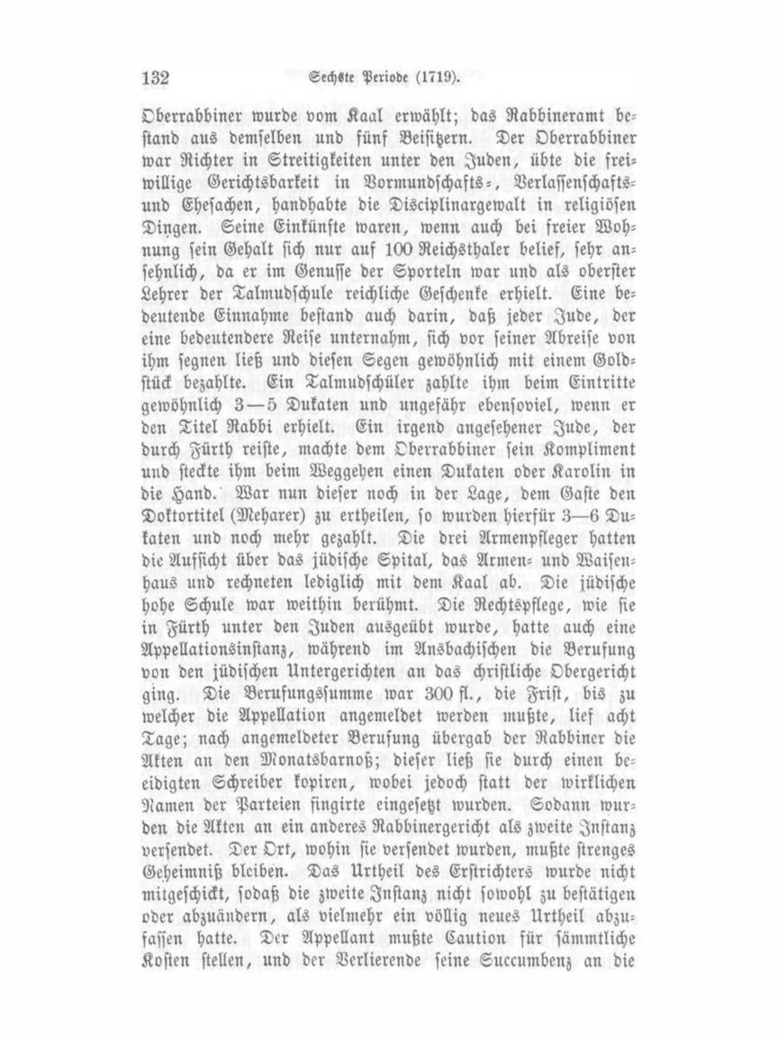 gewöhnlich 3 — 5 Dukaten und ungefähr ebensoviel, wenn er den Titel Rabbi erhielt. Ein irgend angesehener Jude, der durch Fürth reiste, machte dem Oberrabbiner sein Kompliment und steckte ihm beim Weggehen einen Dukaten oder Karolin in die Hand. War nun dieser noch in der Lage, dem Gaste den Doktortitel (Meharer) zu ertheilen, so wurden hierfür 3—6 Du katen und noch mehr gezahlt. Die drei Armenpfleger hatten die Aufsicht über das jüdische Spital, das Armen- und Waisen haus und rechneten lediglich mit dem Kaal ab. Die jüdische hohe Schule war weithin berühmt. Die Rechtspflege, wie sie in Fürth unter den Juden ausgeübt wurde, hatte auch eine Appellationsinstanz, während im Ansbachischen die Berufung von den jüdischen Untergerichten an das christliche Obergericht ging. Die Berufungssumme war 300 fl., die Frist, bis zu welcher die Appellation angemeldet werden mußte, lief acht Tage; nach angemeldeter Berufung übergab der Rabbiner die Akten an den Monatsbarnoß; dieser ließ sie durch einen be eidigten Schreiber kopiren, wobei jedoch statt der wirklichen Namen der Parteien fingirte eingesetzt wurden. Sodann wur den die Akten an ein anderes Rabbinergericht als zweite Instanz versendet. Der Ort, wohin sie versendet wurden, mußte strenges Geheimniß bleiben. Das Urtheil des Erstrichters wurde nicht mitgeschickt, sodaß die zweite Instanz nicht sowohl zu bestätigen oder abzuändern, als vielmehr ein völlig neues Urtheil abzusassen hatte. Der Appellant mußte Kaution für sämmtliche Kosten stellen, und der Verlierende seine Succumbenz an die