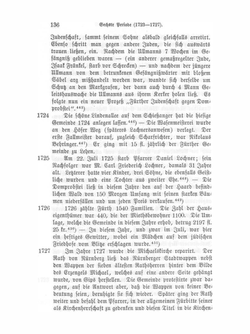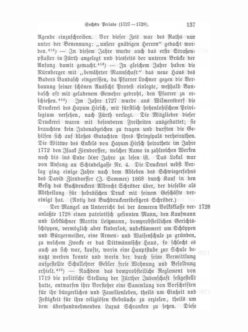 Agende einzuschreiben. Vor dieser Zeit war des Raths nur unter der Benennung: „unsere gnädigen Herren" gedacht worden. 452) — In diesem Jahre wurde auch das erste Straßenpflaster in Fürth angelegt nnd diesseits der unteren Brücke der Anfang damit gemacht. 453) — In gleichem Jahre haben die Nürnberger mit „bewährter Mannschaft" das neue Haus des Baders Bandasch eingerissen, da Pfarrer Lochner gegen die Verbaunng seiner schönen Aussicht Protest einlegte, weßhalb Bandasch oft mit geladenem Gewehre gedroht, den Pfarrer zu erschießen. 454) Im Jahre 1727 wurde aus Wilmersdorf die Druckerei des Hayum Hirsch, mit fürstlich hohenlohischem Privilegium versehen, nach Fürth verlegt. Die Mitglieder dieser Druckerei waren mit besonderen Freiheiten ausgestattet; sie brauchten kein Judenabzeichen zu tragen und durften die Gehilfen sich auf bloßes Gutachten ihres Prinzipals verheirathen.
