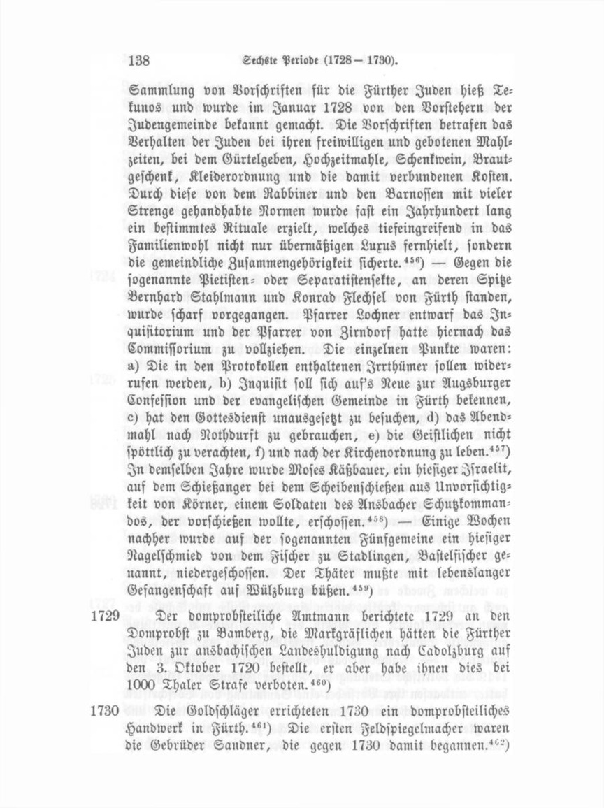 Der Mangel an Unterricht bei der ärmeren Volksklasse veranlaßte 1728 einen patriotisch gesinnten Mann, den Kaufmann und Lebküchner Martin Leitzmann, domprobsteilichen Gerichtsschöppen, vermöglich aber kinderlos, unbekümmert um Schöppen und Bürgermeister, eine Armen- und Waisenschule zu gründen, zu welchem Zwecke er das Dittmännische Haus, so schlecht es auch an sich war, kaufte, worin eine Hauptstube zur Schule benutzt werden konnte und worin der durch seine Vermittlung aufgestellte Schullehrer Gebler freie Wohnung und Besoldung erhielt. 455) — Nachdem das domprobsteiliche Reglement von 1719 die politische Stellung der Fürther Judenschaft festgestellt hatte, entwarfen ihre Vorsteher eine Sammlung von Vorschriften für ihr bürgerliches und Familienleben, theils um Einheit und Festigkeit für ihre religiösen Gebräuche zu erzielen, theils um dem überhandnehmenden Luxus Schranken zu setzen. Diese
