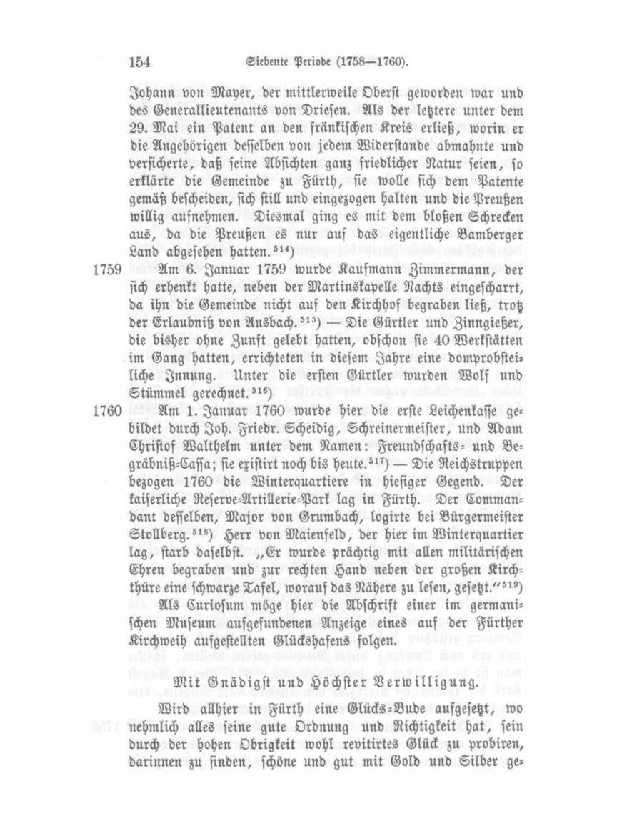 Feldt manche Diebstäle gethan den Strang Verdient, ist alß der Pfahl bey den Bettelhüttlein oberhalb Fürth gesezt worden Ist aber von Gemeints wegen verketten worden als er eben aufgehenkt solt werden im geschloßenen Creis Parton erhalten sein Nahme war Caspar Bauer von Würzburg? — Den 4. Juny hat sich ein .großer Streit begeben zwischen der Statt Nürnberg und dem H. Marggrafen wegen einer Hochzeit in Poppenreuth, die Fürther Musikanten haben in der Kirche spillen wollen und die Nürnbergs auch; beede Comando welche zugegen waren kämmen mit Schlagen Hauen hintereinander daß etl. Nürnberger Einspäniger Verwundet worden über Händ und