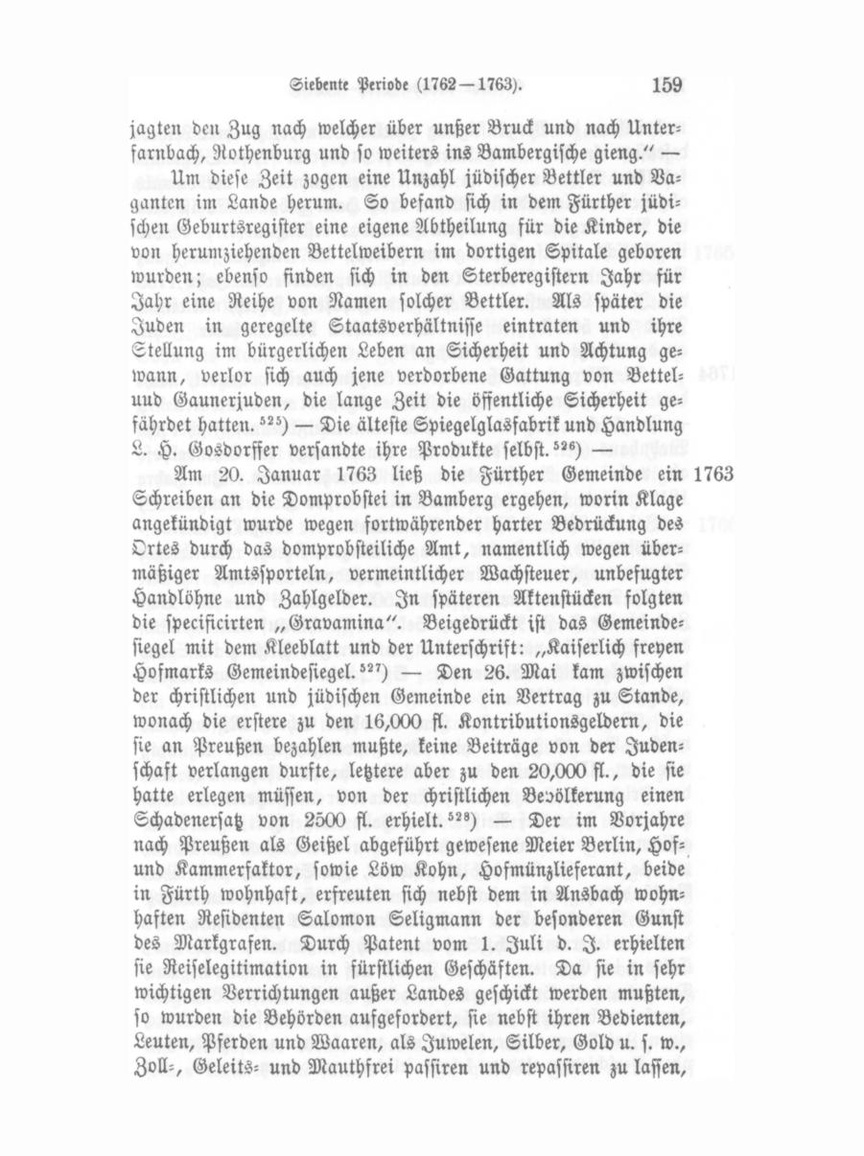wobei ihnen die Vergünstigung zuerkannt wurde, zu ihrer Leibes defension ein Ober - und Untergewehr zu führen."») — Siegellakfabrikant Ohmann hat im Herbst dieses Jahres in der damals abgesteckten Alexanderstraße das erste Haus gebaut. Es ist dies von Nürnberg her zur rechten Hand das erste Haus."°) — Die israelitische Waisenstiftung in Fürth, die einzige für ganz Bayern und die älteste in Deutschland, wurde im Jahr 1763 von Israel Lichtenstadt aus Prag, wohnhaft zu Fürth, mit einem Fond von 500 fl. gestiftet. Der Stifter blieb mehrere Jahre an der Spitze der Verwaltung. "*) — 1764 Die Alexanderstraße wurde 1764 zum Theile vollendet, nach dem im Vorjahre die nöthigen Plätze abgesteckt worden waren. — In gleichem Jahre brannte das Branntweinbrenner Fischer'sche Wohnhaus (Nr. 197 der älteren Eintheilung) im Schindelhofe ab, wobei die Nachbarhäuser sehr bedroht waren. Im Jahre 1819 gehörte dieses Haus dem Melbermeister I. M. Dengler."^) — Johann Michael Weißel, Stammvater der Weißel'schen Kaus mannsfamilie, Gastgeber zum schwarzen Kreuz, Nürnberger Schutzverwandter und einer der Schuladministratoren, schenkte am 22. Dezember dem Schulfonde 500 Gulden. — Um diese Zeit schrieb F. F. Neudecker, Sekretär (wohl auf dem Geleits