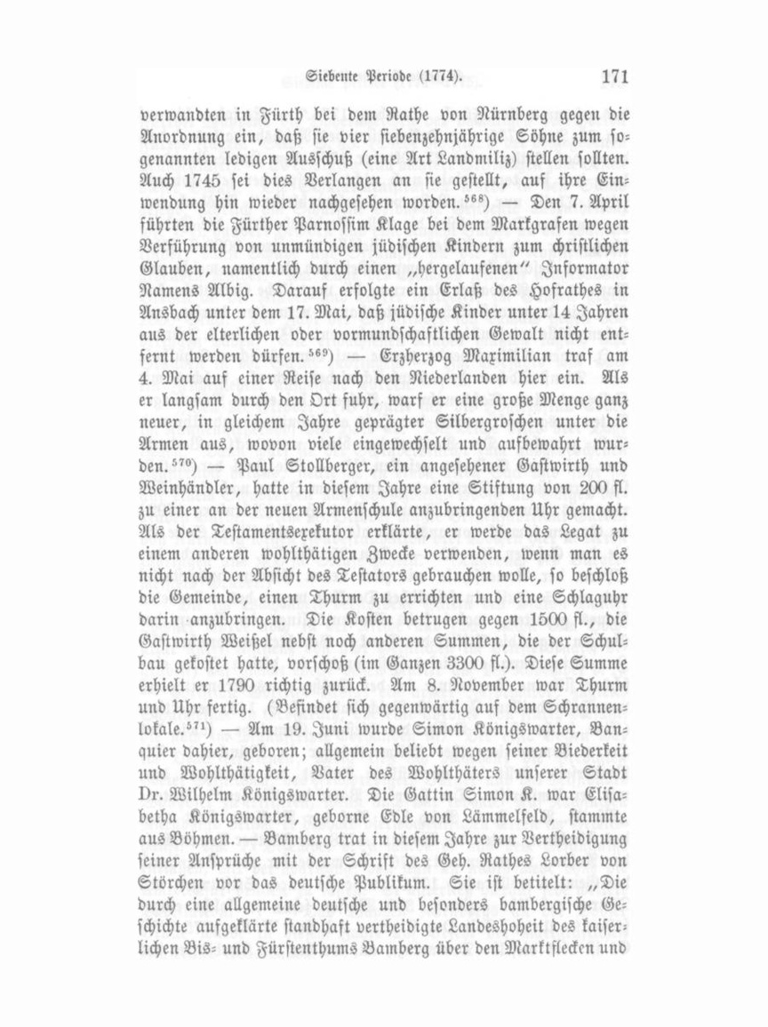 es in der Nacht starb. Die Leute wurden gebunden nach Cadolzburg abgeführt und dort eingekerkert. °") Zu Ende des Jahres ließ die Theuerung nach. Den 7pfündigen Laib bekam man nun um 20 Kreuzer; es hörten alle Sperren auf. Hier und in anderen Gegenden waren reiche Ernten. 1773 Im Jahre 1773 predigte wieder der berühmte Missionär Schulz und dessen Gefährte Wollersdorf in Fürth."«) — Am 5. März wurden zwei hiesige Einwohner in einer Sandgrube am Farrnbacher Wege verschüttet. Die Frau wurde todt heraus gegraben; der Mann starb erst am neunten Tage unter vielen Leiden. — Das Wohnhaus des Manufacturhändlers Seifert in der Nürnberger Straße (später dem Gürtlermeister Schreiber gehörig, neben Zapf jetzt Hausnummer 56 der Königstr.) brannte am 22. April früh 3 Uhr ganz ab. Ein Mann Namens Bölian rettete sich durch einen Sprung aus dem zweiten Stock. Aus der Brandkasse erhielt Seifert 3500 fl."°) — Zur Kirchweih zeit kam es wieder zu einem Handgemenge zwischen markgräf lichen und Bamberger Soldaten. Der Oberamtsarzt Dr. Panzer mußte die Verwundeten beschauen. Der domprobsteiliche Amt mann und Amtsknecht wurden deshalb von den Markgräflichen verhaftet."°) Die Vexationen und Bedrängungen der Juden von Seite der Reichsstadt waren um diese Zeit sehr bedeutend. Hatte ein Jude daselbst ein Geschäft, so fand er nur bei den Spittler- und Thiergärtnerthor Einlaß, wogegen er 45 Kr. an den Stadtpfänder, dann 15 Kr. für die Begleitung, die ihn nie verließ, bezahlen mußte. An Sonn- und Festtagen, sowie in der Charwoche blieb Nürnberg den Juden unbedingt ver schlossen; auf dem öffentlichen Markte, welcher täglich abgehalten wurde, durfte er nie sichtbar werden, in keinem Hause eines Christen ein Gewölbe oder Comptoir zu Geschäften benützen, viel weniger eine Niederlage halten unter Vermeidung der Confiskation seiner Waare, er durfte nie in Nürnberg übernachten ; jeder Wechsel, welcher ausgestellt werden sollte, mußte, wenn er gültig sein sollte, von einem Rechtskundigen unter Zuziehung eines Sensales gefertigt werden und auf bestimmte bancomäßige Geldsorten lauten, wie überhaupt sämmtliche von Nürnberg ausgegebene wechselrechtliche Bestimmungen überall lästige Be schränkungen für die Juden enthielten."?) 1774 Am 31. Januar 1774 kamen die Nürnberger Schutz