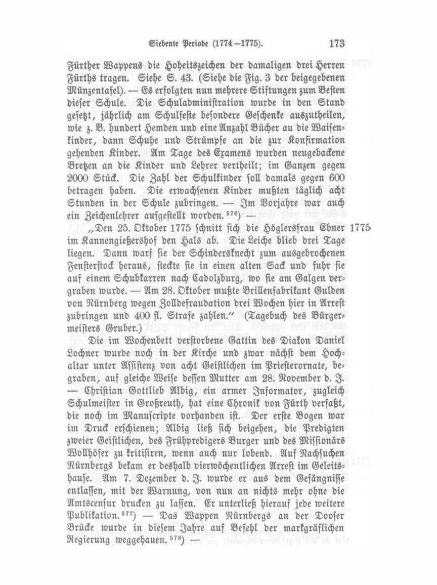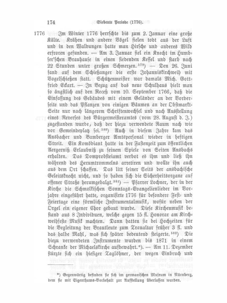 Im Winter 1776 herrschte bis zum 2. Januar eine große Kälte. Krähen und andere Vögel fielen todt aus der Luft und in den Waldungen hatte man Hirsche und anderes Wild erfroren gefunden. — Am 3. Januar fiel ein Knecht im Humbser'schen Brauhause in einen siedenden Kessel und starb nach 22 Stunden unter großen Schmerzen."") — Den 26. Juni fand auf dem Schießanger die erste Johanniskirchweih mit Vogelschießen statt. Schützenmeister war damals Mich. Gott fried Eckart. — In Bezug auf das neue Schulhaus hielt man so ängstlich auf den Receß vom 10. September 1766, daß die Einfassung des Gebäudes mit einem Geländer an der Vorder seite und das Pflanzen von einigen Bäumen an der ObstmarktSeite nur nach längerem Schriftenwechsel und nach Ausstellung eines Reverses des Bürgermeisteramtes (vom 28. August d. I.) zugestanden wurde, daß der hiezu verwendete Raum nach wie vor Gemeindeplatz sei."») Auch in diesem Jahre kam das Ansbacher und Bamberger Amtspersonal wieder in heftigen Streit. Ein Komödiant hatte in der Fastenzeit zum öffentlichen Aergerniß Erlaubniß zu seinem Spiele von Seiten Ansbachs erhalten. Das Domprobsteiamt verbot es ihm und ließ ihn während des Herumtrommelns arretiren und wollte ihn auch aus dem Ort schaffen. Das litt seiner Seits der ansbachische Geleitsknecht nicht, und so haben sich die Sicherheitsorgane auf offener Straße herumgebalgt."') — Pfarrer Lochner, der in der Kirche die Schmolkischen Sonntags-Evangelienlieder im Vor jahre eingeführt hatte, organisirte 1776 für besondere Fest- und Feiertage eine förmliche Instrumentalmusik, wofür neben der Orgel ein eigener Chor gebaut wurde. Diese Kirchenmusik be stand aus 8 Individuen, welche gegen 15 fl. Honorar am Kirch weihfeste Musik machten. Dann hatten sie bei Hochzeiten für die Begleitung der Brautleute zum Traualtar früher 3 fl. und das halbe Mahl, was sich später bedeutend steigerte."") Die hiezu verwendeten Instrumente wurden bis 1871 in einem Schranke der Michaelskirche aufbewahrt.