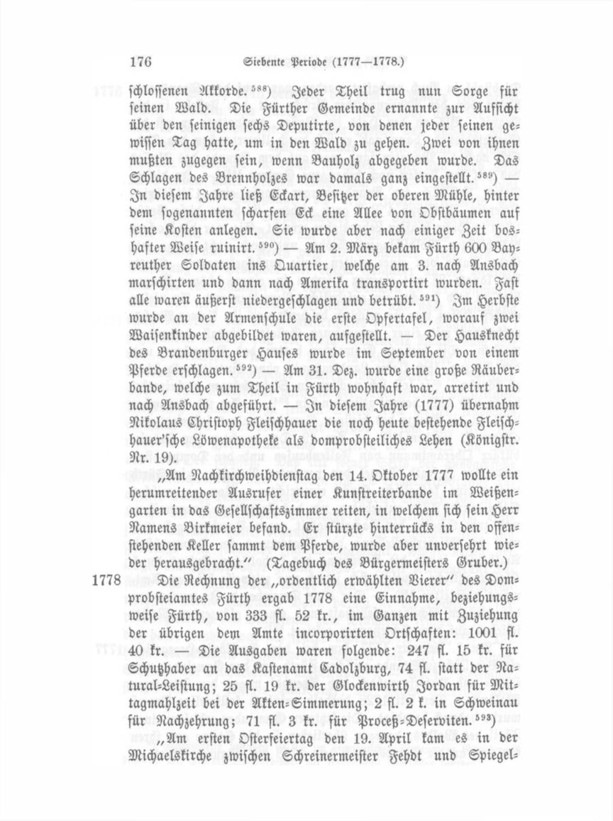 schlossenen Morde."°) Jeder Theil trug nun Sorge für seinen Wald. Die Fürther Gemeinde ernannte zur Aufsicht über den seinigen sechs Deputirte, von denen jeder seinen ge wissen Tag hatte, um in den Wald zu gehen. Zwei von ihnen mußten zugegen sein, wenn Bauholz abgegeben wurde. Das Schlagen des Brennholzes war damals ganz eingestellt."') — In diesem Jahre ließ Eckart, Besitzer der oberen Mühle, hinter dem sogenannten scharfen Eck eine Allee von Obstbäumen auf seine Kosten anlegen. Sie wurde aber nach einiger Zeit bos hafter Weise ruinirt.— Am 2. März bekam Fürth 600 Bay reuther Soldaten ins Quartier, welche am 3. nach Ansbach marschirten und dann nach Amerika transportirt wurden. Fast alle waren äußerst niedergeschlagen und betrübt. ">) Im Herbste wurde an der Armenschule die erste Opfertafel, worauf zwei Waisenkinder abgebildet waren, aufgestellt. — Der Hausknecht des Brandenburger Hauses wurde im September von einem Pferde erschlagen.— Am 31. Dez. wurde eine große Räuber bande, welche zum Theil in Fürth wohnhaft war, arretirt und nach Ansbach abgeführt. — In diesem Jahre (1777) übernahm Nikolaus Christoph Fleischhauer die noch heute bestehende Fleischhauer'sche Löwenapotheke als domprobsteiliches Lehen (Königstr. Nr. 19). „Am Nachkirchweihdienstag den 14. Oktober 1777 wollte ein herumreitender Ausrufer einer Kunstreiterbande im Weißen garten in das Gesellschaftszimmer reiten, in welchem sich sein Herr Namens Birkmeier befand. Er stürzte hinterrücks in den offen stehenden Keller sammt dem Pferde, wurde aber unversehrt wie der herausgebracht." (Tagebuch des Bürgermeisters Gruber.) 1778 Die Rechnung der „ordentlich erwählten Vierer" des Domprobsteiamtes Fürth ergab 1778 eine Einnahme, beziehungs weise Fürth, von 333 fl. 52 kr., im Ganzen mit Zuziehung der übrigen dem Amte incorporirten Ortschaften: 1001 fl. 40 kr. — Die Ausgaben waren folgende: 247 fl. 15 kr. für Schutzhaber an das Kastenamt Cadolzburg, 74 fl. statt der Natural-Leistung; 25 fl. 19 kr. der Glockenwirth Jordan für Mit tagmahlzeit bei der Akten-Simmerung; 2 fl. 2k. in Schweinau für Nachzehrung; 71 fl. 3 kr. für Proceß - Deserviten."') „Am ersten Osterfeiertag den 19. April kam es in der Michaelskirche zwischen Schreinermeister Fehdt und Spiegel-