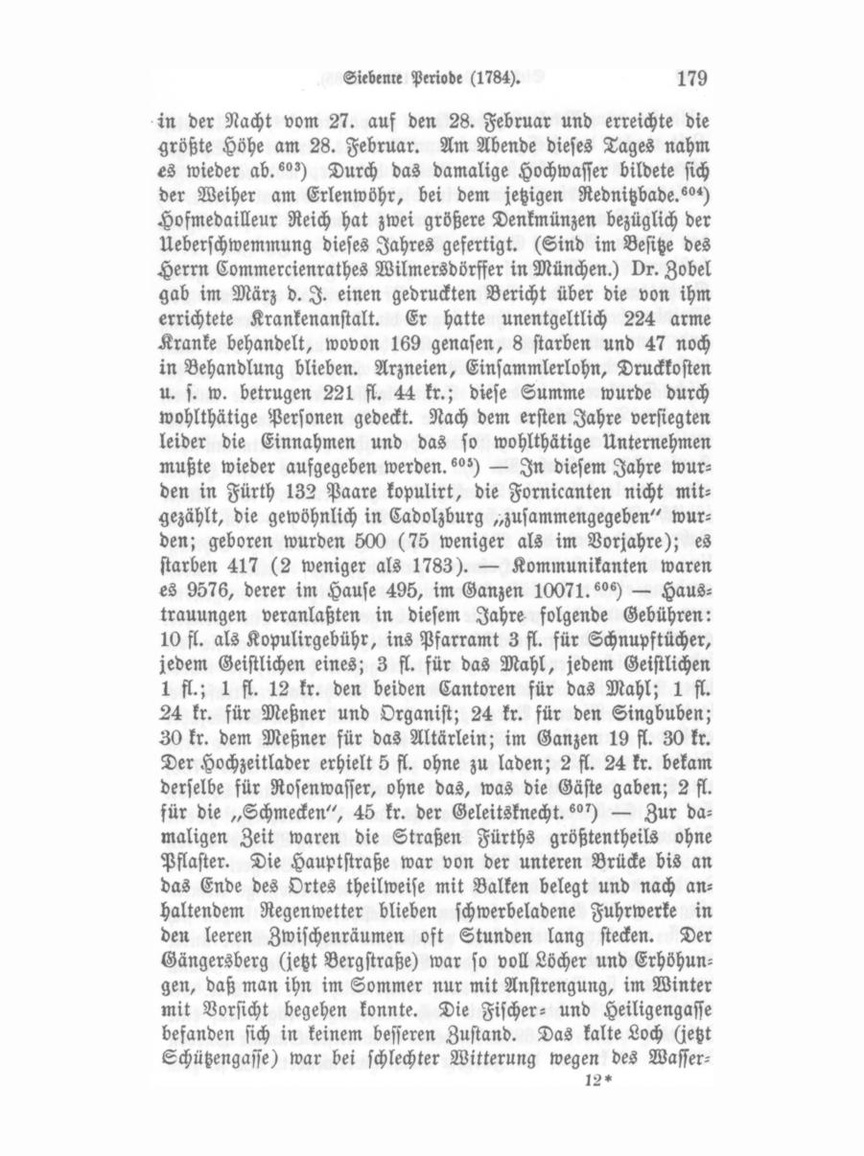 ein berühmter Kanzelredner. Erster Diakon wurde der bis­ herige zweite, Daniel Lochner. An des letzteren Stelle kam Georg Tobias Christoph Fronmüller, geboren zu Gräfenberg den 1. Januar 1748, seit 1774 Pfarrer in Schwimmbach. 1782 Die erste Theatergesellschaft, die, soviel bekannt ist, hier Vorstellungen gab, war die Berner'sche. Sie gab in einer neu­ erbauten Hütte am 12. Oktober 1782 die Oper „Alceste" unter sehr großem Zulauf."?). — Am 17. November wurde dahier David Ottensoser geboren, talentvoller Autodidakt in den orien­ talischen Sprachen, namentlich im Arabischen; er starb im israel. Hospitale am 22. Mai 1858.°") 1783 Das gute Weinjahr 1783 brachte auch den hiesigen Wein­ bergen, die damals noch in größerer Morgenzahl existirten, eine ergiebige Lese. °") — Nach dem Tode des Armenlehrers Gott­ fried Adam Kirchner folgte ihm im Amte Johann Michael Singer. Er hatte freie Wohnung und bezog wöchentlich 6 fl. 1b kr. für den Unterricht der Armen- und Waisenkinder, die sich ohngefähr auf 150 belaufen haben mögen. Außerdem hatte er noch 200 zahlende Schüler, die ihm wöchentlich 12 bis 15 fl. eintrugen. Doch mußte er zwei Amtsgehilfen halten."") — Am 12. Juni ist der junge Walther in der Rednitz am Schießanger ertrunken. Am 24. August d. I. machte Dr. Zobel in Fürth in einer eige­ nen Druckschrift den Vorschlag zur Errichtung eines klinischen Institutes in Fürth."') Von ihm stammt das sogenannte Zobels-Pulver (Kinderpulver), welches noch bei den Müttern und Kinderwärterinnen hier bekannt ist."") 1784 Der Winter von 1783 auf 1784 war sehr streng. In den Wäldern erfror das Wild; Vögel fielen todt zur Erde. Am 22. Februar trat plötzliches Thauwetter und starker anhaltender Regen ein, worauf eine noch nicht erlebte große Ueberschwemmung folgte. Die Regengüsse waren so heftig, daß von dem strömenden Wasser die Buden und Stände in den Straßen und besonders auf dem Markte gehoben und zum Theil abwärts ge­ führt wurden. Der Eisgang brachte großen Schaden. Die Eis­ schollen hatten bisweilen eine Stärke von 8—12 Fuß. Die Pegnitzbrücke, sowie eine Scheune mit einer Roßmühle hinter der oberen Mühle wurde weggerissen. Auf der Rednitz kamen abgerissene Stallungen, Hausgeräthe, Vieh geschwommen. Stege und kleine Brücken wurden fortgerissen. Das Hochwasser kam