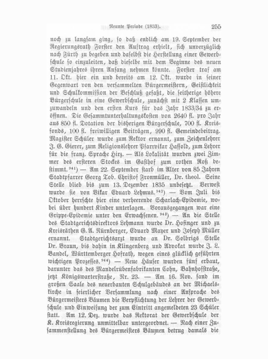 noch zu langsam ging, so daß endlich am 19. September der Regierungsrath Forster den Auftrag erhielt, sich unverzüglich nach Fürth zu begeben und daselbst die Herstellung einer Gewerb schule so einzuleiten, daß dieselbe mit dem Beginne des neuen Studienjahres ihren Anfang nehmen könnte. Forster traf am 11. Okt. hier ein und bereits am 12. Okt. wurde in seiner Gegenwart von den versammelten Bürgermeistern, Geistlichkeit und Schulkommission der Beschluß gefaßt, die seitherige höhere Bürgerschule in eine Gewerbschule, zunächst mit 2 Klassen um zuwandeln und den ersten Kurs für das Jahr 1833/34 zu er öffnen. Die Gesammtunterhaltungskosten von 2640 fl. pro Jahr aus 850 fl. Dotation der bisherigen Bürgerschule, 700 fl. Kreis fonds, 100 fl. freiwilligen Beiträgen, 990 fl. Gemeindebeitrag. Magister Schüler wurde zum Rektor ernannt, zum Zeichenlehrer I. G. Gierer, zum Religionslehrer Pfarrvikar Haffold, zum Lehrer für die franz. Sprache Hirz. — Als Lokalität wurden zwei Zim mer des ersteren Stockes im Gasthof zum rothen Roß be stimmt. "i) — Am 22. September starb im Alter von 85 Jahren Stadtpfarrer Georg Tob. Christof Fronmüller, Dr. tkool. Seine Stelle blieb bis zum 13. Dezember 1835 unbesetzt. Verwest wurde sie von Vikar Eduard Lehmus. V") — Vom Juli bis Oktober herrschte hier eine verheerende Scharlach-Epidemie, wo bei über hundert Kinder unterlagen. Norausgegangen war eine Grippe-Epidemie unter den Erwachsenen. ^") — An die Stelle des Stadtgerichtsdirektors Lehmann wurde Dr. Hofinger und zu Kreisräthen G. A. Nürnberger, Eduard Mayer und Joseph Müller ernannt. Stadtgerichtsarzt wurde an Dr. Solbrigs Stelle Dr. Braun, bis dahin in Klingenberg und Advokat wurde I. L. Bandel, Württemberger Hofrath, wegen eines glücklich geführten wichtigen Prozesses."") — Neue Häuser wurden fünf erbaut, darunter das des Mandelrübenfabrikanten Cohn, Bahnhofstraße, jetzt Königswarterstraße, Nr. 23. — Am 16. Nov. fand im großen Saale des neuerbauten Schulgebäudes an der Michaels kirche in feierlicher Versammlung nach einer Ansprache des Bürgermeisters Bäumen die Verpflichtung der Lehrer der Gewerb schule und Einweisung der zum Eintritt angemeldeten 23 Schüler statt. Am 12. Dez. wurde das Rektorat der Gewerbschule der K. Kreisregierung unmittelbar untergeordnet. — Nach einer Zu sammenstellung des Bürgermeisters Bäumen betrug damals die