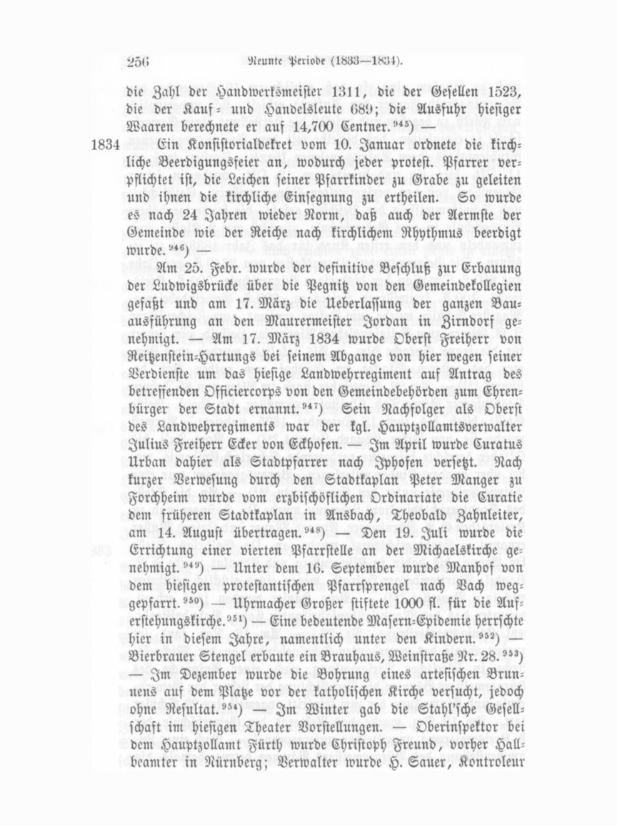 Freiherr Ecker von Eckhofen, Revifionsbeamter Franz Schub maul. In den Magistrat wurden gewählt: P. Nießner, F. Wild, I. Reißig, Phil. Eckart, Bayerlein. Als vierter Advokat wurde Dr. Sigmund Grünsfeld angestellt (der erste Advokat israelitischer Confession in Bayern.) — August Besold wurde Rentbeamter?") — Bevölkerungszahl: 14,000. Am 22. März 1835 starb dahier Professor Aaron Wolfs- 1835 sohn, Lehrer Michel- und Meierbeers."°) — Am 15. Juni wur den durch Ministerialverfügung nach ermitteltem Stande der Gesammtpfarrerträgnisse die Gehalte der hiesigen Protest. Geist lichen dahin normirt, daß für die erste Pfarrstelle 1800 fl., für die zweite 1130 fl., für die dritte 808 fl., für die vierte 650 fl., für die Predigerstelle der Auferstehungskirche 616 fl. bestimmt wurden. Als Verweser der vierten Pfarrstelle wurde am 6. Juli Vikar Wilhelm Förtsch, am 17. Oktober als erster Pfarrer vr. Friedrich Ludwig Hofmann, geboren den 12. Juli 1776 zu Bürglein, bis dahin Dekan in Leutershausen, als dritter Pfarrer Friedrich Karl Seiffert, bisher Pfarrer in Nenzenheim, als Pre diger an der Auferstehungskirche Lorenz Kraußold, bisher Pfarrer in Unteraufseß, ernannt, der am 13. Dezember installirt wurde. Der dritte und fünfte Pfarrer mußten in Miethe wohnen."?) Das Pfarrwitthum enthielt damals 98 Tagwerk 17 Decimalen Aecker und 24 Tagwerk Wiesen, welche seit dem 15. Juni 1835 dem ersten und vierten Pfarrer in bestimmten Raten zuerkannt wurden. — Am 3. August starb Joh. Matth. Stumpfmeier, Gast wirth zum Kronprinzen von Preußen. — Am 25. August wurde ein Hintergebäude des Freiherrn v. Schenk'schen Schlößchen durch Brand beschädigt. — Am 28. Oktober wurden wegen der Ver mehrung der Pfarrstellen durch das Oberkonsistorium die pfarr amtlichen Verrichtungen neu geregelt. Die Führung des Pfarr amtes verblieb bei der ersten Pfarrstelle von St. Michael."«) — Das Kirchenvermögen, kombinirt aus dem ehemaligen Stamm vermögen der St. Michaelskirchenstiftung (aus 27,275 fl. Kapi talien und 11,491 fl. kapitalisirenden Realitätenwerth bestehend) und aus dem Fond der Landalmosenstiftung (3850 fl. an Kapi talien und 12,552 fl. an kapitalisirenden Grundgefällen) wurde der Verwaltung des ersten Pfarrers (Stadtpfarrers) und der Kirchenverwaltnngsmitglieder unterstellt. Ein von und aus den F ronmn N er, Chronik von Fürth.