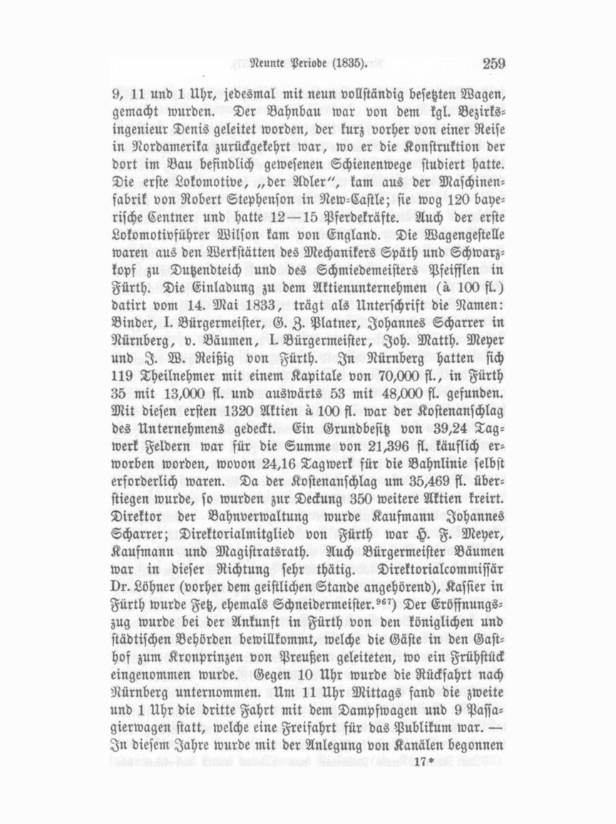 letzteren gewählter Stiftungspfleger wurde mit dem ersten Pfarrer zur Führung der Hauptkasia bestimmt, und zwar unter gegen seitiger Sperre, während ein eigener Stiftungskafsier zur Be sorgung des laufenden Kassen- und Rechnungswesens aufgestellt wurde, welches alljährlich die Kollegien des Magistrates und der Gemeindebevollmächtigten zu genehmigen und die kgl. Re gierung als Oberkuratelbehörde zu respiciren hattet") — Im Sommer dieses Jahres ist der öffentliche Brunnen am Chore der katholischen Kirche in der oberen Königsstraße hergestellt worden. Die Zeichnung hiezu hatte König Ludwig I. selbst ausgewählt; der Brunnen kostete 500 fl. und wurde mit einem eigenen Druck werke versehen. — In diesem Jahre wurde von der hiesigen Freimaurerloge „zur Wahrheit und Freundschaft" ein Verein zur Rettung von Personen und Mobilien gegründet.^') — Am 1. Oktober wurde die städtische Waage in der Waaggasse dem öffentlichen Verkehr übergeben. Letztere Straße war aus dem ehemals Roßwirthshofe gebildet worden. Die Thorbögen am Eingänge in die Gustav- und Königsstraße, ebenso der Schlag baum, wurden beseitigt. — Vom Oktober 1835 an bis April 1839 gab Direktor Hahn von Nürnberg mit seiner Gesellschaft Vorstellungen im hiesigen Theater, s") — Der artesische Brun nen, der auf dem Holzmarkte gebohrt wurde, hatte bis zum 5. Oktober eine Tiefe von 354 Fuß. Da der Magistrat die Arbeiten nicht weiter fortsetzen wollte, so veranstaltete Advokat Zehler zu diesem Behufe eine Sammlung. Das Unternehmen hatte bereits 3000 fl. gekostet. Nach dem Weggange des Lauter wurden die Arbeiten durch Kohlenberger und Kugler fort gesetzt. 2") — Am 12. Okt. forderte in höherem Auftrage der Magistrat zur Subscription auf Aktien für den zu begründenden Donau-Mainkanal auf. Es wurden zunächst 2800 fl. an Aktien gezeichnet, d") — Erbaut wurden vier neue Häuser, worunter das Verwaltungsgebäude, die Wagenremise und Stallungen der Ludwigs-Eisenbahngesellschaft, b") Die Eröffnung der LudwigsEisenbahn, der ersten in Deutschland, erfolgte am 7. Dezember, nachdem mehrere gelungene Probefahrten stattgefunden hatten und nachdem unter dem 19 Februar 1834 vom Staate für sie