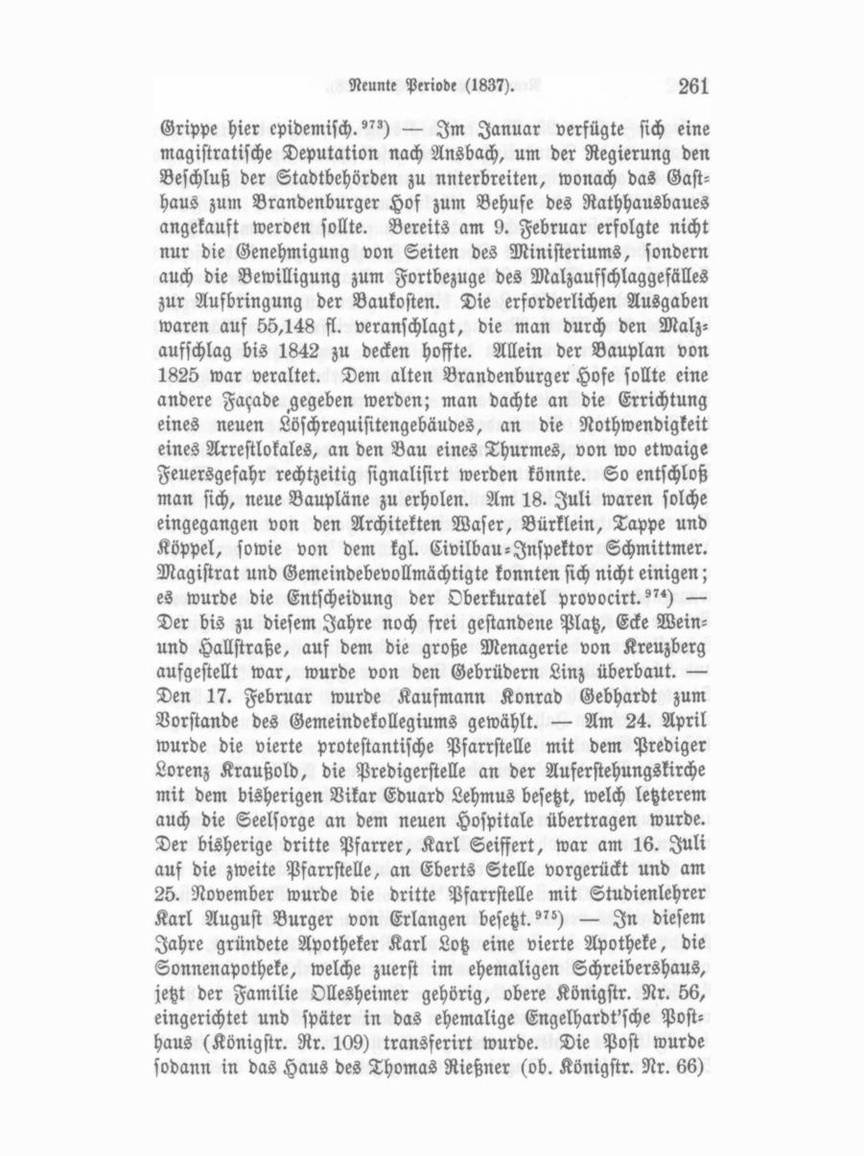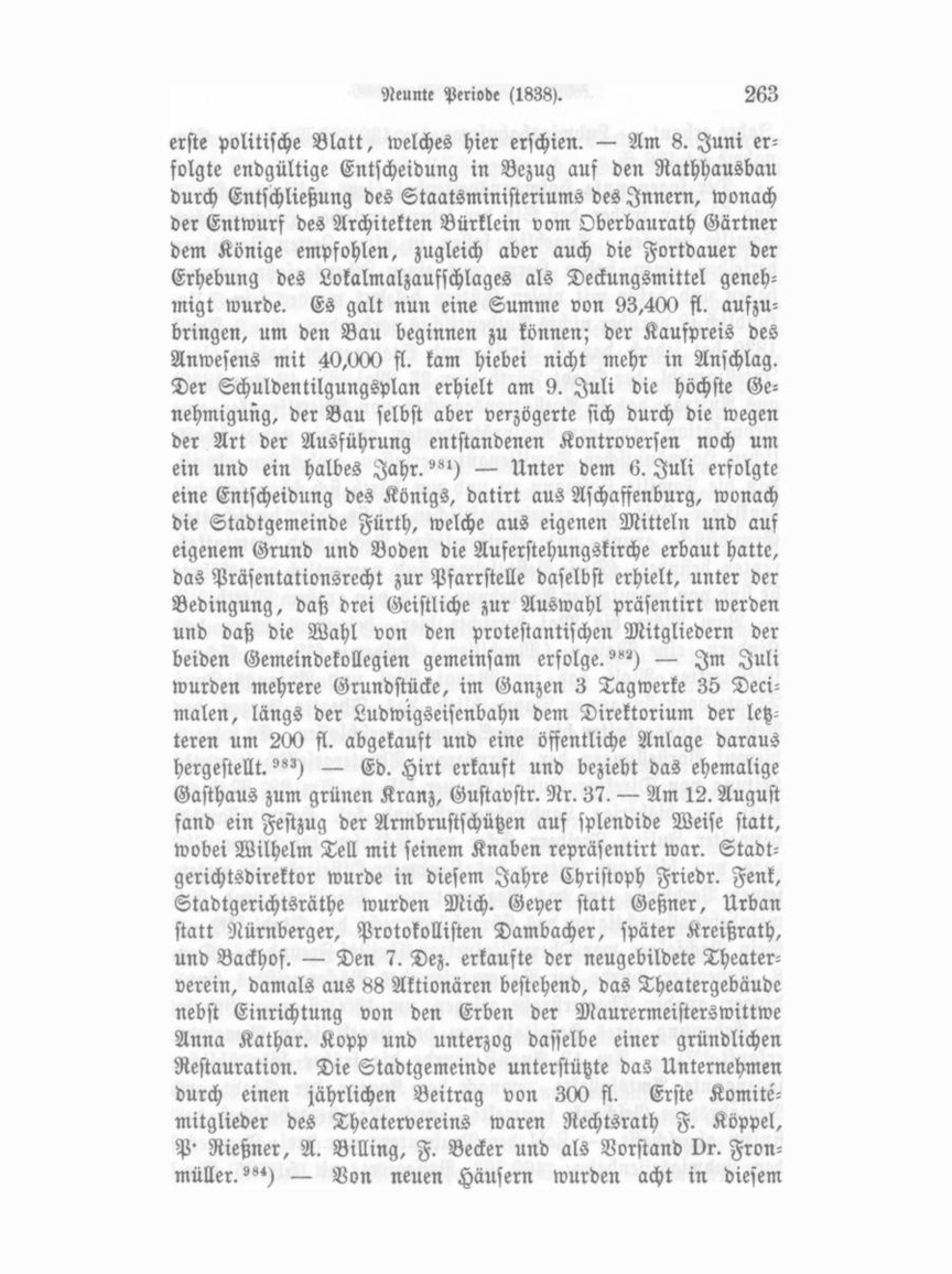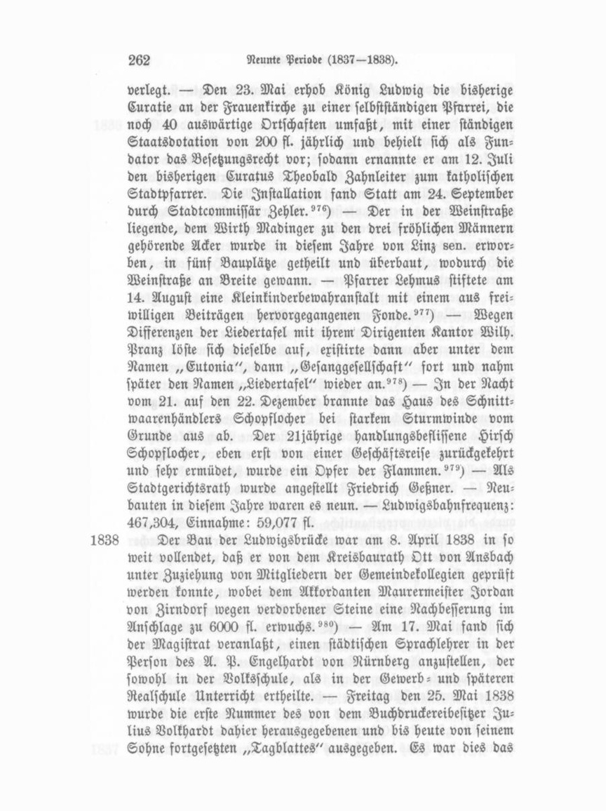 verlegt. — Den 23. Mai erhob König Ludwig die bisherige Curatie an der Frauenkirche zu einer selbstständigen Pfnrrei, die noch 40 auswärtige Ortschaften umfaßt, mit einer ständigen Staatsdotation von 200 fl. jährlich und behielt sich als Fun dator das Besetzungsrecht vor; sodann ernannte er am 12. Juli den bisherigen Curatus Theobald Zahnleiter zum katholischen Stadtpfarrer. Die Installation fand Statt am 24. September durch Stadtcommissär Zehler."«) — Der in der Weinstraße liegende, dem Wirth Madinger zu den drei fröhlichen Männern gehörende Acker wurde in diesem Jahre von Linz seu. erwor ben, in fünf Bauplätze getheilt und überbaut, wodurch die Weinstraße an Breite gewann. — Pfarrer Lehmus stiftete am 14. August eine Kleinkinderbewahranstalt mit einem aus frei willigen Beiträgen hervorgegangenen Fonds?") — Wegen Differenzen der Liedertafel mit ihrem Dirigenten Kantor Wilh. Pranz löste sich dieselbe auf, existirte dann aber unter dem Namen „Eutonia", dann „Gesanggesellschaft" fort und nahm später den Namen „Liedertafel" wieder an?") — In der Nacht vom 21. auf den 22. Dezember brannte das Haus des Schnittwaarenhändlers Schopflocher bei starkem Sturmwinde vom Grunde aus ab. Der 21jährige handlungsbeflissene Hirsch Schopflocher, eben erst von einer Geschäftsreise zurückgekehrt und sehr ermüdet, wurde ein Opfer der Flammen?") — Als Stadtgerichtsrath wurde angestellt Friedrich Geßner. — Neu bauten in diesem Jahre waren es neun. — Ludwigsbahnfrequenz: 467,304, Einnahme: 59,077 fl. 1838 Der Bau der Ludwigsbrücke war am 8. April 1838 in so weit vollendet, daß er von dem Kreisbaurath Ott von Ansbach unter Zuziehung von Mitgliedern der Gemeindekollegien geprüft werden konnte, wobei dem Akkordanten Maurermeister Jordan von Zirndorf wegen verdorbener Steine eine Nachbesserung im Anschläge zu 6000 fl. erwuchs."») — Am 17. Mai fand sich der Magistrat veranlaßt, einen städtischen Sprachlehrer in der Person des A. P. Engelhardt von Nürnberg anzustellen, der sowohl in der Volksschule, als in der Gewerb- und späteren Realschule Unterricht ertheilte. — Freitag den 25. Mai 1838 wurde die erste Nummer des von dem Buchdruckereibesitzer Ju lius Volkhardt dahier herausgegebenen und bis heute von seinem Sohne fortgesetzten „Tagblattes" ausgegeben. Es war dies das