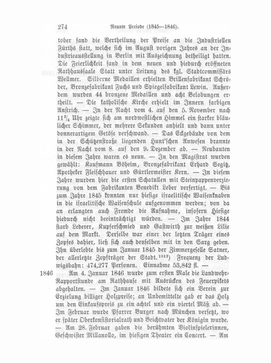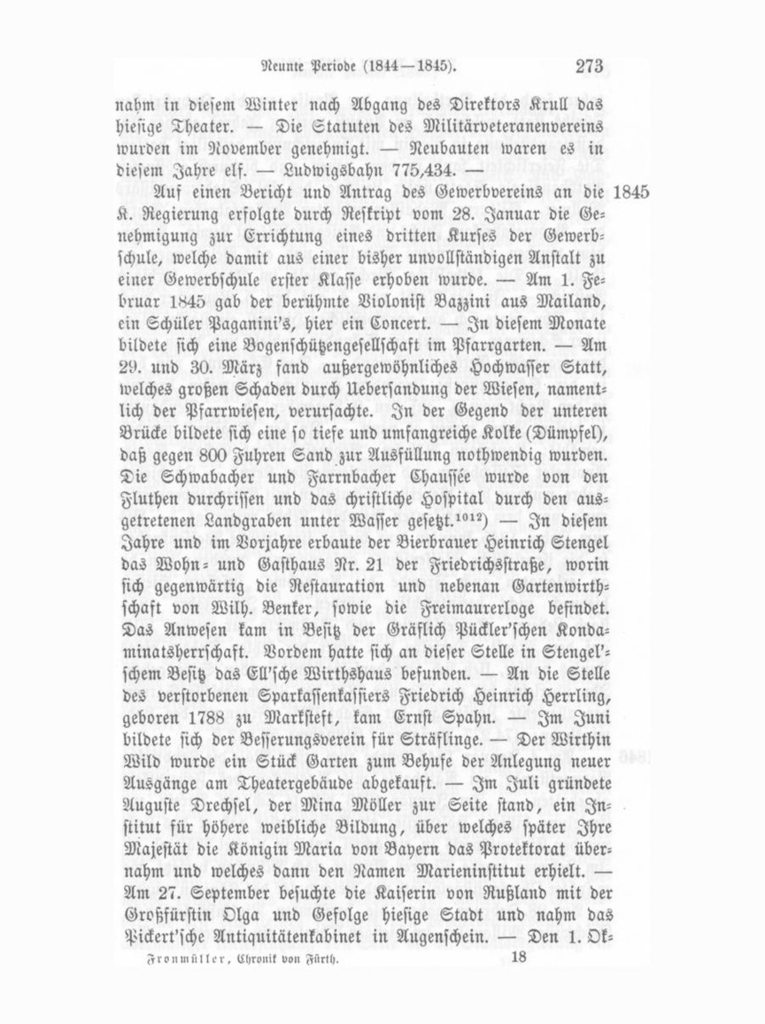 nahm in diesem Winter nach Abgang des Direktors Krull das hiesige Theater. — Die Statuten des Militärveteranenvereins wurden im November genehmigt. — Neubauten waren es in diesem Jahre elf. — Ludwigsbahn 775,434. — Aus einen Bericht und Antrag des Gewerbvereins an die 1845 K. Regierung erfolgte durch Reskript vom 28. Januar die Ge nehmigung zur Errichtung eines dritten Kurses der Gewerb schule, welche damit aus einer bisher unvollständigen Anstalt zu einer Gewerbschule erster Klasse erhoben wurde. — Am 1. Fe bruar 1845 gab der berühmte Violonist Bazzini aus Mailand, ein Schüler Paganini's, hier ein Concert. — In diesem Monate bildete sich eine Bogenschützengesellschaft im Pfarrgarten. — Am 29. und 30. März fand außergewöhnliches Hochwasser Statt, welches großen Schaden durch llebersandung der Wiesen, nament lich der Pfarrwiesen, verursachte. In der Gegend der unteren Brücke bildete sich eine so tiefe und umfangreiche Kolke (Dümpfel), daß gegen 800 Fuhren Sand zur Ausfüllung nothwendig wurden. Tie Schwabacher und Farrnbacher Chaussee wurde von den Fluthen durchrissen und das christliche Hospital durch den aus getretenen Landgraben unter Wasser gesetzt?"") — In diesem Jahre und im Vorjahre erbaute der Bierbrauer Heinrich Stengel das Wohn- und Gasthaus Nr. 21 der Friedrichsstraße, worin sich gegenwärtig die Restauration und nebenan Gartenwirthschaft von Wilh. Benker, sowie die Freimaurerloge befindet. Das Anwesen kam in Besitz der Gräflich Pückler'schen Kondaminatsherrschaft. Vordem hatte sich an dieser Stelle in Stengel'schem Besitz das Ell'sche Wirthshaus befunden. — An die Stelle des verstorbenen Sparkassenkassiers Friedrich Heinrich Herrling, geboren 1788 zu Marksteft, kam Ernst Spahn. — Im Juni bildete sich der Befferungsverein für Sträflinge. — Der Wirthin Wild wurde ein Stück Garten zum Behufe der Anlegung neuer Ausgänge am Theatergebäude abgekauft. — Im Juli gründete Auguste Drechsel, der Mina Möller zur Seite stand, ein In stitut für höhere weibliche Bildung, über welches später Ihre Majestät die Königin Maria von Bayern das Protektorat über nahm und welches dann den Namen Marieninstitut erhielt. — Am 27. September besuchte die Kaiserin von Rußland mit der Großfürstin Olga und Gefolge hiesige Stadt und nahm das Pickert'sche Antiquitätenkabinet in Augenschein. — Den 1. OkFron m üNcr, Chronik von Fürth.