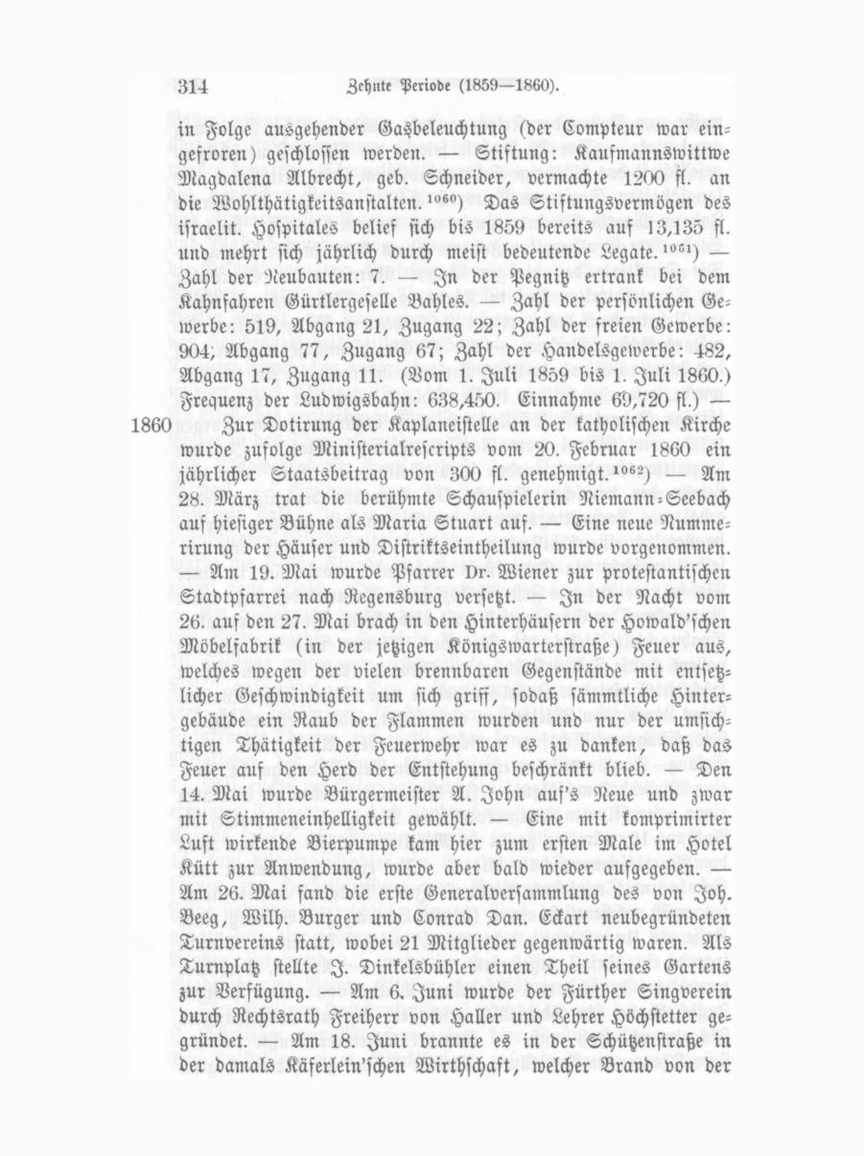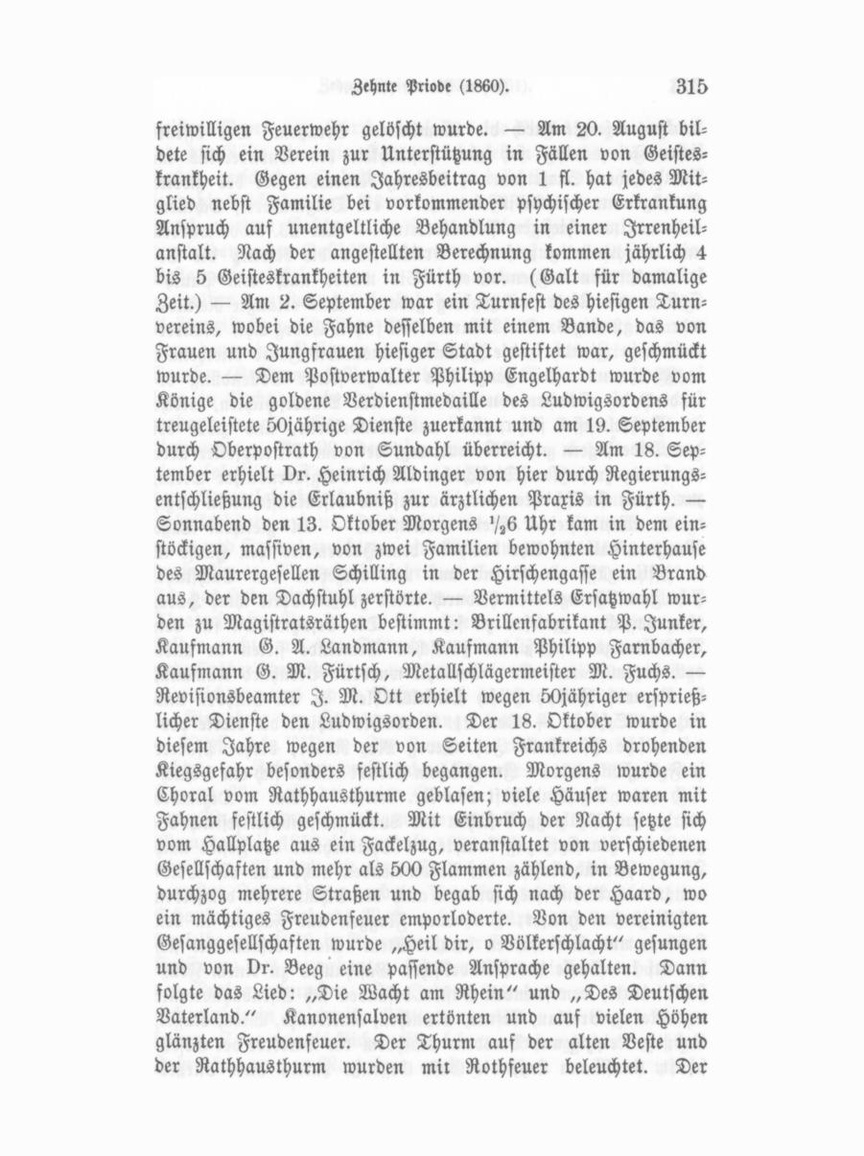 freiwilligen Feuerwehr gelöscht wurde. — Am 20. August bil dete sich ein Verein zur Unterstützung in Fällen von Geistes krankheit. Gegen einen Jahresbeitrag von 1 fl. hat jedes Mit glied nebst Familie bei vorkommender psychischer Erkrankung Anspruch auf unentgeltliche Behandlung in einer Jrrenheilanstalt. Nach der angestellten Berechnung kommen jährlich 4 bis 5 Geisteskrankheiten in Fürth vor. (Galt für damalige Zeit.) — Am 2. September war ein Turnfest des hiesigen Turn vereins, wobei die Fahne desieiben mit einem Bande, das von Frauen und Jungfrauen hiesiger Stadt gestiftet war, geschmückt wurde. — Dem Postverwalter Philipp Engelhardt wurde vom Könige die goldene Verdienstmedaille des Ludwigsordens für treugeleistete 50jährige Dienste zuerkannt und am 19. September durch Oberpostrath von Sundahl überreicht. — Am 18. Sep tember erhielt Dr. Heinrich Aldinger von hier durch Regierungs entschließung die Erlaubniß zur ärztlichen Praxis in Fürth. — Sonnabend den 13. Oktober Morgens '/-6 Uhr kam in dem ein stöckigen, massiven, von zwei Familien bewohnten Hinterhause des Maurergesellen Schilling in der Hirschengasse ein Brand aus, der den Dachstuhl zerstörte. — Vermittels Ersatzwahl wur den zu Magistratsräthen bestimmt: Brillenfabrikant P. Junker, Kaufmann G. A. Landmann, Kaufmann Philipp Farnbacher, Kaufmann G. M. Fürtsch, Metallschlägermeister M. Fuchs. — Revisionsbeamter I. M. Ott erhielt wegen 50jähriger ersprieß licher Dienste den Ludwigsorden. Der 18. Oktober wurde in diesem Jahre wegen der von Seiten Frankreichs drohenden Kiegsgefahr besonders festlich begangen. Morgens wurde ein Choral vom Rathhausthurme geblasen; viele Häuser waren mit Fahnen festlich geschmückt. Mit Einbruch der Nacht setzte sich vom Hallplatze aus ein Fackelzug, veranstaltet von verschiedenen Gesellschaften und mehr als 500 Flammen zählend, in Bewegung, durchzog mehrere Straßen und begab sich nach der Haard, wo ein mächtiges Freudenfeuer emporloderte. Von den vereinigten Gesanggesellschaften wurde „Heil dir, o Völkerschlacht" gesungen und von Dr. Beeg eine passende Ansprache gehalten. Dann folgte das Lied: „Die Wacht am Rhein" und „Des Deutschen Vaterland." Kanonensalven ertönten und auf vielen Höhen glänzten Freudenfeuer. Der Thurm auf der alten Veste und der Rathhausthurm wurden mit Rothfeuer beleuchtet. Der