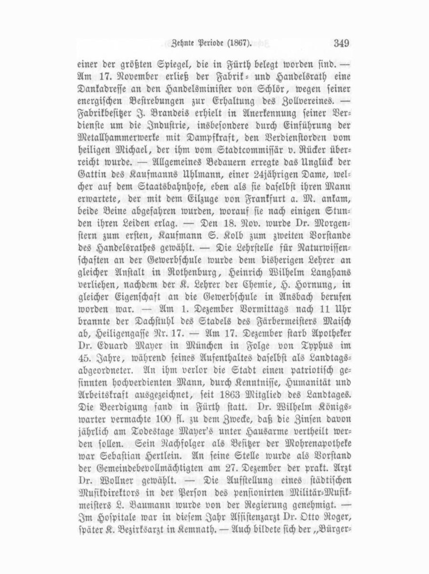 Kunstanstalt; der jüngste Sohn Ferdinand renomirter Maler. Siehe über dessen Lntherbild in der Wöhrder Kirche, April 1884 der Chronik. 335. — Kaufmann Ollesheimer wurde von der hiesigen Freimaurer-Loge zum Vorstande gewählt. — Am 6. Sep tember wurde bei Gelegenheit der Reparatur des Daches vom Thurme der Michaelskirche der Knopf zum Behufe der Ver goldung abgenommen, worin sich ein Gefäß von Thon befand und in dem letztern auf Pergament mehrere historische Notizen, die bereits früher erwähnt wurden. Auf dem neuvergoldeten Knopf, in welchem ein Gedenkblatt auf Pergament geschrieben kam, wurde von mehreren patriotischen Bürgern ein vergoldetes Kreuz angebracht. — Stadtgerichtsassefsor K. Schmidtsiller wurde Bezirksgerichtsafsessor in Nürnberg; an seine Stelle, kam Land gerichtsassessor Karl Bihler von Cadolzburg. — Am 21. Sep tember wurde Subrektor Albert Bischoff in Uffenheim zum Lehrer an der Lateinschule dahier ernannt. — An die Stelle des zum Bezirksgerichtsrathe in Eichstätt beförderten Andreas Wütscher kam als Bezirksgerichtsassessor E. W. Seiferling, bis her Staatsanwaltsvertreter in München. — Den 21. Oktober erhielt vr. Wilhelm Königswarter, Rentier in München, in Anbetracht seiner großen Verdienste um die Stadt das Ehren bürgerrecht derselben. Das Diplom wurde ihm von einer Deputation des Magistrats in München überreicht. — Den 25. Oktober gingen telegraphische Ansuchen an die Abgeord netenkammer von Seite der Gemeindekollegien und des Han dels-, Gewerb- und Fabrikrathes nach München ab, mit der dringenden Bitte um Genehmigung der Zollvereinsverträge. — Am 30. Oktober beschloß der hiesige Arbeiterverein (Vorsitzender war H. Mayer, Schriftfüherr Gabriel Löwenstein) in Gemein schaft mit dem Arbeiterbildungsverein in Nürnberg und dem Volksverein dahier (erster Vorsitzender vr. Landmann, zweiter vr. Kronacher, Schriftführer vr. Degen), eine Eingabe an die Kammer der Abgeordneten zu erlassen, worin die Einführung des Milizwesens nach schweizerischem Muster beantragt wurde, vr. Kiderlin und vr. Morgenstern forderten die Einwohnerschaft zur Betheiligung an dieser Zuschrift auf."ss) — Bei dem Fabrikanten Ludwig Winkler (Rosengaffe Nr. 2) war ein mit Silber überzogenes Spiegelglas von 11 Fuß Höhe und 6 Fuß Breite zu sehen, weiß und mit richtigem Reflex. Es war dies