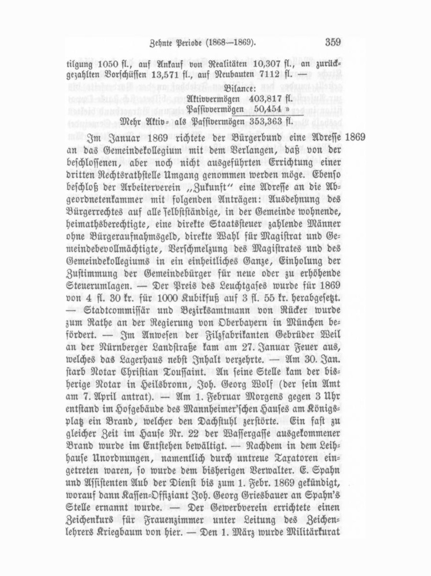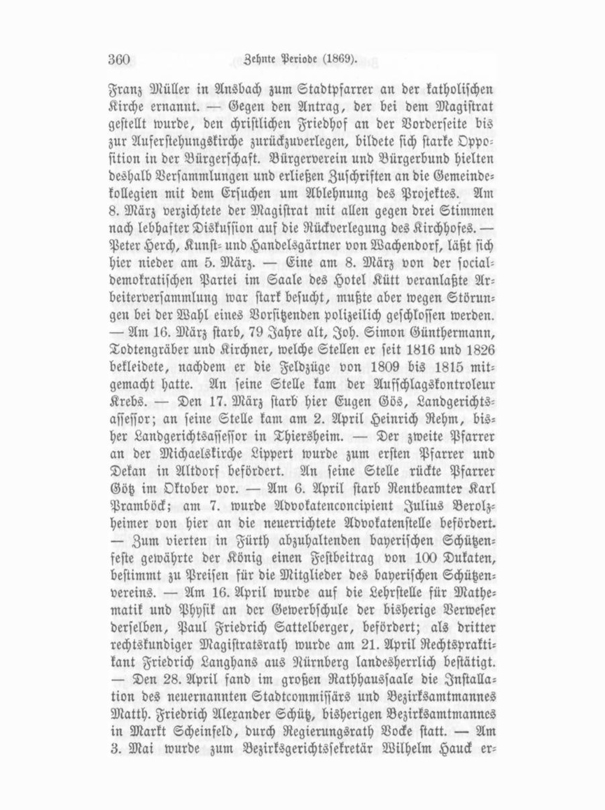Franz Müller in Ansbach zum Stadtpfarrer an der katholischen Kirche ernannt. — Gegen den Antrag, der bei dem Magistrat gestellt wurde, den christlichen Friedhof an der Vorderseite bis zur Auferstehungskirche zurückzuverlegen, bildete sich starke Oppo sition in der Bürgerschaft. Bürgerverein und Bürgerbund hielten deshalb Versammlungen und erließen Zuschriften an die Gemeinde kollegien mit dem Ersuchen um Ablehnung des Projektes. Am 8. März verzichtete der Magistrat mit allen gegen drei Stimmen nach lebhafter Diskussion auf die Rückverlegung des Kirchhofes. — Peter Herch, Kunst- und Handelsgärtner von Wachendorf, läßt sich hier nieder am 5. März. — Eine am 8. März von der social demokratischen Partei im Saale des Hotel Kütt veranlaßte Ar beiterversammlung war stark besucht, mußte aber wegen Störun gen bei der Wahl eines Vorsitzenden polizeilich geschloffen werden. — Am 16. März starb, 79 Jahre alt, Joh. Simon Günthermann, Todtengräber und Kirchner, welche Stellen er seit 1816 und 1826 bekleidete, nachdem er die Feldzüge von 1809 bis 1815 mit gemacht hatte. An seine Stelle kam der Aufschlagskontroleur Krebs. — Den 17. März starb hier Eugen Gös, Landgerichtsaffessor; an seine Stelle kam am 2. April Heinrich Rehm, bis her Landgerichtsassessor in Thiersheim. — Der zweite Pfarrer an der Michaelskirche Lippert wurde zum ersten Pfarrer und Dekan in Altdorf befördert. An seine Stelle rückte Pfarrer Götz im Oktober vor. — Am 6. April starb Rentbeamter Karl Pramböck; am 7. wurde Advokatenconcipient Julius Berolzheimer von hier an die neuerrichtete Advokatenstelle befördert. — Zum vierten in Fürth abzuhaltenden bayerischen Schützen feste gewährte der König einen Festbeitrag von 100 Dukaten, bestimmt zu Preisen für die Mitglieder des bayerischen Schützen vereins. — Am 16. April wurde auf die Lehrstelle für Mathe matik und Physik an der Gewerbschule der bisherige Verweser derselben, Paul Friedrich Sattelberger, befördert; als dritter rechtskundiger Magistratsrath wurde am 21. April Rechtsprakti kant Friedrich Langhans aus Nürnberg landesherrlich bestätigt. — Den 28. April fand im großen Rathhaussaale die Installa tion des neuernannten Stadtcommiffärs und Bezirksamtmannes Matth. Friedrich Alexander Schütz, bisherigen Bezirksamtmannes in Markt Scheinfeld, durch Regierungsrath Vocke statt. — Am 3. Mai wurde zum Bezirksgerichtssekretär Wilhelm Hauck er-