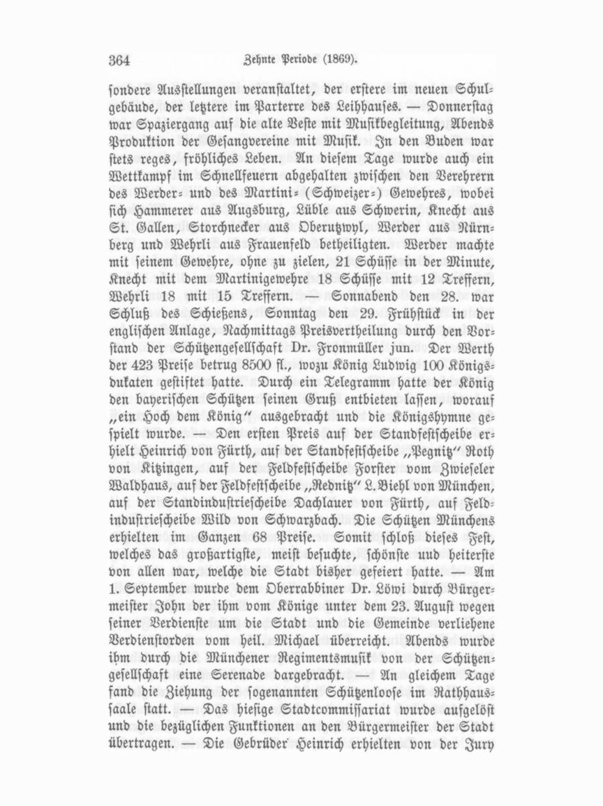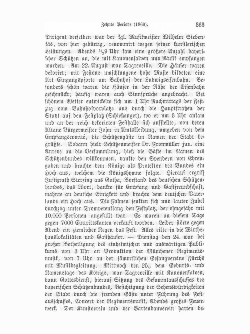 Dirigent derselben war der kgl. Musikmeister Wilhelm Siebenkäs, von hier gebürtig, renommirt wegen seiner künstlerischen Leistungen. Abends ^9 Uhr kam eine größere Anzahl bayeri scher Schützen an, die mit Kanonensalven und Musik empfangen wurden. Am 22. August war Tagreveille. Die Häuser waren dekorirt; mit Festons umschlungene hohe Maste bildeten eine Art Eingangspforte am Bahnhof der Ludwigseisenbahn. Be sonders schön waren die Häuser in der Nähe der Eisenbahn geschmückt; häufig waren auch Sinnsprüche angebracht. Bei schönem Wetter entwickelte sich um 1 Uhr Nachmittags der Fest zug vom Bahnhofvorplatze aus durch die Hauptstraßen der Stadt auf den Festplatz (Schießanger), wo er um 3 Uhr ankam und an der reich dekorirten Festhalle sich aufstellte, von deren Altane Bürgermeister John in Amtskleidung, umgeben von dem Empfangscomite, die Schützengäste im Namen der Stadt be grüßte. Sodann hielt Schützenmeister Dr. Fronmüller fun. eine Anrede an die Versammlung, hieß die Gäste im Namen des Schützenbundes willkommen, dankte den Spendern von Ehren gaben und brachte dem Könige als Protektor des Bundes ein Hoch aus, welchem die Königshymne folgte. Hierauf ergriff Justizrath Sterzing aus Gotha, Vorstand des deutschen Schützen bundes, das Wort, dankte für Empfang und Gastfreundschaft, mahnte an deutsche Einigkeit und brachte dem deutschen Vater lands ein Hoch aus. Die Fahnen senkten sich und lauter Jubel durchzog unter Trompetenklang den Festplatz, der ohngefähr mit 10,000 Personen angefüllt war. Es waren an diesem Tage gegen 7000 Eintrittskarten verkauft worden. Leider störte gegen Abend ein ziemlicher Regen das Fest. Alles eilte in die Wirths hauslokalitäten und Gasthäuser. — Dienstag den 24. war bei großer Betheiligung des einheimischen und auswärtigen Publi kums von 3 Uhr an Produktion der Münchener Regiments musik, von 7 Uhr an der sämmtlichen Gesangvereine Fürths mit Musikbegleitung. Mittwoch den 25., dem Geburts- und Namenstage des Königs, war Tagreveille mit Kanonensalven, dann Gottesdienst, hierauf Sitzung des Gesammtausschusses des bayerischen Schützenbundes, Besichtigung der Sehenswürdigkeiten der Stadt durch die fremden Gäste unter Führung des Fest ausschusses, Concert der Regimentsmusik, Abends großes Feuer werk. Der Kunstverein und der Gartenbauverein hatten be
