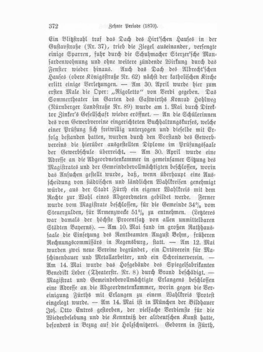 Ein Blitzstrahl traf das Dach des Hirt'schen Hauses in der Gustavstraße (Nr. 37), trieb die Ziegel auseinander, versengte einige Sparren, fuhr durch die Schuhmacher Sterzer'sche Man sardenwohnung und ohne weitere zündende Wirkung durch das Fenster wieder hinaus. Auch das Dach des Albrecht'schen Hauses (obere Königsstraße Nr. 62) nächst der katholischen Kirche erlitt einige Verletzungen. — Am 30. April wurde hier zum ersten Male die Oper: „Rigoletto" von Verdi gegeben. Das Sommertheater im Garten des Gastwirths Konrad Hohlweg (Nürnberger Landstraße Nr. 89) wurde am 1. Mai durch Direk tor Zinker's Gesellschaft wieder eröffnet. — An die Schülerinnen des vom Gewerbvereine eingerichteten Buchhaltungskurses, welche einer Prüfung sich freiwillig unterzogen und dieselbe mit Er folg bestanden hatten, wurden durch den Vorstand des Gewerbvereins die hierüber ausgestellten Diplome im Prüfungssaale der Gewerbschule überreicht. — Am 30. April wurde eine Adresse an die Abgeordnetenkammer in gemeinsamer Sitzung des Magistrates und der Gemeindebevollmächtigten beschlossen, worin das Ansuchen gestellt wurde, daß, wenn überhaupt eine Aus scheidung von städtischen und ländlichen Wahlkreisen genehmigt würde, aus der Stadt Fürth ein eigener Wahlkreis mit dem Rechte zur Wahl eines Abgeordneten gebildet werde. Ferner wurde vom Magistrate beschlossen, für die Gemeinde 34°/, vom Steuergulden, für Armenzwecke 51°/, zu entnehmen. (Letzteres war damals der höchste Procentsatz von allen unmittelbaren Städten Bayerns). — Am 10. Mai fand im großen Rathhaus saale die Einsetzung des Rentbeamten August Behm, früheren Rechnungscommissärs in Regensburg, statt. — Am 12. Mai wurden zwei neue Vereine begründet, ein Ortsverein für Ma schinenbauer und Metallarbeiter, und ein Schreinerverein. — Am 14. Mai wurde das Hofgebäude des Spiegelfabrikanten Benedikt Leber (Theaterstr. Nr. 8) durch Brand beschädigt. — Magistrat und Gemeindebevollmächtigte Erlangens beschlossen eine Adresse an die Abgeordnetenkammer, worin gegen die Ver einigung Fürths mit Erlangen zu einem Wahlkreis Protest eingelegt wurde. — Am 14. Mai ist in München der Bildhauer Jos. Otto Entres gestorben, der vielfache Verdienste für die Wiederbelebung und die Kenntniß der altdeutschen Kunst hatte, besonders in Bezug auf die Holzschnitzerei. Geboren in Fürth,