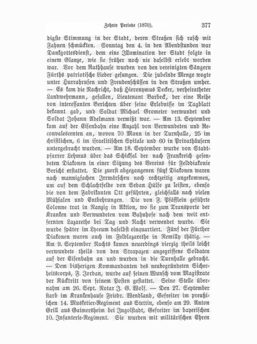 bestattet, wobei die Feuerwehr den Kondukt bildete; beide ruhen in demselben Grab. — Bei dem Handelsgerichte wurden wegen Mehrung der Verhandlungen zwei Gerichtstage in der Woche festgesetzt. — Die am 29. in Fürth eingelaufene Nachricht vom Falle Straßburgs erregte freudige Sensation unter den Ein wohnern und gab Veranlassung zur Beflaggung der Häuser. — Am 30. September starb der Bezirksthierarzt Leonhard Guthmann. Sein Nachfolger wurde Michael Harringer, Thierarzt in Cadolz burg. — Am ersten Kirchweihtage beförderte die Ludwigs-Eisen bahn 12,000, am zweiten 6500 Personen. — Georg Winkler, Elfenbeingraveur, Vertriebener aus Paris, läßt sich hier den 4. Ok tober nieder. — Den 12. Oktober Abends 10Uhr sind 29 verwundete und kranke Soldaten hier eingetroffen und in der Turnhalle unter gebracht worden. — Am 15. Oktober erließ ein aus der Bürger schaft hervorgegangenes Comite einen Ausruf zur Darreichung von Beiträgen für die nothleidende Stadt Straßburg. — Der Verein zur Unterstützung der durch den Krieg nothleidenden Handwerker familien hatte am 15. Oktober nach elfwöchentlicher Dauer 7230 fl. zur Vertheilung gebracht und blieben noch 1600 zur Verfügung. — Bei dem Handelsgerichte wurde Kaufmann L. Engelmann seiner Funktion als Ergänzungsrichter auf Ansuchen enthoben. Da gegen wurden die Kaufleute S. E. Berolzheimer, M. Lieser, H. Hornschuch und Eduard Ley zu Assessoren, die Kaufleute I. Mohr und I. F. Morgenstern zu Ergänzungsrichtern er nannt. — Zum Armen Wundarzte wurde vom Magistrate S. Springer an Stelle des verstorbenen Oppel gewählt. — Am 20. Oktober wurde in der Wohnung des Wirthes Fürst (im Hotel Union) ein bedeutender Diebstahl an Pretiosen und an Effekten verübt. Der Verdacht lenkte sich auf einen Drechsler gesellen. Bei einer noch in der Nacht in der Wohnung seiner Geliebten vorgenommenen Haussuchung fand man einen großen Theil der gestohlenen Gegenstände in deren Koffer, den Dieb selbst in einem Schranke versteckt. — An gleichem Tage entstand ein Brand im Kesselhause der Bleistiftfabrik Berolzheimer und Jllfelder (Schwabstr. Nr. 35). - Dienstag Abend den 25. Ok tober war ein starkes Nordlicht zu sehen, dem am 26. ein orkan artiger Sturmwind folgte, welcher von Abends 9^ bis Morgens 2 Vs Uhr Fürth und Umgegend in einem Grade heimsuchte, wie dies seit Menschengedenken nicht der Fall gewesen ist. An einem