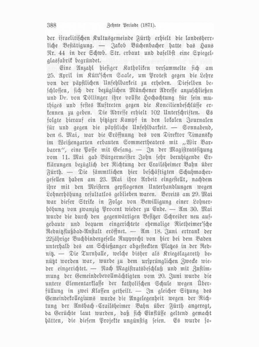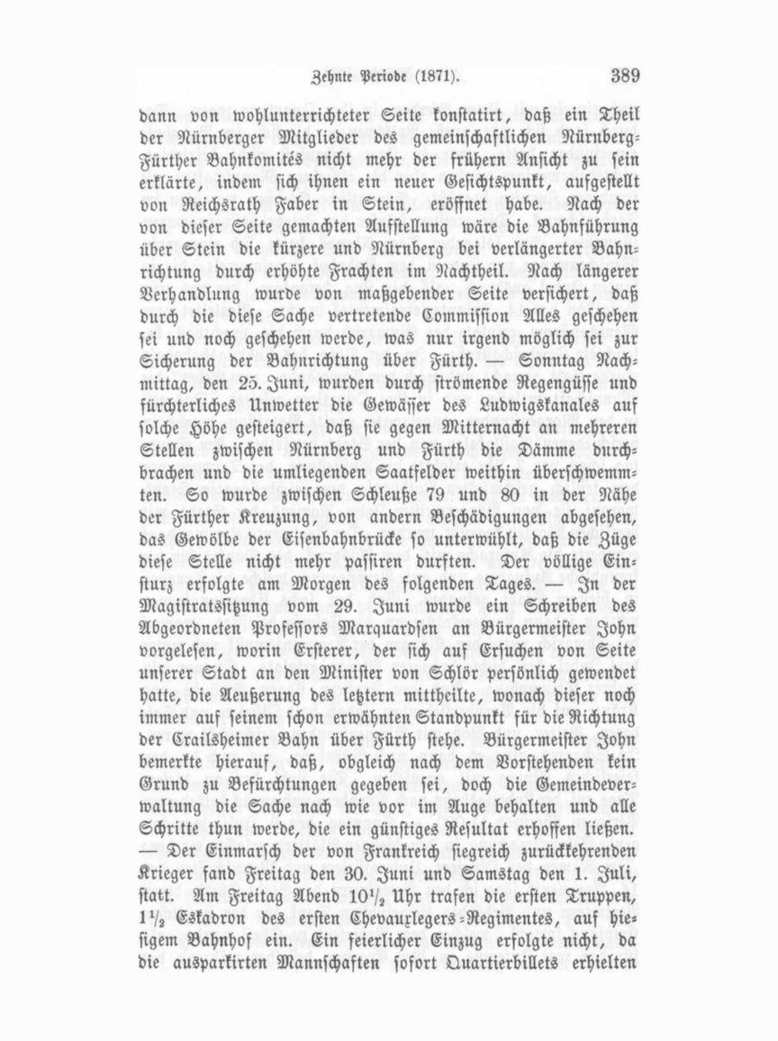 dann von wohlunterrichteter Seite konstatirt, daß ein Theil der Nürnberger Mitglieder des gemeinschaftlichen NürnbergFürther Bahnkomites nicht mehr der frühern Ansicht zu sein erklärte, indem sich ihnen ein neuer Gesichtspunkt, aufgestellt von Reichsrath Faber in Stein, eröffnet habe. Nach der von dieser Seite gemachten Aufstellung wäre die Bahnführung über Stein die kürzere und Nürnberg bei verlängerter Bahn richtung durch erhöhte Frachten im Nachtheil. Nach längerer Verhandlung wurde von maßgebender Seite versichert, daß durch die diese Sache vertretende Commission Alles geschehen sei und noch geschehen werde, was nur irgend möglich sei zur Sicherung der Bahnrichtung über Fürth. — Sonntag Nach mittag, den 25. Juni, wurden durch strömende Regengüsse und fürchterliches Unwetter die Gewässer des Ludwigskanales auf solche Höhe gesteigert, daß sie gegen Mitternacht an mehreren Stellen zwischen Nürnberg und Fürth die Dämme durch brachen und die umliegenden Saatfelder weithin überschwemm ten. So wurde zwischen Schleuß« 79 und 80 in der Nähe der Fürther Kreuzung, von andern Beschädigungen abgesehen, das Gewölbe der Eisenbahnbrücke so unterwühlt, daß die Züge diese Stelle nicht mehr passiven durften. Der völlige Ein sturz erfolgte am Morgen des folgenden Tages. — In der Magistratssitzung vom 29. Juni wurde ein Schreiben des Abgeordneten Professors Marquardsen an Bürgermeister John vorgelesen, worin Ersterer, der sich auf Ersuchen von Seite unserer Stadt an den Minister von Schlör persönlich gewendet hatte, die Aeußerung des letztern mittheilte, wonach dieser noch immer auf seinem schon erwähnten Standpunkt für die Richtung der Crailsheimer Bahn über Fürth stehe. Bürgermeister John bemerkte hierauf, daß, obgleich nach dem Vorstehenden kein Grund zu Befürchtungen gegeben sei, doch die Gemeindever waltung die Sache nach wie vor im Auge behalten und alle Schritte thun werde, die ein günstiges Resultat erhoffen ließen. — Der Einmarsch der von Frankreich siegreich zurückkehrenden Krieger fand Freitag den 30. Juni und Samstag den 1. Juli, statt. Am Freitag Abend 10'/- Uhr trafen die ersten Truppen, Eskadron des ersten Chevauxlegers-Regimentes, auf hie sigem Bahnhof ein. Ein feierlicher Einzug erfolgte nicht, da die ausparkirten Mannschaften sofort Quartierbillets erhielten
