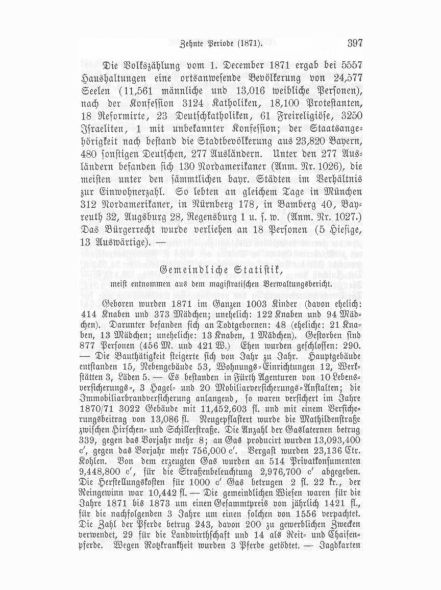 Die Volkszählung vom 1. December 1871 ergab bei 5557 Haushaltungen eine ortsanwesende Bevölkerung von 24,577 Seelen (11,561 männliche und 13,016 weibliche Personen), nach der Konfession 3124 Katholiken, 18,100 Protestanten, 18 Resormirte, 23 Deutschkatholiken, 61 Freireligiöse, 3250 Israeliten, 1 mit unbekannter Konfession; der Staatsange hörigkeit nach bestand die Stadtbevölkerung aus 23,820 Bayern, 480 sonstigen Deutschen, 277 Ausländern. Unter den 277 Aus ländern befanden sich 130 Nordamerikaner (Anm. Nr. 1026), die meisten unter den sämmtlichen bayr. Städten im Verhältnis zur Einwohnerzahl. So lebten an gleichem Tage in München 312 Nordamerikaner, in Nürnberg 178, in Bamberg 40, Bay reuth 32, Augsburg 28, Regensburg 1 u. s. w. (Anm. Nr. 1027.) Das Bürgerrecht wurde verliehen an 18 Personen (5 Hiesige, 13 Auswärtige). — Gemeindliche Statistik, meist entnommen aus dem magistratischen Berwaltungsbericht. Geboren wurden 1871 im Ganzen 1003 Kinder (davon ehelich: 414 Knaben und 373 Mädchen; unehelich: 122 Knaben und 94 Mäd chen). Darunter befanden sich an Todtgebornen: 48 (eheliche: 21 Kna ben, 13 Mädchen; uneheliche: 13 Knaben, 1 Mädchen). Gestorben sind 877 Personen (456 M. und 421 W.) Ehen wurden geschloffen: 290. — Die Bauthätigkeit steigerte sich von Jahr zu Jahr. Hauptgebäude entstanden 15, Nebengebäude 53, Wohnungs-Einrichtungen 12, Werk stätten 3, Läden 5.— Es bestanden in Fürth Agenturen von 10 Lebens versicherungs-, 3 Hagel- und 20 Mobiliarversicherungs-Anstalten; die Immobiliarbrandversicherung anlangend, so waren versichert im Jahre 1870/71 3022 Gebäude mit 11,452,603 fl. und mit einem Versiche rungsbeitrag von 13,086 fl. Neugepflastert wurde die Mathildenstraße zwischen Hirschen- und Schillerstraße. Die Anzahl der Gaslaternen betrug 339, gegen das Vorjahr mehr 8; an Gas producirt wurden 13,093,400 </, gegen das Vorjahr mehr 756,000 </. Vergast wurden 23,136 Ctr. Kohlen. Von dem erzeugten Gas wurden an 514 Privatkonsumenten 9,448,800 o*, für die Straßenbeleuchtung 2,976,700 e* abgegeben. Die Herstellungskosten für 1000 Gas betrugen 2 fl. 22 kr., der Reingewinn war 10,442 fl. — Die gemeindlichen Wiesen waren für die Jahre 1871 bis 1873 um einen Gesammtpreis von jährlich 1421 fl., für die nachfolgenden 3 Jahre um einen solchen von 1556 verpachtet. Die Zahl der Pferde betrug 243, davon 200 zu gewerblichen Zwecken verwendet, 29 für die Landwirthschaft und 14 als Reit- und Chaisen pferde. Wegen Rotzkrankheit wurden 3 Pferde getödtet. — Jagdkarten
