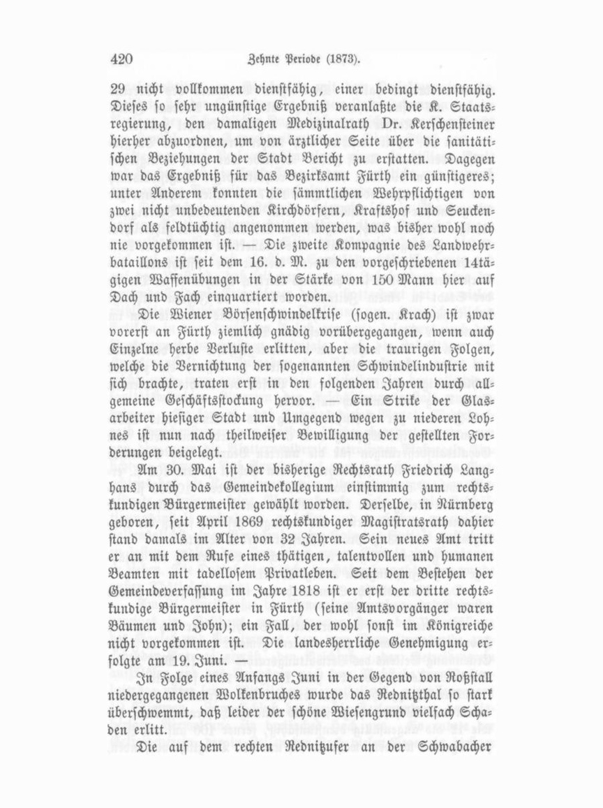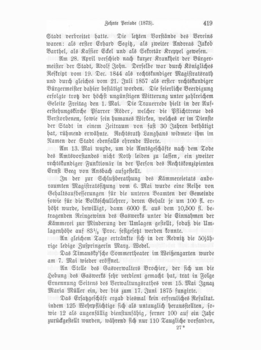 Stadt verbreitet hatte. Die letzten Vorstände des Vereins waren: als erster Erhard Segitz, als zweiter Andreas Jakob Barthel, als Kassier Eckel und als Sekretär Kreppel gewesen. Am 28. April verschied nach kurzer Krankheit der Bürger meister der Stadt, Adolf John. Derselbe war durch Königliches Reskript vom 19. Dec. 1844 als rechtskundiger Magistratsrath und durch gleiches vom 21. Juli 1857 als erster rechtskundiger Bürgermeister dahier bestätigt worden. Die feierliche Beerdigung erfolgte trotz der höchst ungünstigen Witterung unter zahlreichem Geleite Freitag den 1. Mai. Die Trauerrede hielt in der Auf erstehungskirche Pfarrer Röder, welcher die Pflichttreue des Verstorbenen, sowie sein humanes Wirken, welches er im Dienste der Stadt in einem Zeitraum von fast 30 Jahren bethätigt hat, rühmend erwähnte. Rechtsrath Langhans widmete ihm im Namen der Stadt ebenfalls ehrende Worte. Am 13. Mai wurde, um die Amtsgeschäfte nach dem Tode des Amtsvorstandes nicht Noth leiden zu lassen, ein zweiter rechtskundiger Funktionär in der Person des Rechtskonzipienten Ernst Beeg von Ansbach aufgestellt. In der zur Schlußberathung des Kämmereietats anbe raumten Magistratssitzung vom 6. Mai wurde eine Reihe von Gehaltsaufbesserungen für die unteren Beamten der Gemeinde sowie für die Volksschullehrer, deren Gehalt je um 100 fl. er höht wurde, bewilligt, dann 6000 fl. aus dem 10,500 fl. be tragenden Reingewinn des Gaswerks unter die Einnahmen der Kämmerei zur Minderung der Umlagen gestellt, sodaß die Um lagenhöhe auf 83 Vz Proc. festgesetzt werden konnte. An gleichem Tage ertränkte sich in der Rednitz die 50jährige ledige Zuspringerin Marg. Wedel. Das Timansky'sche Sommertheater im Weißengarten wurde am 7. Mai wieder eröffnet. An Stelle des Gasverwalters Brochier, der sich um die Hebung des Gaswerks sehr verdient gemacht hat, trat in Folge Ernennung Seitens des Verwaltungsrathes vom 15. Mai Ignaz Maria Müller ein, der bis zum 17. Juni 1875 fungirte. Das Ersatzgeschäft ergab diesmal kein erfreuliches Resultat, indem 125 Wehrpflichtige sich als untauglich herausstellten, so wie 12 als augenfällig dienstunfähig, ferner 100 auf ein Jahr zurückgestellt wurden, während sich nur 110 Taugliche vorfanden, 27*