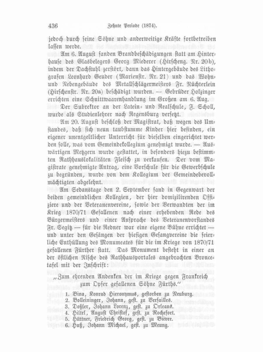 und Nebengebäude des Metallschlägermeisters Fr. Nüchterlein (Hirschenstr. Nr. 20a) beschädigt wurden. — Gebrüder Holzinger errichten eine Schnittwaarenhandlung im Großen am 6. Aug. Der Subrektor an der Latein- und Realschule, F. Scholl, wurde als Studienlehrer nach Regensburg versetzt. Am 20. August beschloß der Magistrat, daß wegen des Um standes, daß sich neun taubstumme Kinder hier befinden, ein eigener unentgeltlicher Unterricht für dieselben eingerichtet wer den solle, was vom Gemeindekollegium genehmigt wurde. — Aus wärtigen Metzgern wurde gestattet, in besonders hiezu bestimm ten Rathhauslokalitäten Fleisch zu verkaufen. Der vom Ma gistrate genehmigte Antrag, eine Vorschule für die Gewerbschule zu begründen, wurde von dem Kollegium der Gemeindebevoll mächtigten abgelehnt. Am Sedanstage den 2. September fand in Gegenwart der beiden gemeindlichen Kollegien, der hier domizilirenden Offi ziere und der Veteranenvereine, sowie der Verwandten der im Krieg 1870/71 Gefallenen nach einer erhebenden Rede des Bürgermeisters und einer Ansprache des Veteranenvorstandes Fr. Segitz — für die Redner war eine eigene Bühne errichtet — und unter den Gesängen der hiesigen Gesangvereine die feier liche Enthüllung des Monumentes für die im Kriege von 1870/71 gefallenen Fürther statt. Das Monument besteht in einer an der östlichen Nische des Rathhausportales angebrachten Broncetafel mit der Inschrift: „Zum ehrenden Andenken der im Kriege gegen Frankreich zum Opfer gefallenen Söhne Fürths." 1. 2. 3. 4. 5. 6.