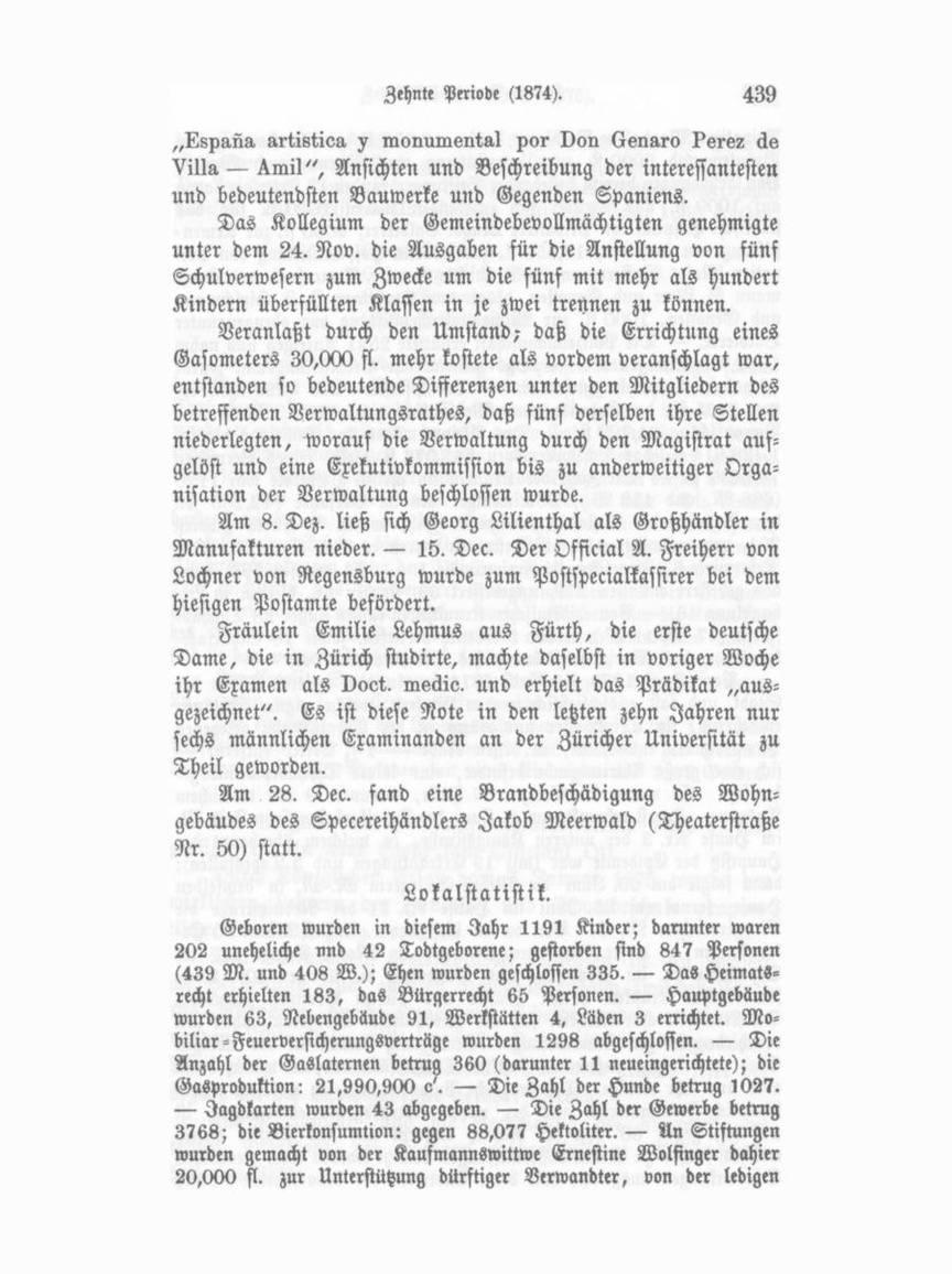 der Schulen durch die Geistlichkeit; sein Schlußantrag ging auf Bruch mit den alten Traditionen in der Schulaufsicht, strenge Scheidung des staatlichen und kirchlichen Gebietes, Zurückgabe der Schule ihrem eigentlichen Gebiet. Ein nicht endenwollender Beifallssturm gab Zeugniß von der vollkommenen Uebereinstim mung der Versammlung mit den Ideen des Redners. Die be treffenden Thesen wurden acceptirt. Der Vorsitzende schloß die Verhandlung mit Ausbringung eines dreimaligen Hoches auf den König und auf den Vertreter der Stadt. Ein einfaches Mahl vereinigte noch eine größere Anzahl Festtheilnehmer zu gemüthlicher Unterhaltung bei den Tönen eines Nürnberger Orchesters. Dem Pfarrer W. Scherer dahier wurde die erste Pfarrstelle der Kirche zu St. Jakob in Nürnberg verliehen. Die Nürnberg-Fürther Eisenbahn hatte am 4. Oktober, dem ersten Tage der Fürther Kirchweihe, die stärkste Frequenz seit ihrem Bestehen. Es wurden an diesem Tage 15,213 Per sonen befördert und hiefür 1763 fl. vereinnahmt. Die am 17. Okt. im hiesigen Theater aufgeführte Oper „Die Jüdin" war auf folgende Weise besetzt: Eleazar: Diener, Recha: Frau Wagner, Kardinal: Petzer, Leopold: Schüller, Eudoxa: Frl. Greil. — Spiegelwaarenfabrikant Wolf Wolf wurde Armenpflegschaftsrath am 20. Oktober. — Moritz und Sigmund Besels, Großhändler in Galanteriewaaren seit 22. Okt. 30. Okt. An Stelle des verstorbenen Rechtsrathes Frei herrn von Haller wurde Bürgermeister Langhans in den Landes ausschuß des bayer. Gewerbemuseums in der jüngst stattgehabten Generalversammlung gewählt. Am 11. Nov. wurde zum ersten Male dahier die Oper Lohengrin von Wagner gegeben. Heinrich der Vogler: Petzer, Lohengrin: Diener, Elsa von Brabant: Frau Wagner-Ueberhorst, Talramund: Thalen, Ordrud: Frau Petzer. 19. Nov. Studienlehrer Ed. Groß wurde zum Subrektor an der hiesigen isolirten Latein- und Realschule ernannt und an dessen Stelle Gymnasialassistent G. Oßbereger in Erlangen befördert vr. Wilhelm Königswarter hat seiner Anhänglichkeit an seine Vaterstadt wiederholt in großartiger Weise Aus druck gegeben durch Schenkung eines Prachtwerkes (Ladenpreis 2000 Franken) an die hiesige Stadtbibliothek. Es ist dies