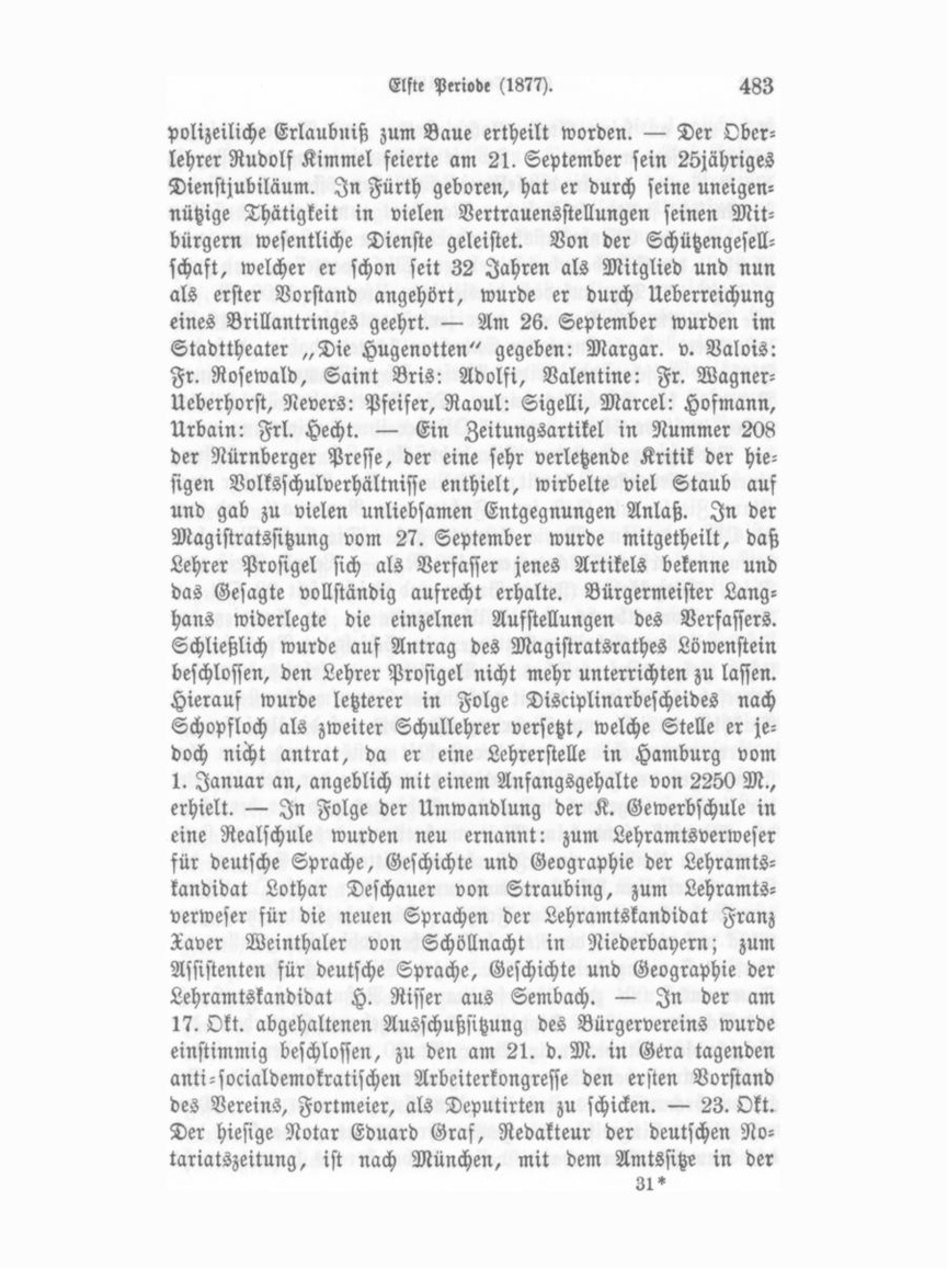 lerer nicht von der Chausseeseite, sodaß ein Unglück von Seite der gestürzten und entwurzelten Bäume den Zug nicht traf. — Am 22. August Abends gegen 10 Uhr kam im sogenannten Schwarzengarten am Ende der Blumenstraße in einem der Wittwe Klara Schwarz gehörenden Stadel Feuer aus, welches mit rasender Schnelligkeit um sich griff und nicht allein den Stadel, sondern auch die beiden angrenzenden kleinen Häuser zerstörte. — Mit dem 1. September trat für die sämmtlichen Gewerbschulen Bayerns, also auch für die hiesige, ein neuer, tiefeingreifeuder Wendepunkt ein durch ihre Umwandlung in 6kursige Realschulen. Durch diese neue Organisation wurden mehr fache Aenderungen und Ernennungen im Lehrerkollegium ver anlaßt, und dies um so mehr, als die hiesige Schüle durch ihre bedeutende Frequenz in den meisten Kursen Parallelabtheilungen nothwendig machte. — Die Feier des Sedantages war eine gelungene, Morgens Musikumzug; Vormittag 11 Uhr Zug der Veteranen und des Reserveoffizierkorps zum Kriegergrabe, wo der Vorstand der ersteren mit warmempfundencn Worten der Todten gedachte und einen Lorbeerkranz niederlegte, wobei die Gesellschaft Liederkranz ein der Bedeutung der Feier ent sprechendes Lied vortrug. Mittags rückten die Veteranenvereine und Mitglieder des Bürgervereines mit Musik und Fahnen zu fröhlicher Unterhaltung auf den Festplatz, der am Abend glän zend beleuchtet war. — Am 2. September fand die feier liche Einsetzung des Pfarrers Langhans statt. — Am 6. Sep tember erhielt bei Gelegenheit der mit dem zweiten Verbandstage der mittelfränkischen Bienenzüchter in Weißenburg verbundenen Ausstellung der hiesige Zeidlerverein für Modelle, eine Biblio thek und Bienenwohnungen den ersten Preis. — In der Ma gistratssitzung vom 20. September sind die letzten Hindernisse, die sich der Erbauung des Schlachthauses entgegenstellten, die Einwendungen verschiedener Personen, namentlich der des Metz germeisters Schildknecht im Namen des Fleischervereins gestellten: daß itl Folge der Erweiterung der Stadt in einer dem Schlacht hause entgegengesetzten Richtung die Metzger, welche sich bisher ohne Fuhrwerk behelfen konnten, fernerhin ohne dies nicht mehr auskommen könnten, daß vor Allen die Kleinmetzger dadurch benachtheiligt und jedenfalls die Fleischpreise erheblich erhöht werden müßten, beseitigt worden und ist nun die gewerbs