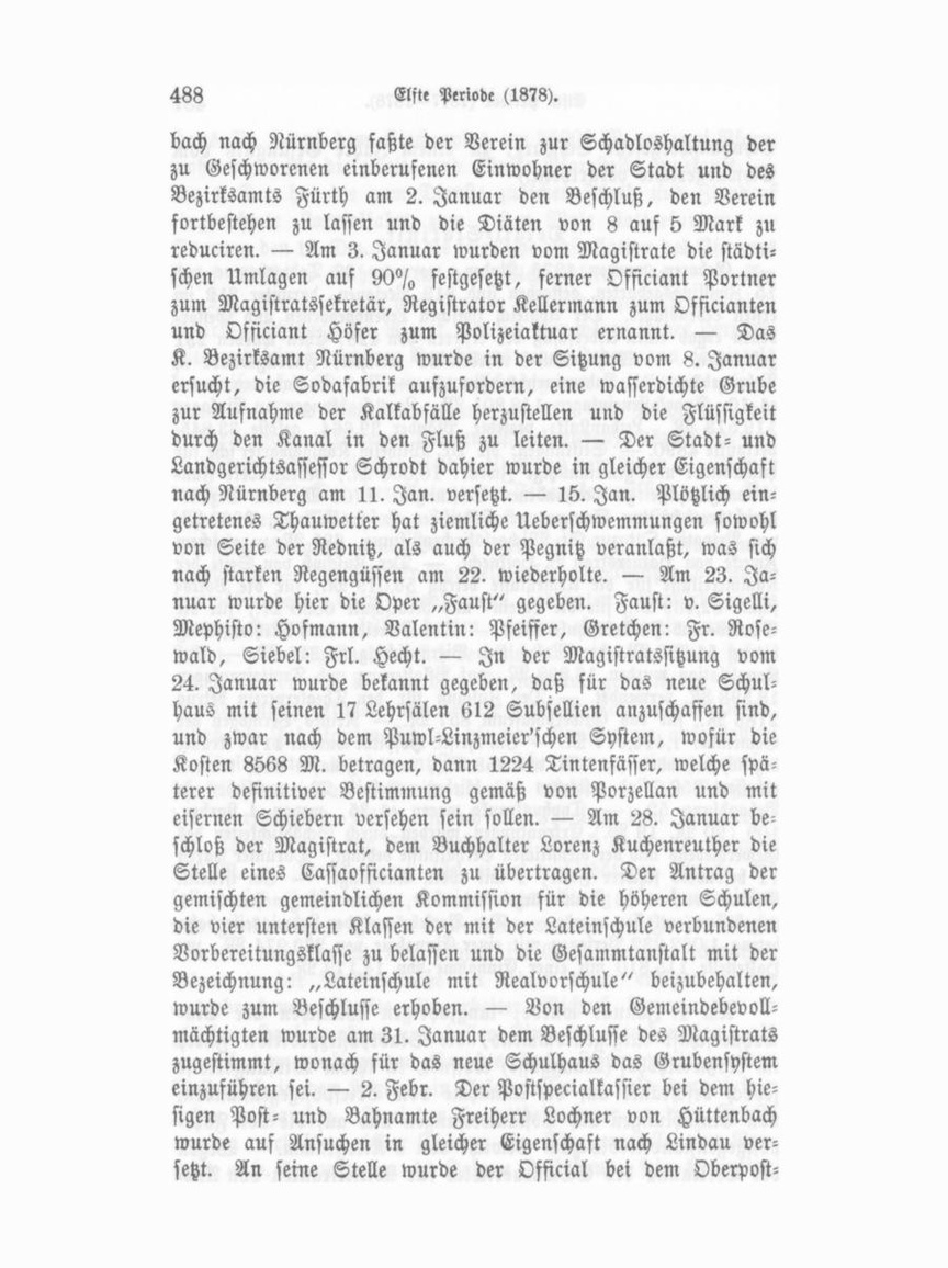 bach nach Nürnberg faßte der Verein zur Schadloshaltung der zu Geschworenen einberufenen Einwohner der Stadt und des Bezirksamts Fürth am 2. Januar den Beschluß, den Verein fortbestehen zu lassen und die Diäten von 8 auf 5 Mark zu reduciren. — Am 3. Januar wurden vom Magistrate die städti schen Umlagen auf 90°/, festgesetzt, ferner Officiant Portner zum Magistratssekretär, Registrator Kellermann zum Officianten und Officiant Höfer zum Polizeiaktuar ernannt. — Das K. Bezirksamt Nürnberg wurde in der Sitzung vom 8. Januar ersucht, die Sodafabrik aufzufordern, eine wasserdichte Grube zur Aufnahme der Kalkabfälle herzustellen und die Flüssigkeit durch den Kanal in den Fluß zu leiten. — Der Stadt- und Landgerichtsassessor Schrodt dahier wurde in gleicher Eigenschaft nach Nürnberg am 11. Jan. versetzt. — 15. Jan. Plötzlich ein getretenes Thauwetter hat ziemliche Ueberschwemmungen sowohl von Seite der Rednitz, als auch der Pegnitz veranlaßt, was sich nach starken Regengüssen am 22. wiederholte. — Am 23. Ja nuar wurde hier die Oper „Faust" gegeben. Faust: v. Sigelli, Mephisto: Hofmann, Valentin: Pfeiffer, Gretchen: Fr. Rose wald, Siebel: Frl. Hecht. — In der Magistratssitzung vom 24. Januar wurde bekannt gegeben, daß für das neue Schul haus mit seinen 17 Lehrsälen 612 Subsellien anzuschaffen sind, und zwar nach dem Puwl-Linzmeier'schen System, wofür die Kosten 8568 M. betragen, dann 1224 Tintenfässer, welche spä terer definitiver Bestimmung gemäß von Porzellan und mit eisernen Schiebern versehen sein sollen. — Am 28. Januar be schloß der Magistrat, dem Buchhalter Lorenz Kuchenreuther die Stelle eines Cassaofficianten zu übertragen. Der Antrag der gemischten gemeindlichen Kommission für die höheren Schulen, die vier untersten Klassen der mit der Lateinschule verbundenen Vorbereitungsklaffe zu belassen und die Gesammtanstalt mit der Bezeichnung: „Lateinschule mit Realvorschule" beizubehalten, wurde zum Beschlusse erhoben. — Von den Gemeindebevoll mächtigten wurde am 31. Januar dem Beschlusse des Magistrats zugestimmt, wonach für das neue Schulhaus das Grubensystem einzuführen sei. — 2. Febr. Der Postspecialkassier bei dem hie sigen Post- und Bahnamte Freiherr Lochner von Hüttenbach wurde auf Ansuchen in gleicher Eigenschaft nach Lindau ver setzt. An seine Stelle wurde der Official bei dem Oberpost