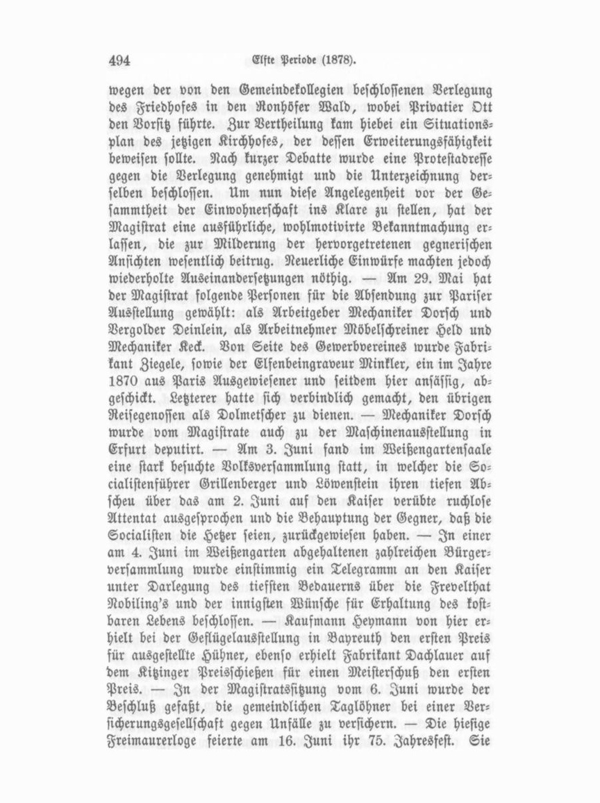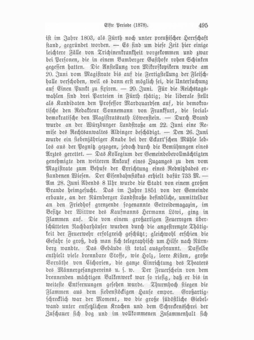 ist im Jahre 1803, als Fürth noch unter preußischer Herrschaft stand, gegründet worden. — Es sind um diese Zeit hier einige leichtere Fälle von Trichinenkrankheit vorgekommen und zwar bei Personen, die in einem Bamberger Gasthofe rohen Schinken gegessen hatten. Die Anstellung von Mikroskopikern wurde am 20. Juni vom Magistrate bis auf die Fertigstellung der Fleisch halle verschoben, weil es dann erst möglich sei, die Untersuchung auf Einen Punkt zu fixiren. — 20. Juni. Für die Reichstags wahlen sind drei Parteien in Fürth thätig; die liberale stellt als Kandidaten den Professor Mardquardsen auf, die demokra tische den Redakteur Sonnemann von Frankfurt, die social demokratische den Magistratsrath Löwenstein. — Durch Brand wurde an der Würzburger Landstraße am 22. Juni eine Re mise des Rechtsanwaltes Aldinger beschädigt. — Den 26. Juni wurde ein siebenjähriger Knabe bei der Eckart'schen Mühle leb los aus der Pegnitz gezogen, jedoch durch die Bemühungen eines Arztes gerettet. — Das Kollegium der Gemeindebevollmächtigten genehmigte den weiteren Ankauf eines Zuganges zu den vom Magistrate zum Behufe der Errichtung eines Rednitzbades er standenen Wiesen. Der Eisenbahnfiskus erhielt dafür 733 M. — Am 28. Juni Abends 8 Uhr wurde die Stadt von einem großen Brande heimgesucht. Das im Jahre 1851 von der Gemeinde erbaute, an der Nürnberger Landstraße befindliche, unmittelbar an den Friedhof grenzende sogenannte Getreidemagazin, im Besitze der Wittwe des Kaufmanns Hermann Löwi, ging in Flammen auf. Die von einem großartigen Feuerregen über schütteten Nachbarhäuser wurden durch die angestrengte Thätig keit der Feuerwehr erfolgreich geschützt; gleichwohl erschien die Gefahr so groß, daß man sich telegraphisch um Hilfe nach Nürn berg wandte. Das Gebäude ist total ausgebrannt. Dasselbe enthielt viele brennbare Stoffe, wie Holz, leere Kisten, große Vorräthe von Cichorien, die ganze Einrichtung des Theaters des Männergesangvereins u. s. w. Der Feuerschein von dem brennenden mächtigen Balkenwerk war so riesig, daß er bis in weiteste Entfernungen gesehen wurde. Thurmhoch stiegen die Flammen aus dem siebenstöckigen Hause empor. Großartig schrecklich war der Moment, wo die große südöstliche Giebel wand unter entsetzlichem Krachen und dem Schreckensschrei der Zuschauer sich bog und im vollkommenen Zusammenhalt sich