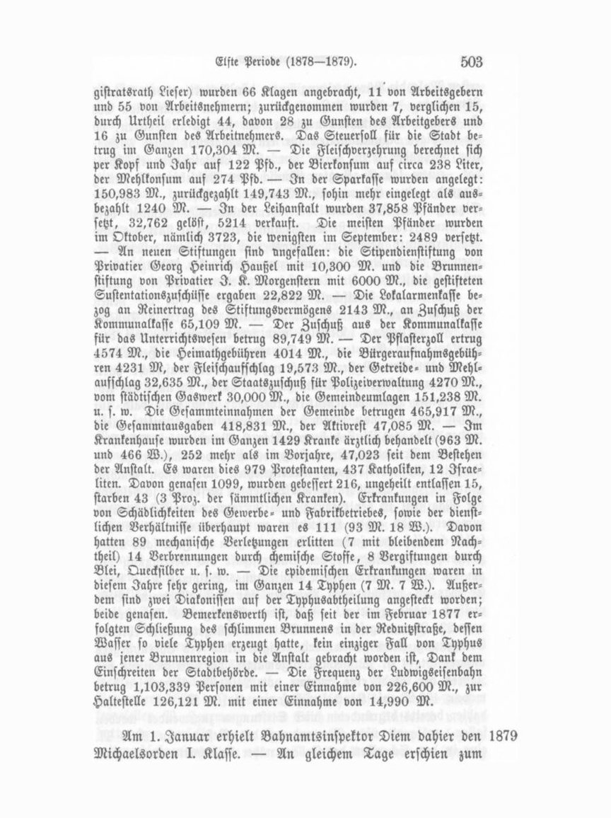 der freiwilligen Feuerwehr unter diesen Umständen entsagen muffe. Letztere veröffentlichte eine Gegenerklärung und rekurrirte an die K. Regierung, jedoch ohne Erfolg. — Mit Schluß der Wahlperiode 1875/78 hatten aus dem Magistratskollegium auszuscheiden: M. Lieser, Privatier, Fr. Waßmuth, Privatier, Gabriel Löwenstein, Bortenmacher, Joh. Phil. Streng, Fabri kant, Konrad Schrank, Spezereihändler, Joh. Jakob Weghorn, Kaufmann. Durch Wahl vom 10. Dezember wurden in den Magistrat berufen: Joh. Jakob Weghorn, Kaufmann, Friedr. Waßmuth, Privatier, Meier Lieser, Privatier, Heinrich Grüner, Brauereibesitzer, Karl Zäh, Fabrikant, Max Karl Königsberger, Kaufmann. Um diese Zeit wurden bereits die Arbeiten zur Her stellung eines Brunnenschachtes für Gewinnung von Wasser für die projektirte Wasserleitung auf einer Wiese im Rednitzthale gegenüber Weikershof betrieben. Die 5pferdige Lokomobile ge nügte nicht und mußte durch eine 10pferdige ersetzt werden. Bezüglich des Magistratsbeschluffes wegen Festsetzung der Baulinie in der Königswarterstraße sah sich die Ludwigseisen bahngesellschaft benachtheiligt und beschwerte sich deshalb bei der K. Regierung, welche sodann zu Gunsten der letzteren ent schied. — Sonnabend den 21. Dezember wurde hier zum ersten Male das beliebte Lustspiel „Dr. Klauß" gegeben. — Am 24. Dez. wurden die bisherigen Armenpflegschaftsräthe wieder gewählt. — Brandbeschädigung erlitt am gleichen Tage das Hofhaus von Fabrikant Benedikt Leber, Theaterstraße Nr. 8.