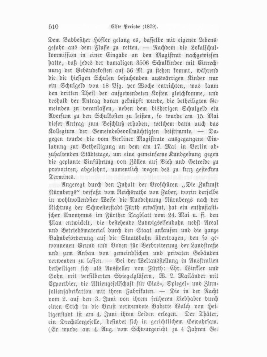 Gemeindekollegiums verlesen. — Am 11. April wurde die vom ornithologischen Vereine veranstaltete zweite deutsche Vogel- und Geflügelausstellung eröffnet, die sich wie im Vorjahre durch Reichhaltigkeit und gutes Arrangement auszeichnete. Besonderes Interesse erregte unter Anderem die Brutmaschine, sowie die mittels derselben ausgebrüteten Jungen. — Wittwe Rosette Nathan übergab dem Magistrate die Summe von 15,OM M. zur Gründung einer Stiftung, welche zum Andenken an ihren am 21. Febr. 1879 verstorbenen Sohn den Namen „Moritz Nathan stiftung" führen soll. An diesem Tage sollen alljährlich die Zinsen des Kapitals an würdige und bedürftige Familienväter ohne Unterschied der Konfession vertheilt, der Rest zu anderen wohlthätigen Zwecken verwendet werden. — Der Magistrat be absichtigt, die Trottoire in Zukunft asphaltiren zu lassen. Die Probe, welche mit einem Asphalttrottoir vor dem Braun'schen Hause in der Königswarterstraße gemacht worden ist, hat all gemein zufriedengestellt. Es hat sich dasselbe zur Sommer- und zur Winterzeit gleichmäßig gut gehalten. — In Betreff der Führung der Amtsanwaltschaft, welche mit Eintritt der Reichs gerichtsverfassung die Gemeinde gegen Erstattung der baaren Auslagen zu übernehmen hat, wurde in der Magistratssitzung vom 17. April auf Antrag des Magistratsrathes Feistmann be schlossen, einen rechtskundigen Funktionär mit einem Gehalte von 2400 M. anzustellen. — Am 24. April fand eine Brand beschädigung an Wohnhaus und Remise der Nürnberger Soda fabrik am Doofer Weg statt. — Bei dem Ersatzgeschäft für den Aushebungsbezirk der Stadt Fürth wurden 519 Militärpflich tige gemustert, wovon 151 für tauglich, 197 für untauglich er klärt, 123 auf ein Jahr zurückgestellt, 17 für die Ersatzreseve, 31 für die zweite Klasse bestimmt wurden. — Das Sommertheater im Weißengarten wurde mit der Operette „Prinz Me thusalem" am 7. Mai eröffnet. — Am 10. Mai löste sich der im Jahre 1857 gegründete israelitische Männergesangverein auf. Aus dem Vermögen des Vereines wurden 2000 M. der Gabriel Rießer'schen Stiftung für arme Studirende zugewandt. Der Verein zur Unterstützung armer Wöchnerinnen erhielt 3M M. Ursache der Auflösung war, daß Niemand Lust hatte, die Vor standschaft zu übernehmen. — Am 12. Mai sahen Passanten der Maxbrücke plötzlich ein Kind in der Rednitz dahertreiben.