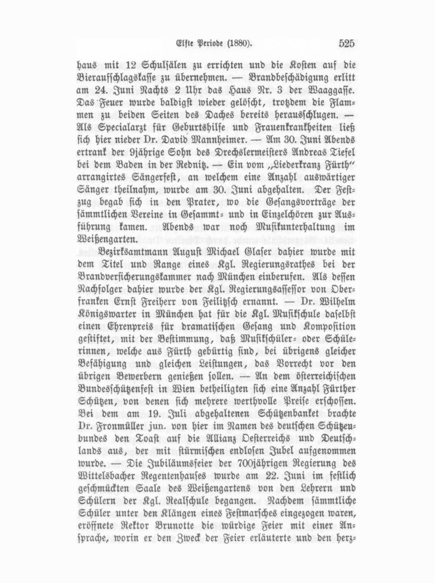 lichen. Wünschen für das fernere Gedeihen des Wittelsbacher Hauses Ausdruck verlieh. Nun folgte die Jubelouverture von Leutner, der sich die Rede des Kgl. Realienlehrers vr. Hutzel mann anschloß, der in begeisterten Worten die Verdienste des Hauses Wittelsbach für Handel und Gewerbe, für Kunst und Wissenschaft, für Erziehung und Bildung schilderte und schließ lich die Schüler zur unauslöschlichen Liebe zum Vaterlande und zum angestammten Herrscherhause, zum jetzigen vielgeliebten Könige aufforderte. Ein Hoch auf den Monarchen schloß die patriotische Rede, welcher der gemeinsame Gesang der bayerischen Nationalhymne folgte. Wechselseitige Deklamationen und Ge sänge beendigten den ersten Theil der Festfeier. Die Fortsetzung derselben zu einem gemeinsamen Spaziergange auf die alte Veste wurde leider durch ein Gewitter etwas gestört. — Auch in der israelit. Bürgerschule wurde durch Direktor vr. Dessau eine er hebende patriotische Feier des Wittelsbacher Festes abgehalten. — Am 24. Juli Morgens fuhren mit dem aus Nürnberg kom menden reich dekorirten Extrazug 61 Turner des hiesigen Turn vereins nach Frankfurt a. M. zu dem allgemeinen deutschen Turnfeste. Der Magistratsbeschluß für Unterbringung der Realschule in dem in der Hirschengasse befindlichen Flügel des Volksschul gebäudes wurde am 27. Juli vom Kollegium der Gemeinde bevollmächtigten genehmigt. — An Stelle des auf Ansuchen definitiv sustentirten Aufschlageinnehmers Christoph Betzold da hier wurde als Steueraufseher an das Kgl. Hauptzollamt Fürth der Malzaufseher Georg Brendel in Würzburg versetzt. — Am 12. August wurde von Ingenieur Thiem über den ersten Theil seiner Vorarbeiten, Untersuchung der Terrainverhältnisse be züglich der Wasserversorgung in der Magistratssitzung Bericht erstattet, welcher dahin lautete, daß im Rednitzthale ein in Betracht zu ziehender selbstständiger Grundwasserstrom nicht vor handen sei. Das vorhandene Grundwasser sei ein Filtrat von Rednitzwasser; so lange der Fluß in seinem gegenwärtigen Zu stande bleibe, seien alle Vorbedingungen für bleibende Filtration gegeben. Beeinflußt werde die Beschaffenheit des Wassers durch Behandlung der umliegenden Wiesen mit Dünger; doch wäre dem abzuhelfen, wenn die betreffenden Wiesen in den Besitz der Stadt gebracht würden. Daran reihte sich der Vorschlag, es
