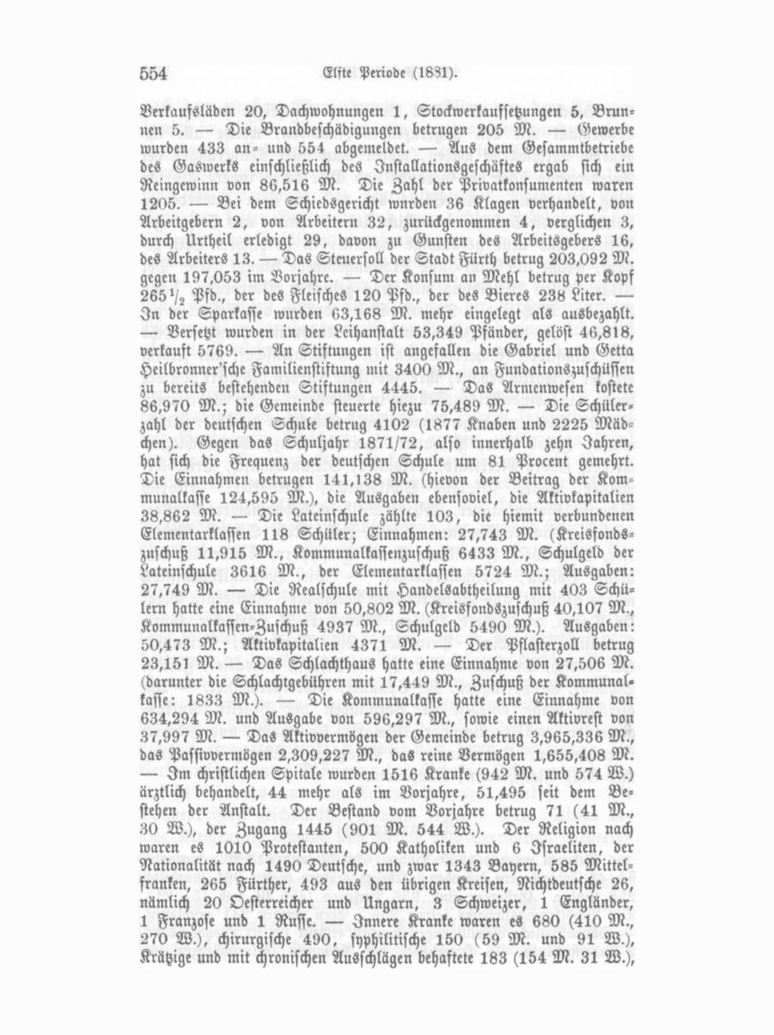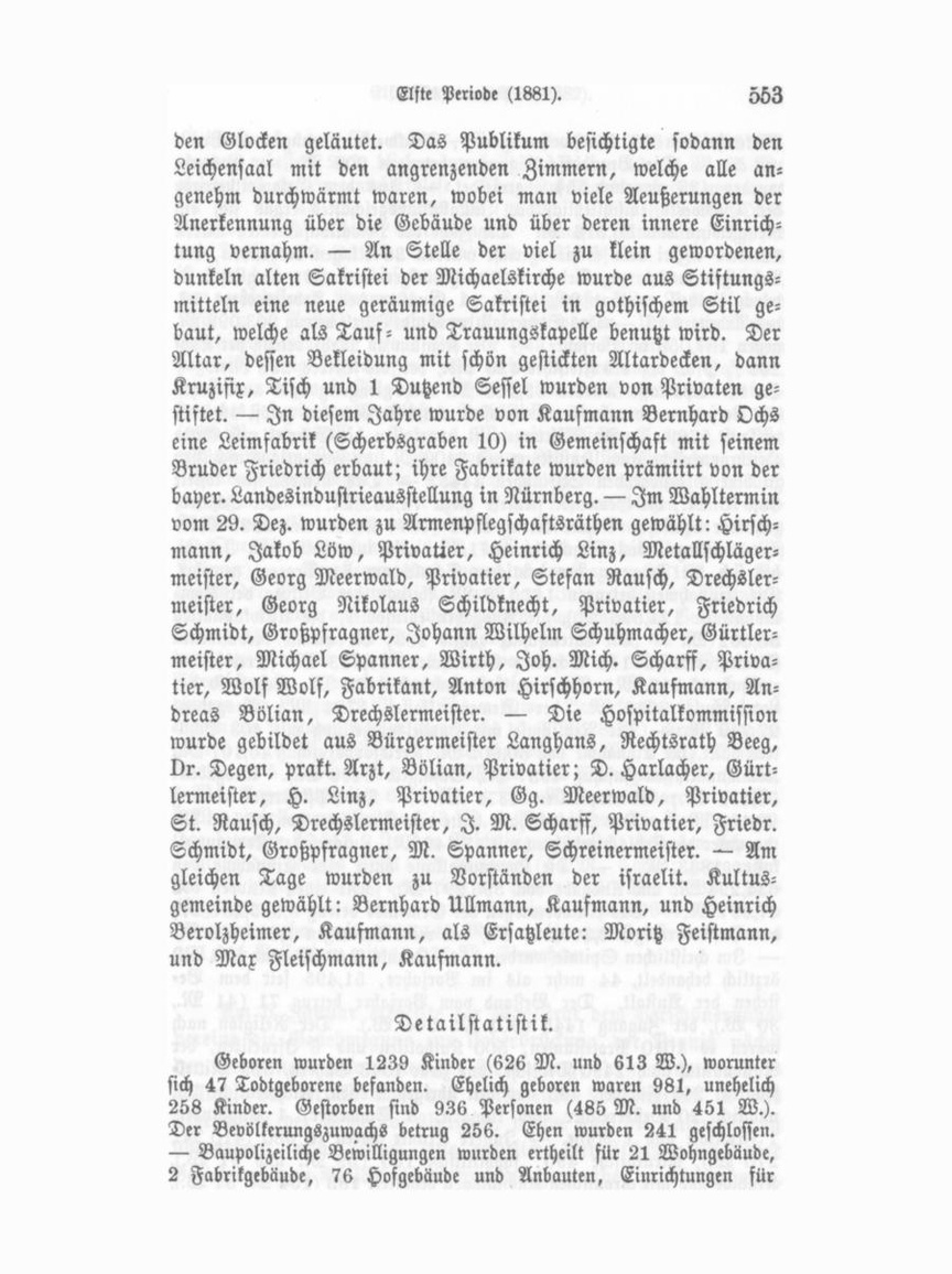 den Glocken geläutet. Das Publikum besichtigte sodann den Leichensaal mit den angrenzenden Zimmern, welche alle an genehm durchwärmt waren, wobei man viele Aeußerungen der Anerkennung über die Gebäude und über deren innere Einrich tung vernahm. — An Stelle der viel zu klein gewordenen, dunkeln alten Sakristei der Michaelskirche wurde aus StiftungsMitteln eine neue geräumige Sakristei in gothischem Stil ge baut, welche als Tauf- und Trauungskapelle benutzt wird. Der Altar, dessen Bekleidung mit schön gestickten Altardecken, dann Kruzifix, Tisch und 1 Dutzend Sessel wurden von Privaten ge stiftet. — In diesem Jahre wurde von Kaufmann Bernhard Ochs eine Leimfabrik (Scherbsgraben 10) in Gemeinschaft mit seinem Bruder Friedrich erbaut; ihre Fabrikate wurden prämiirt von der bayer. Landesindustrieausstellung in Nürnberg. — Im Wahltermin vom 29. Dez. wurden zu Armenpflegschaftsräthen gewählt: Hirsch mann, Jakob Löw, Privatier, Heinrich Linz, Metallschläger meister, Georg Meerwald, Privatier, Stefan Rausch, Drechsler meister, Georg Nikolaus Schildknecht, Privatier, Friedrich Schmidt, Großpfragner, Johann Wilhelm Schuhmacher, Gürtler meister, Michael Spanner, Wirth, Joh. Mich. Scharff, Priva tier, Wolf Wolf, Fabrikant, Anton Hirschhorn, Kaufmann, An dreas Bölian, Drechslermeister. — Die Hospitalkommission wurde gebildet aus Bürgermeister Langhans, Rechtsrath Beeg, vr. Degen, prakt. Arzt, Bölian, Privatier; D. Harlacher, Gürt lermeister, H. Linz, Privatier, Gg. Meerwald, Privatier, St. Rausch, Drechslermeister, I. M. Scharff, Privatier, Friedr. Schmidt, Großpfragner, M. Spanner, Schreinermeister. — Am gleichen Tage wurden zu Vorständen der israelit. Kultusgemeinde gewählt: Bernhard Ullmann, Kaufmann, und Heinrich Berolzheimer, Kaufmann, als Ersatzleute: Moritz Feistmann, und Max Fleischmann, Kaufmann.