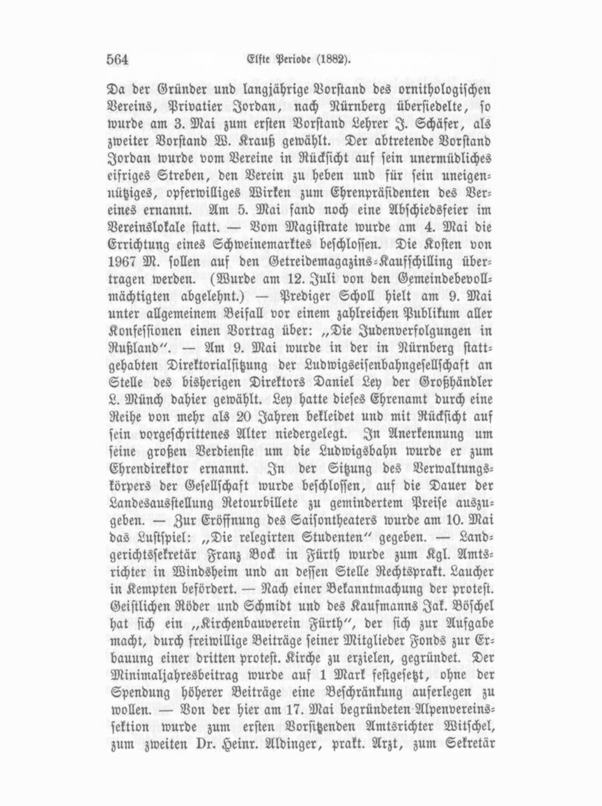 Da der Gründer und langjährige Vorstand des ornithologischen Vereins, Privatier Jordan, nach Nürnberg übersiedelte, so wurde am 3. Mai zum ersten Vorstand Lehrer I. Schäfer, als zweiter Vorstand W. Krauß gewählt. Der abtretende Vorstand Jordan wurde vom Vereine in Rücksicht auf sein unermüdliches eifriges Streben, den Verein zu heben und für sein uneigen nütziges, opferwilliges Wirken zum Ehrenpräsidenten des Ver eines ernannt. Am 5. Mai fand noch eine Abschiedsfeier im Vereinslokale statt. — Vom Magistrate wurde am 4. Mai die Errichtung eines Schweinemarktes beschlossen. Die Kosten von 1967 M. sollen auf den Getreidemagazins-Kaufschilling über tragen werden. (Wurde am 12. Juli von den Gemeindebevoll mächtigten abgelehnt.) — Prediger Scholl hielt am 9. Mai unter allgemeinem Beifall vor einem zahlreichen Publikum aller Konfessionen einen Vortrag über: „Die Judenverfolgungen in Rußland". — Am 9. Mai wurde in der in Nürnberg statt gehabten Direktorialsitzung der Ludwigseisenbahngesellschaft an Stelle des bisherigen Direktors Daniel Ley der Großhändler L. Münch dahier gewählt. Ley hatte dieses Ehrenamt durch eine Reihe von mehr als 20 Jahren bekleidet und mit Rücksicht auf sein vorgeschrittenes Alter niedergelegt. In Anerkennung um seine großen Verdienste um die Ludwigsbahn wurde er zum Ehrendirektor ernannt. In der Sitzung des Verwaltungs körpers der Gesellschaft wurde beschlossen, auf die Dauer der Landesausstellung Retourbillets zu gemindertem Preise auszu geben. — Zur Eröffnung des Saisontheaters wurde am 10. Mai das Lustspiel: „Die relegirten Studenten" gegeben. — Land gerichtssekretär Franz Bock in Fürth wurde zum Kgl. Amts richter in Windsheim und an dessen Stelle Rechtsprakt. Laucher in Kempten befördert. — Nach einer Bekanntmachung der Protest. Geistlichen Röder und Schmidt und des Kaufmanns Jak. Böschel hat sich ein „Kirchenbauverein Fürth", der sich zur Aufgabe macht, durch freiwillige Beiträge seiner Mitglieder Fonds zur Er bauung einer dritten Protest. Kirche zu erzielen, gegründet. Der Minimaljahresbeitrag wurde auf 1 Mark festgesetzt, ohne der Spendung höherer Beiträge eine Beschränkung auferlegen zu wollen. — Von der hier am 17. Mai begründeten Alpenvereins sektion wurde zum ersten Vorsitzenden Amtsrichter Witschel, zum zweiten Dr. Heinr. Aldinger, prakt. Arzt, zum Sekretär