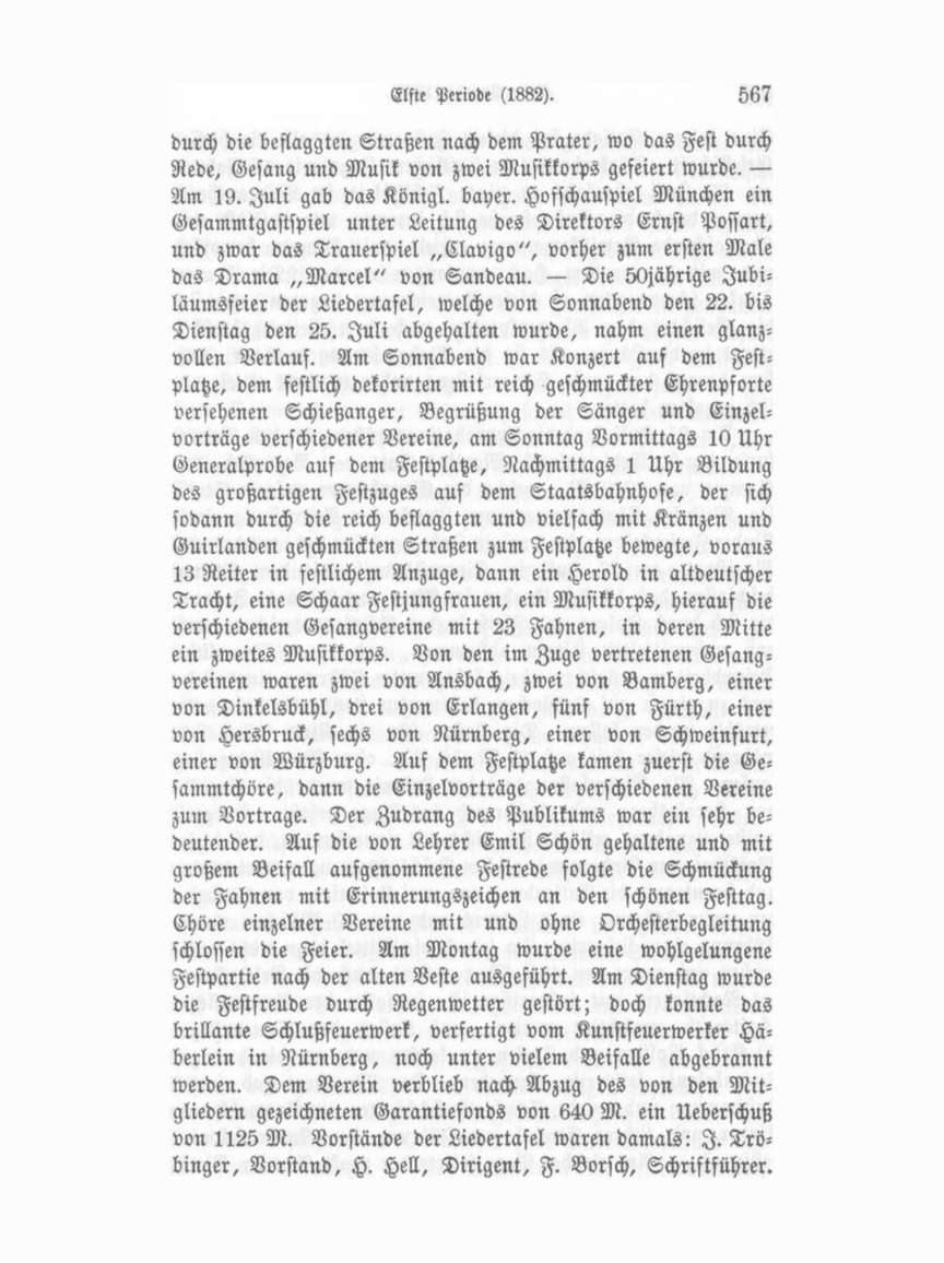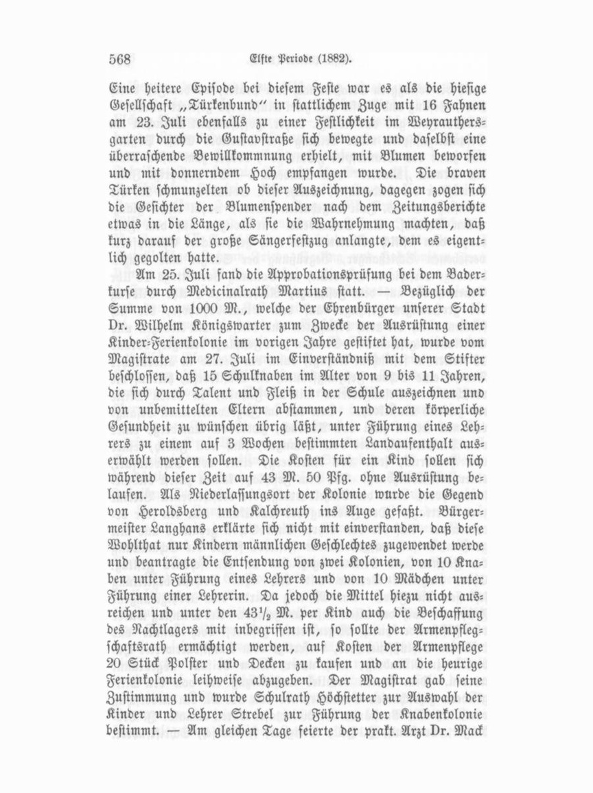 Eine heitere Episode bei diesem Feste war es als die hiesige Gesellschaft „Türkenbund" in stattlichem Zuge mit 16 Fahnen am 23. Juli ebenfalls zu einer Festlichkeit im Weyrauthersgarten durch die Gustavstraße sich bewegte und daselbst eine überraschende Bewillkommnung erhielt, mit Blumen beworfen und mit donnerndem Hoch empfangen wurde. Die braven Türken schmunzelten ob dieser Auszeichnung, dagegen zogen sich die Gesichter der Blumenspender nach dem Zeitungsberichte etwas in die Länge, als sie die Wahrnehmung machten, daß kurz darauf der große Sängerfestzug anlangte, dem es eigent lich gegolten hatte. Am 25. Juli fand die Approbationsprüfung bei dem Bader kurse durch Medicinalrath Martius statt. — Bezüglich der Summe von 1000 M., welche der Ehrenbürger unserer Stadt vr. Wilhelm Königswarter zum Zwecke der Ausrüstung einer Kinder-Ferienkolonie im vorigen Jahre gestiftet hat, wurde vom Magistrate am 27. Juli im Einverständniß mit dem Stifter beschlossen, daß 15 Schulknaben im Alter von 9 bis 11 Jahren, die sich durch Talent und Fleiß in der Schule auszeichnen und von unbemittelten Eltern abstammen, und deren körperliche Gesundheit zu wünschen übrig läßt, unter Führung eines Leh rers zu einem auf 3 Wochen bestimmten Landaufenthalt aus erwählt werden sollen. Die Kosten für ein Kind sollen sich während dieser Zeit auf 43 M. 50 Pfg. ohne Ausrüstung be laufen. Als Niederlassungsort der Kolonie wurde die Gegend von Heroldsberg und Kalchreuth ins Auge gefaßt. Bürger meister Langhans erklärte sich nicht mit einverstanden, daß diese Wohlthat nur Kindern männlichen Geschlechtes zugewendet werde und beantragte die Entsendung von zwei Kolonien, von 10 Kna ben unter Führung eines Lehrers und von 10 Mädchen unter Führung einer Lehrerin. Da jedoch die Mittel hiezu nicht aus reichen und unter den 43'/- M. per Kind auch die Beschaffung des Nachtlagers mit inbegriffen ist, so sollte der Armenpfleg schaftsrath ermächtigt werden, auf Kosten der Armenpflege 20 Stück Polster und Decken zu kaufen und an die heurige Ferienkolonie leihweise abzugeben. Der Magistrat gab seine Zustimmung und wurde Schulrath Höchstetter zur Auswahl der Kinder und Lehrer Strebel zur Führung der Knabenkolonie bestimmt. — Am gleichen Tage feierte der prakt. Arzt vr. Mack