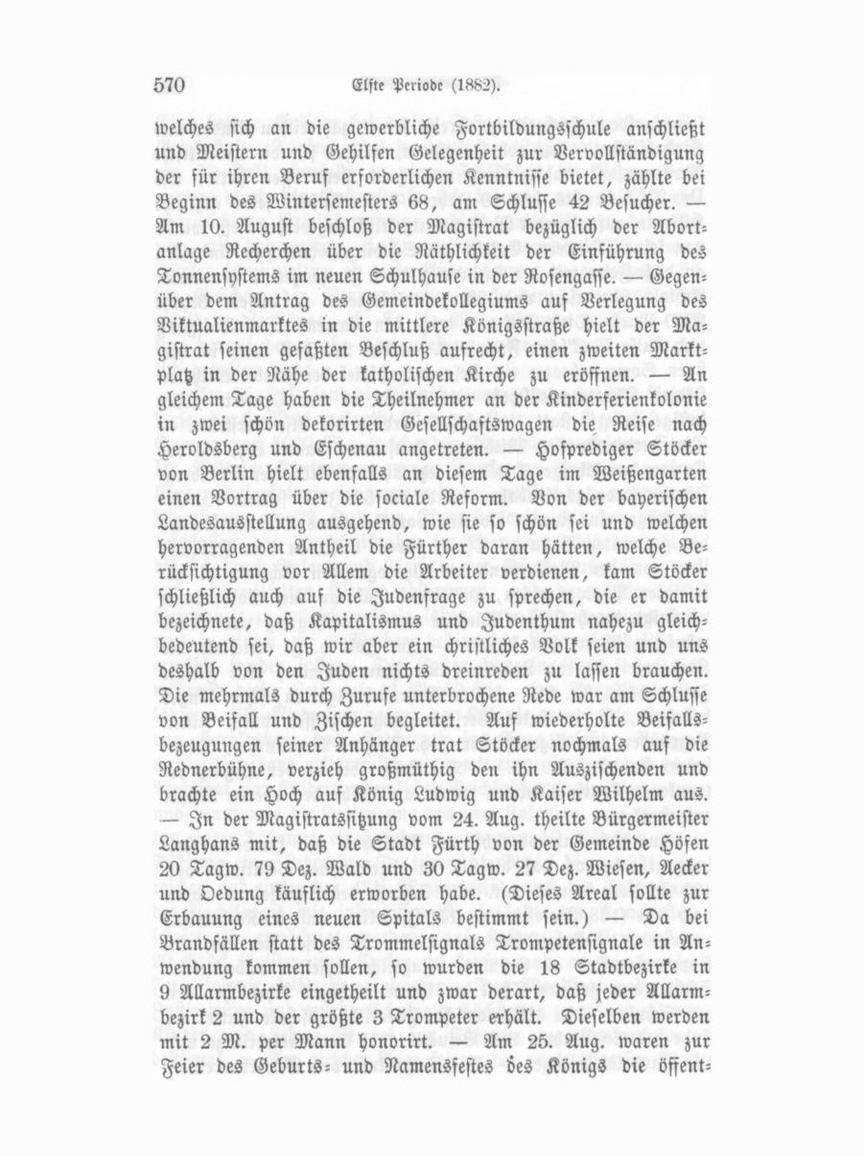 welches sich an die gewerbliche Fortbildungsschule anschließt und Meistern und Gehilfen Gelegenheit zur Vervollständigung der für ihren Berns erforderlichen Kenntnisse bietet, zählte bei Beginn des Wintersemesters 68, am Schlüsse 42 Besucher. — Am 10. August beschloß der Magistrat bezüglich der Abort anlage Recherchen über die Räthlichkeit der Einführung des Tonnensystems im neuen Schulhause in der Rosengasse. — Gegen über dem Antrag des Gemeindekollegiums auf Verlegung des Viktualienmarktes in die mittlere Königsstraße hielt der Ma gistrat seinen gefaßten Beschluß aufrecht, einen zweiten Markt platz in der Nähe der katholischen Kirche zu eröffnen. — An gleichem Tage haben die Theilnehmer an der Kinderferienkolonie in zwei schön dekorirten Gesellschaftswagen die Reise nach Heroldsberg und Eschenau angetreten. — Hofprediger Stöcker von Berlin hielt ebenfalls an diesem Tage im Weißengarten einen Vortrag über die sociale Reform. Von der bayerischen Landesausstellung ausgehend, wie sie so schön sei und welchen hervorragenden Antheil die Fürther daran hätten, welche Be rücksichtigung vor Allem die Arbeiter verdienen, kam Stöcker schließlich auch auf die Judenfrage zu sprechen, die er damit bezeichnete, daß Kapitalismus und Judenthum nahezu gleich bedeutend sei, daß wir aber ein christliches Volk seien und uns deshalb von den Juden nichts dreinreden zu lasten brauchen. Die mehrmals durch Zurufe unterbrochene Rede war am Schluffe von Beifall und Zischen begleitet. Auf wiederholte Beifalls bezeugungen seiner Anhänger trat Stöcker nochmals auf die