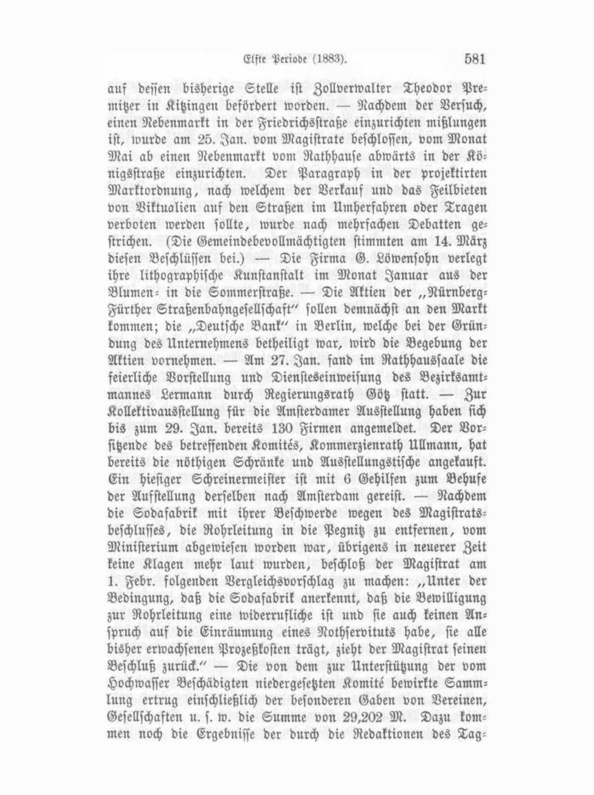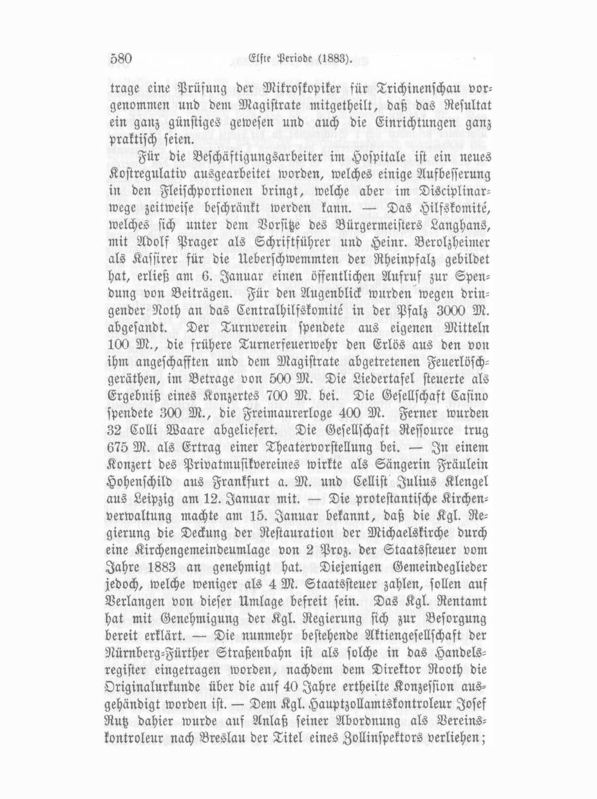 trage eine Prüfung der Mikroskopier für Trichinenschau vor genommen und dem Magistrate mitgetheilt, daß das Resultat ein ganz günstiges gewesen und auch die Einrichtungen ganz praktisch seien. Für die Beschäftigungsarbeiter im Hospitale ist ein neues Kostregulativ ausgearbeitet worden, welches einige Aufbesserung in den Fleischportionen bringt, welche aber im Disciplinar wege zeitweise beschränkt werden kann. — Das Hilfskomite, welches sich unter dem Vorsitze des Bürgermeisters Langhans, mit Adolf Prager als Schriftführer und Heinr. Berolzheimer als Kassirer für die Ueberschwemmten der Rheinpfalz gebildet hat, erließ am 6. Januar einen öffentlichen Aufruf zur Spen dung von Beiträgen. Für den Augenblick wurden wegen drin gender Noth an das Centralhilfskomite in der Pfalz 3000 M. abgesandt. Der Turnverein spendete aus eigenen Mitteln 100 M., die frühere Turnerfeuerwehr den Erlös aus den von ihm angeschafften und dem Magistrate abgetretenen Feuerlöschgeräthen, im Betrage von 500 M. Die Liedertafel steuerte als Ergebniß eines Konzertes 700 M. bei. Die Gesellschaft Casino spendete 300 M., die Freimaurerloge 400 M. Ferner wurden 32 Colli Waare abgeliefert. Die Gesellschaft Ressource trug 675 M. als Ertrag einer Theatervorstellung bei. — In einem Konzert des Privatmusikvereines wirkte als Sängerin Fräulein Hohenschild aus Frankfurt a. M. und Cellist Julius Klengel aus Leipzig am 12. Januar mit. — Die protestantische Kirchen verwaltung machte am 15. Januar bekannt, daß die Kgl. Re gierung die Deckung der Restauration der Michaelskirche durch eine Kirchengemeindeumlage von 2 Proz. der Staatssteuer vom Jahre 1883 an genehmigt hat. Diejenigen Gemeindeglieder jedoch, welche weniger als 4 M. Staatssteuer zahlen, sollen auf Verlangen von dieser Umlage befreit sein. Das Kgl. Rentamt hat mit Genehmigung der Kgl. Regierung sich zur Besorgung bereit erklärt. — Die nunmehr bestehende Aktiengesellschaft der Nürnberg-Fürther Straßenbahn ist als solche in das Handels register eingetragen worden, nachdem dem Direktor Rooth die Originalurkunde über die auf 40 Jahre ertheilte Konzession aus gehändigt worden ist. — Dem Kgl. Hauptzollamtskontroleur Josef Rutz dahier wurde auf Anlaß seiner Abordnung als Vereinskontroleur nach Breslau der Titel eines Zollinspektors verliehen;