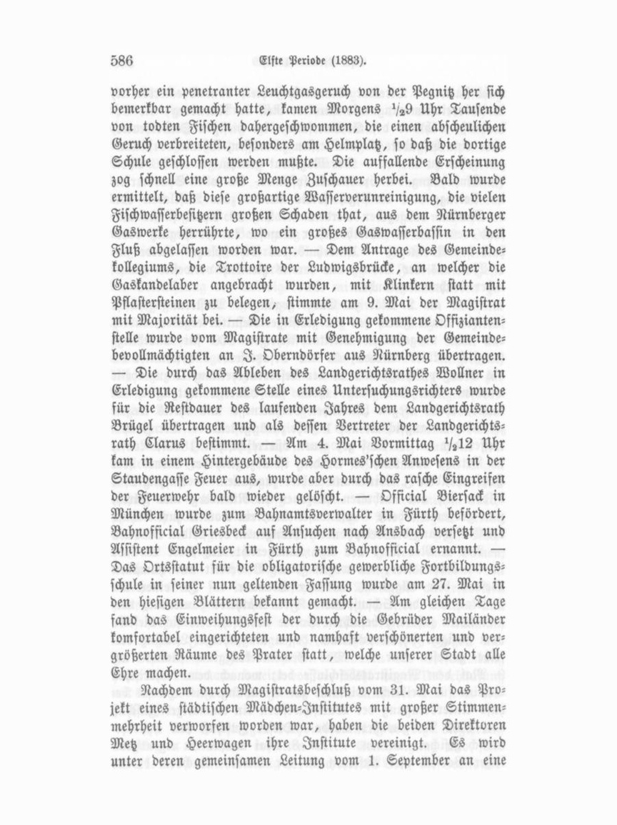 nach Jahreskursen geordnete höhere Töchterschule geschaffen. — Mehrere Mitglieder einer hiesigen Familie sind am 31. Mai plötzlich unter Vergiftungszufällen erkrankt, durch rasche ärzt liche Hilfe jedoch bald wieder hergestellt worden. Dem Ver nehmen nach soll der Genuß von Milch, die in einem nicht grünspanfreien Gefäße gekocht worden war, die Veranlassung gewesen sein. — G. W. Leonh. Borsch, früher Polizeiofficiant, wird seit Juni 1883 Verwalter der Mailänder'schen Brauerei. — Am 1. Juni eröffnete der Jugenderziehungsverein unter Leitung des Rechtsanwalts Dr. Schmidt seine Erziehungsanstalt, zu welcher der Magistrat ein mit Spielplatz versehenes Lokal dem Vereine unentgeltlich zur Verfügung gestellt hat. Als Erzieher in der Anstalt sind drei Lehrer der Volksschule thätig; 61 Kna ben frequentiren die Anstalt. — Der Verlagsbuchhandlung von Friedr. Eßmann, welcher kürzlich eine Schrift, „Die französische Invasion in Franken im Jahre 1796" von Dr. Christian Hutzel mann, Kgl. Reallehrer dahier, zur Ausgabe brachte, ist aus dem Sekretariat Sr. Majestät des Königs folgendes Schreiben zugegangen: „Ew. Wohlgeboren theile ich im Allerhöchstem Auftrage mit, daß Se. Majestät der König die in Ihrem Ver lage erschienene Schrift über die französische Invasion in Franken im Jahre 1796 von Dr. Christian Hutzelmann huldvoll ent gegenzunehmen geruhten und dem Verlage mit bestem Dank erwidern lassen. Hochachtungsvoll Landgerichtsrath Schneider, Berg, den 8. Juni 1883." — Im Saale des grünen Baumes fand am 12. Juni eine von nahezu 300 Schreinergehilfen be suchte Versammlung statt, in welcher Schubart von Nürnberg über die dortige Lohnbewegung referirte und um eventuelle Unterstützung die hiesigen Bundesgenossen bat. Es handelte sich um Verkürzung der Arbeitszeit und Lohnaufbesserung. Die hiesigen Berufsgenossen gaben die Versicherung, daß die Nürn berger im Nothfalle auf ihre Sympathie und Unterstützung rechnen könnten. — Die aus der letzten Schenkung des Ehren bürgers unserer Stadt vr. Königswarter disponiblen 200 M. wurden am 14. Juni vom Magistrate dem Grundstock der „Königswarterstiftung für humanitäre und gemeinnützige Zwecke" einverleibt. — In einer zweiten Versammlung der hiesigen Schreinergesellen vom 20. Juni wurde von den Nürnberger Arbeitsgenoffen berichtet, daß, da die Unterhandlungen mit den