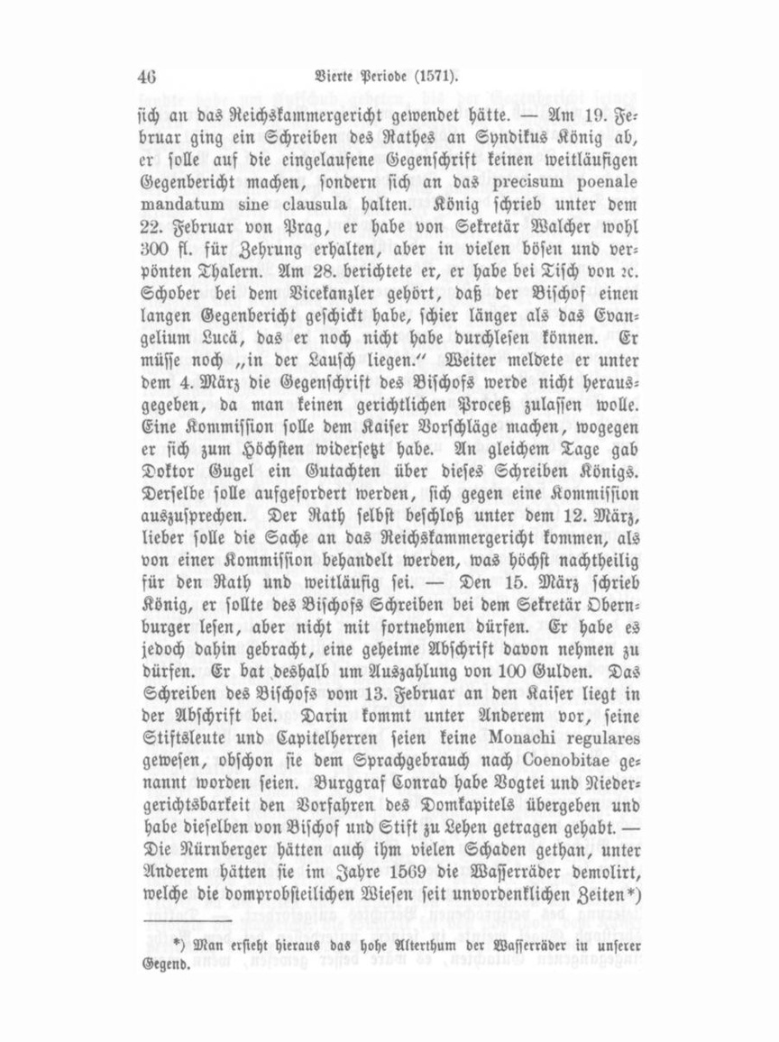 und über 70 bis 80 lange Jahre gehabt, zu Roß; und zu Fuß einfallend unter dem Vorgeben, daß der Fluß in Nürnberg dadurch geschwellt werde. Sie hätten auch Band und Eisen aus dem Domprobsteiamt weggesührt. Endlich meldete er noch mehrere Uebelthaten der Nürnberger. — Am 29. März schrieb Syndikus König, er wolle den Kaiser selbst nochmals anlaufen und ansprechen. Der Deutschmeister und Jörg Ludwig von Sainsheim sollten Kommissäre sein. Am 5. April berichtete er, daß er den Kaiser nochmals angesprochen habe; derselbe habe die Beitreibung des Restitutionsmandats befohlen; am 10., der Kaiser habe decidirt, daß der Bischof pariren müsse. Der Kaiserliche Postmeister habe auf Befehl der Reichskanzlei einen eigenen Kammerboten, Valentin Wolf, mit dem Kaiserl. Original schreiben abfertigen müssen. Den Boten müsse Nürnberg bezahlen. Dagegen werde er um so rühriger sein; der Bote müsse von Bamberg nach Nürnberg reisen. Er sei beauftragt, eine Rekognition des erhaltenen Befehls mitzubringen. Eine Abschrift des Kaiserl. Mandats mit ernstlicher Strafandrohung, die Restitution des Bandes vorzunehmen, lag bei, ebenso eine Abschrift des Schreibens an den Kaiser, worin Syndikus König die Handhabung des Kaiserlichen Pönal-Mandates ohne weiteres Eingehen auf die bischöflichen Einwendungen beanspruchte. Es folgt nun eine Instruktion an den AmtSknecht in Fürth, welche am 20. April vom Rathe genehmigt wurde. Vor der Uebergabe soll er erst an den Rath berichten. Er solle sich die Eisen nicht in das Haus werfen lassen, sie auch nicht selbst holen. — Nach dem am 16. Mai der Termin verflossen war und Bamberg nicht parirt hatte, so beschloß der Rath, die beiden Herren Doktoren Nützel (Konsulenten) zu befragen, was nun zu thun sei. — Da kam endlich von Prag ein von Kaiser Maximilian eigenhändig unterzeichnetes Schreiben an den Rath von Nürnberg, worin er ihm anzeigte, „der Bischof habe zu gehorchen versprochen; doch habe er gebeten, daß wir gnädiglich zufrieden sein sollten, wenn er die Restitution durch Georg Ludwig von Sainsheim zu Hohenkottenheim vollziehen ließe." Er habe dies genehmigt und zweifle nicht, daß Nürnberg sich dabei beruhigen werde. „Gegeben auf Unserm Königlichen Schloß zu Prag den 14. Mai 1571.“ Außen mit dem großen Kaiserlichen Siegel. — Hierauf Nathsbeschluß am 29. Mai: über die Annehmbarkeit des Kaiser-