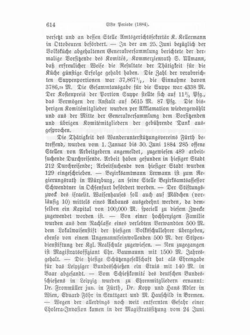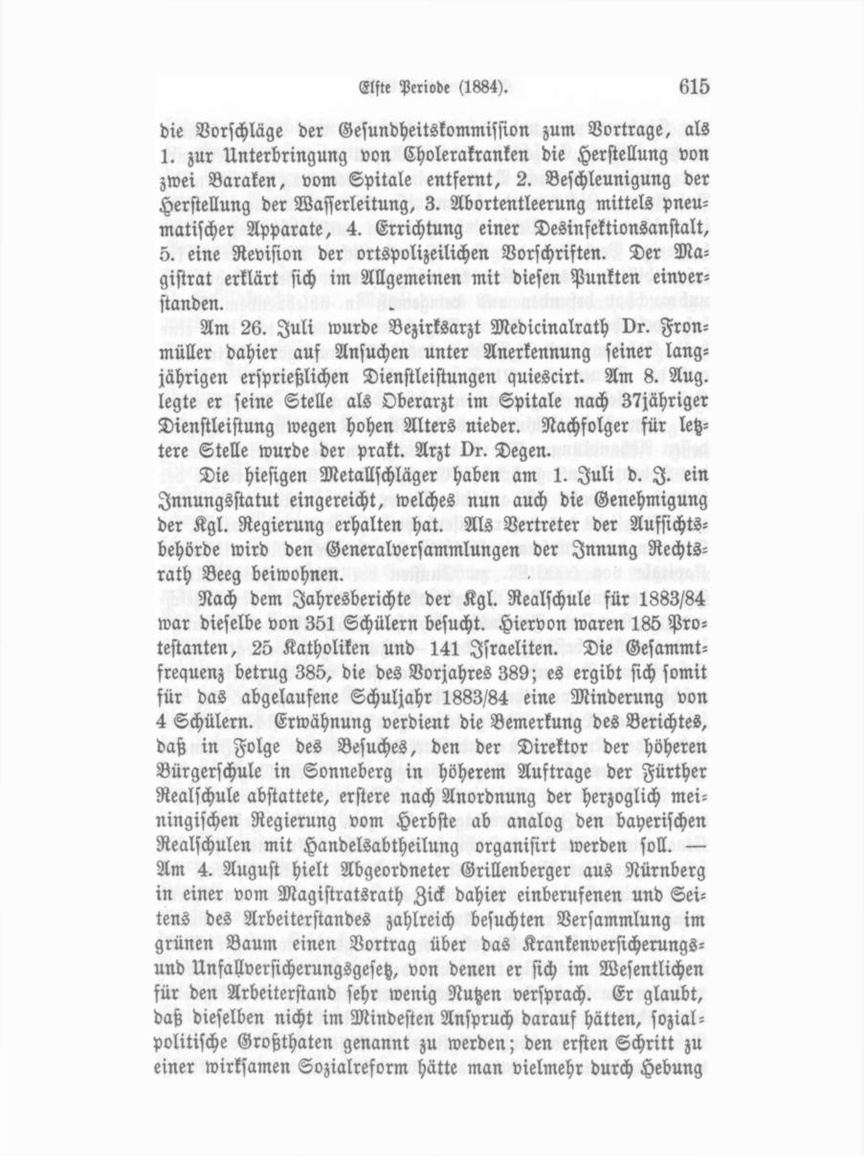 die Vorschläge der Gesundheitskommission zum Vortrage, als 1. zur Unterbringung von Cholerakranken die Herstellung von zwei Baraken, vom Spitale entfernt, 2. Beschleunigung der Herstellung der Wasserleitung, 3. Abortentleerung mittels pneu matischer Apparate, 4. Errichtung einer Desinfektionsanstalt, 5. eine Revision der ortspolizeilichen Vorschriften. Der Ma gistrat erklärt sich im Allgemeinen mit diesen Punkten einver standen. Am 26. Juli wurde Bezirksarzt Medicinalrath Dr. Fron müller dahier auf Ansuchen unter Anerkennung seiner lang jährigen ersprießlichen Dienstleistungen quiescirt. Am 8. Aug. legte er seine Stelle als Oberarzt im Spitale nach 37jähriger Dienstleistung wegen hohen Alters nieder. Nachfolger für letz tere Stelle wurde der prakt. Arzt Dr. Degen. Die hiesigen Metallschläger haben am 1. Juli d. I. ein Jnnungsstatut eingereicht, welches nun auch die Genehmigung der Kgl. Regierung erhalten hat. Als Vertreter der Aufsichts behörde wird den Generalversammlungen der Innung Rechts rath Beeg beiwohnen. Nach dem Jahresberichte der Kgl. Realschule für 1883/84 war dieselbe von 351 Schülern besucht. Hiervon waren 185 Pro testanten, 25 Katholiken und 141 Israeliten. Die Gesammtfrequenz betrug 385, die des Vorjahres 389; es ergibt sich somit für das abgelaufene Schuljahr 1883/84 eine Minderung von 4 Schülern. Erwähnung verdient die Bemerkung des Berichtes, daß in Folge des Besuches, den der Direktor der höheren Bürgerschule in Sonneberg in höherem Auftrage der Fürther Realschule abstattete, erstere nach Anordnung der herzoglich meiningischen Regierung vom Herbste ab analog den bayerischen Realschulen mit Handelsabtheilung organisirt werden soll. — Am 4. August hielt Abgeordneter Grillenberger aus Nürnberg in einer vom Magistratsrath Zick dahier einberufenen und Sei tens des Arbeiterstandes zahlreich besuchten Versammlung im grünen Baum einen Vortrag über das Krankenversicherungs und Unfallversicherungsgesetz, von denen er sich im Wesentlichen für den Arbeiterstand sehr wenig Nutzen versprach. Er glaubt, daß dieselben nicht im Mindesten Anspruch darauf hätten, sozial politische Großthaten genannt zu werden; den ersten Schritt zu einer wirksamen Sozialreform hätte man vielmehr durch Hebung