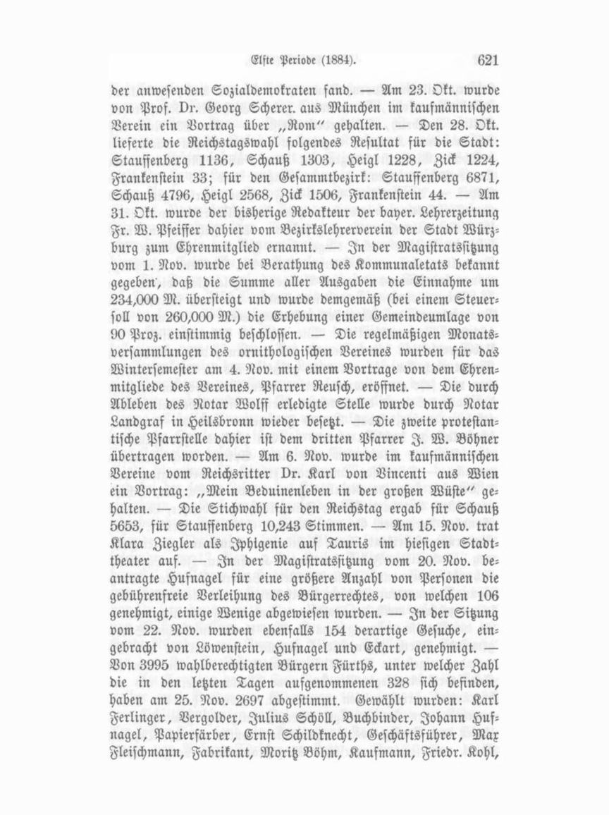 der anwesenden Sozialdemokraten fand. — Am 23. Okt. wurde von Prof. Dr. Georg Scherer, aus München im kaufmännischen Verein ein Vortrag über „Rom" gehalten. — Den 28. Okt. lieferte die Reichstagswahl folgendes Resultat für die Stadt: Stauffenberg 1136, Schauß 1303, Heigl 1228, Zick 1224, Frankenstein 33; für den Gesammtbezirk: Stauffenberg 6871, Schauß 4796, Heigl 2568, Zick 1506, Frankenstein 44. — Am 31. Okt. wuroe der bisherige Redakteur der bayer. Lehrerzeitung Fr. W. Pfeiffer dahier vom Bezirkslehrerverein der Stadt Würz burg zum Ehrenmitglied ernannt. — In der Magistratssitzung vom 1. Nov. wurde bei Berathung des Kommunaletats bekannt gegeben, daß die Summe aller Ausgaben die Einnahme um 234,000 M. übersteigt und wurde demgemäß (bei einem Steuer soll von 260,000 M.) die Erhebung einer Gemeindeumlage von 90 Proz. einstimmig beschlossen. — Die regelmäßigen Monats versammlungen des ornithologischen Vereines wurden für das Wintersemester am 4. Nov. mit einem Vortrage von dem Ehrenmitgliede des Vereines, Pfarrer Reusch, eröffnet. — Die durch Ableben des Notar Wolff erledigte Stelle wurde durch Notar Landgraf in Heilsbronn wieder besetzt. — Die zweite protestan tische Pfarrstelle dahier ist dem dritten Pfarrer I. W. Böhner übertragen worden. — Am 6. Nov. wurde im kaufmännischen Vereine vom Reichsritter vr. Karl von Vincenti aus Wien ein Vortrag: „Mein Beduinenleben in der großen Wüste" ge halten. — Die Stichwahl für den Reichstag ergab für Schauß 5653, für Stauffenberg 10,243 Stimmen. — Am 15. Nov. trat Klara Ziegler als Iphigenie auf Tauris im hiesigen Stadt theater auf. — In der Magistratssitzung vom 20. Nov. be antragte Hufnagel für eine größere Anzahl von Personen die gebührenfreie Verleihung des Bürgerrechtes, von welchen 106 genehmigt, einige Wenige abgewiesen wurden. — In der Sitzung vom 22. Nov. wurden ebenfalls 154 derartige Gesuche, ein gebracht von Löwenstein, Hufnagel und Eckart, genehmigt. — Von 3995 wahlberechtigten Bürgern Fürths, unter welcher Zahl die in den letzten Tagen aufgenommenen 328 sich befinden, haben am 25. Nov. 2697 abgestimmt. Gewählt wurden: Karl Ferlinger, Vergolder, Julius Schöll, Buchbinder, Johann Huf nagel, Papierfärber, Ernst Schildknecht, Geschäftsführer, Max Fleischmann, Fabrikant, Moritz Böhm, Kaufmann, Friedr. Kohl,