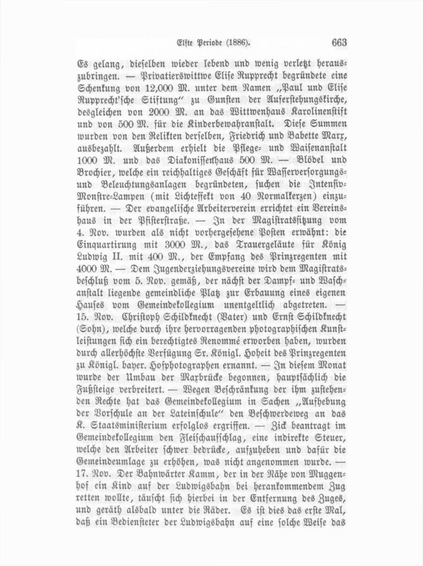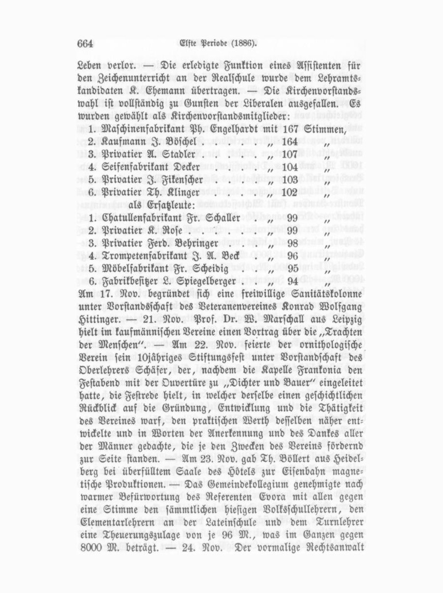 Leben verlor. — Die erledigte Funktion eines Assistenten für den Zeichenunterricht an der Realschule wurde dem Lehramts kandidaten K. Ehemann übertragen. — Die Kirchenvorstands wahl ist vollständig zu Gunsten der Liberalen ausgefallen. Es wurden gewählt als Kirchenvorstandsmitglieder: 1. Maschinenfabrikant PH. Engelhardt mit 167 Stimmen, 2. Kaufmann I. Büschel...................... 164 // 3. Privatier A. Stadler...................... 107 .... // 104 4. Seifenfabrikant Decker 5. Privatier I. Fikenscher .... 103 ,, .... 6. Privatier Th. Klinger 102 // als Ersatzleute: Chatullenfabrikant Fr. Schaller . // 1. 99 2. Privatier K. Rose ...... 99 ,/ 3. Privatier Ferd. Behringer . . . 98 // 96 4. Trompetenfabrikant I. A. Beck // . . 95 5. Möbelfabrikant Fr. Scheidig // 6. Fabrikbesitzer L. Spiegelberger . . ,/ 94 // Am 17. Nov. begründet sich eine freiwillige Sanitätskolonne unter Vorstandsschaft des Veteranenvereines Konrad Wolfgang Hittinger. — 21. Nov. Prof. Dr. W. Marschall aus Leipzig hielt im kaufmännischen Vereine einen Vortrag über die „Trachten der Menschen". — Am 22. Nov. feierte der ornithologische Verein sein lOjähriges Stiftungsfest unter Vorstandschaft des Oberlehrers Schäfer, der, nachdem die Kapelle Frankonia den Festabend mit der Ouvertüre zu „Dichter und Bauer" eingeleitet hatte, die Festrede hielt, in welcher derselbe einen geschichtlichen Rückblick auf die Gründung, Entwicklung und die Thätigkeit des Vereines warf, den praktischen Werth desselben näher ent wickelte und in Worten der Anerkennung und des Dankes aller der Männer gedachte, die je den Zwecken des Vereins fördernd zur Seite standen. — Am 23. Nov. gab Th. Böllert aus Heidel berg bei überfülltem Saale des Hötels zur Eisenbahn magne tische Produktionen. — Das Gemeindekollegium genehmigte nach warmer Befürwortung des Referenten Evora mit allen gegen eine Stimme den sämmtlichen hiesigen Volksschullehrern, den Elementarlehrern an der Lateinschule und dem Turnlehrer eine Theuerungszulage von je 96 M., was im Ganzen gegen 8000 M. beträgt. — 24. Nov. Der vormalige Rechtsanwalt